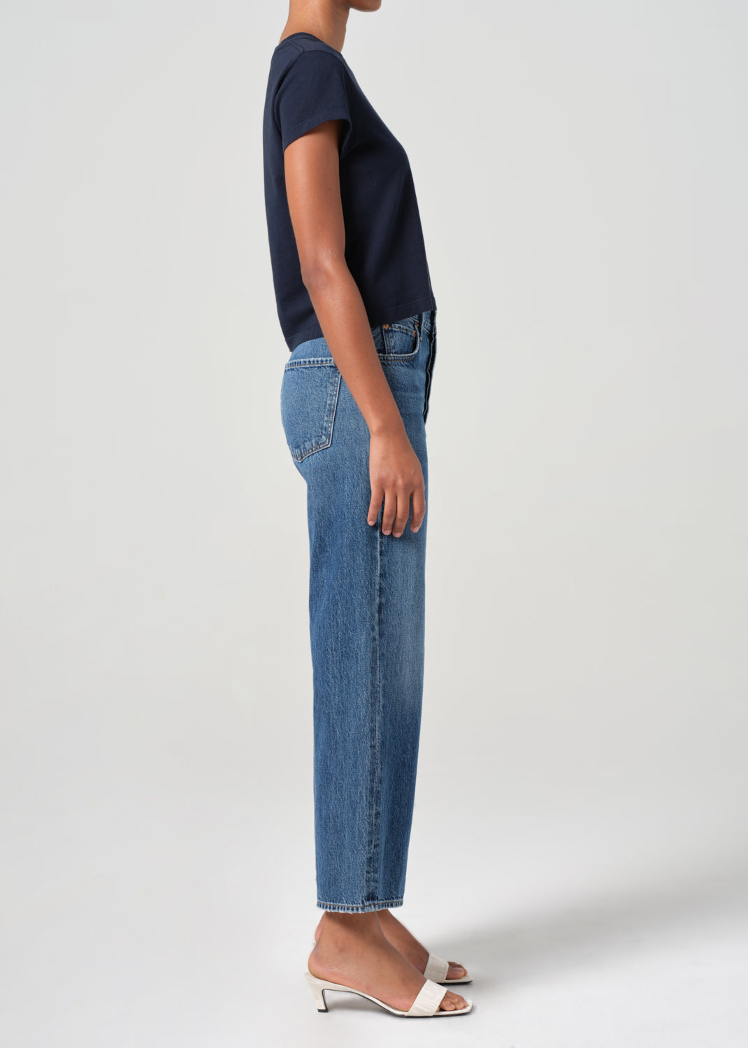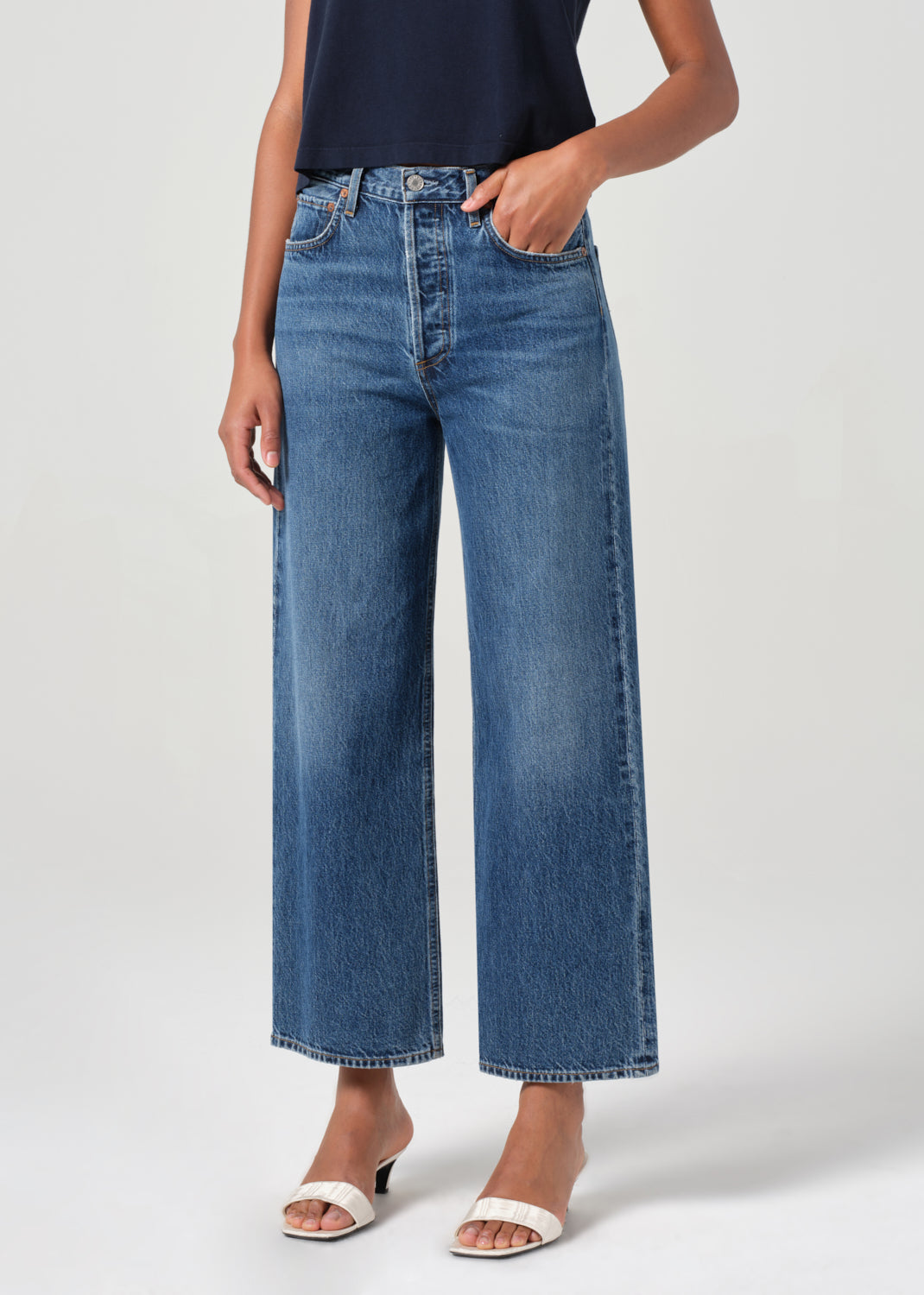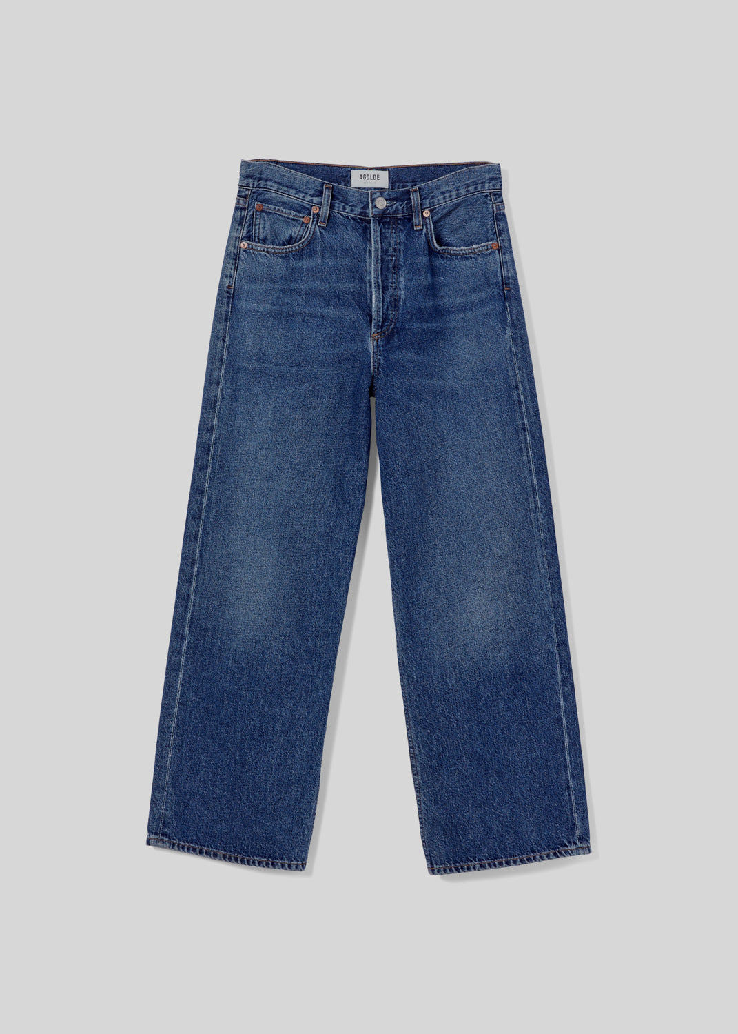 AGOLDE's Ren jeans from the Weightless Collection offer the perfect blend of comfort and style. Made from regenerative cotton, they feature a high-rise waist and cropped wide legs for a relaxed yet flattering silhouette. The lightweight fabric ensures all-day comfort, making them ideal for casual wear. Pair them with a half-tucked tee for a cool, effortless look.