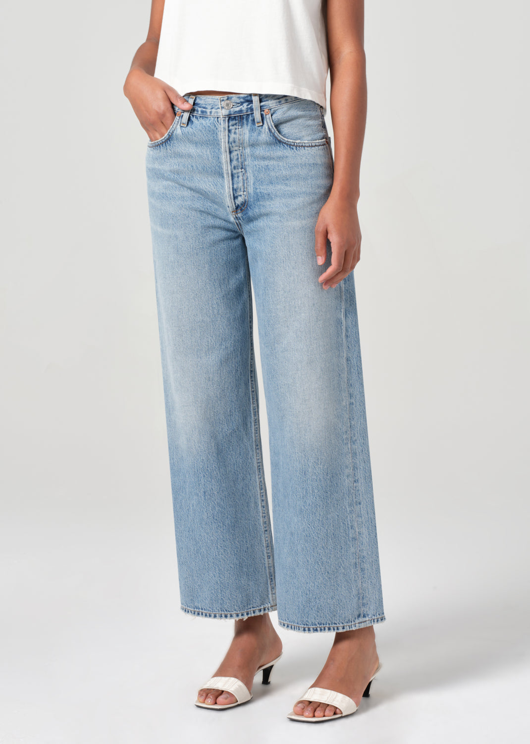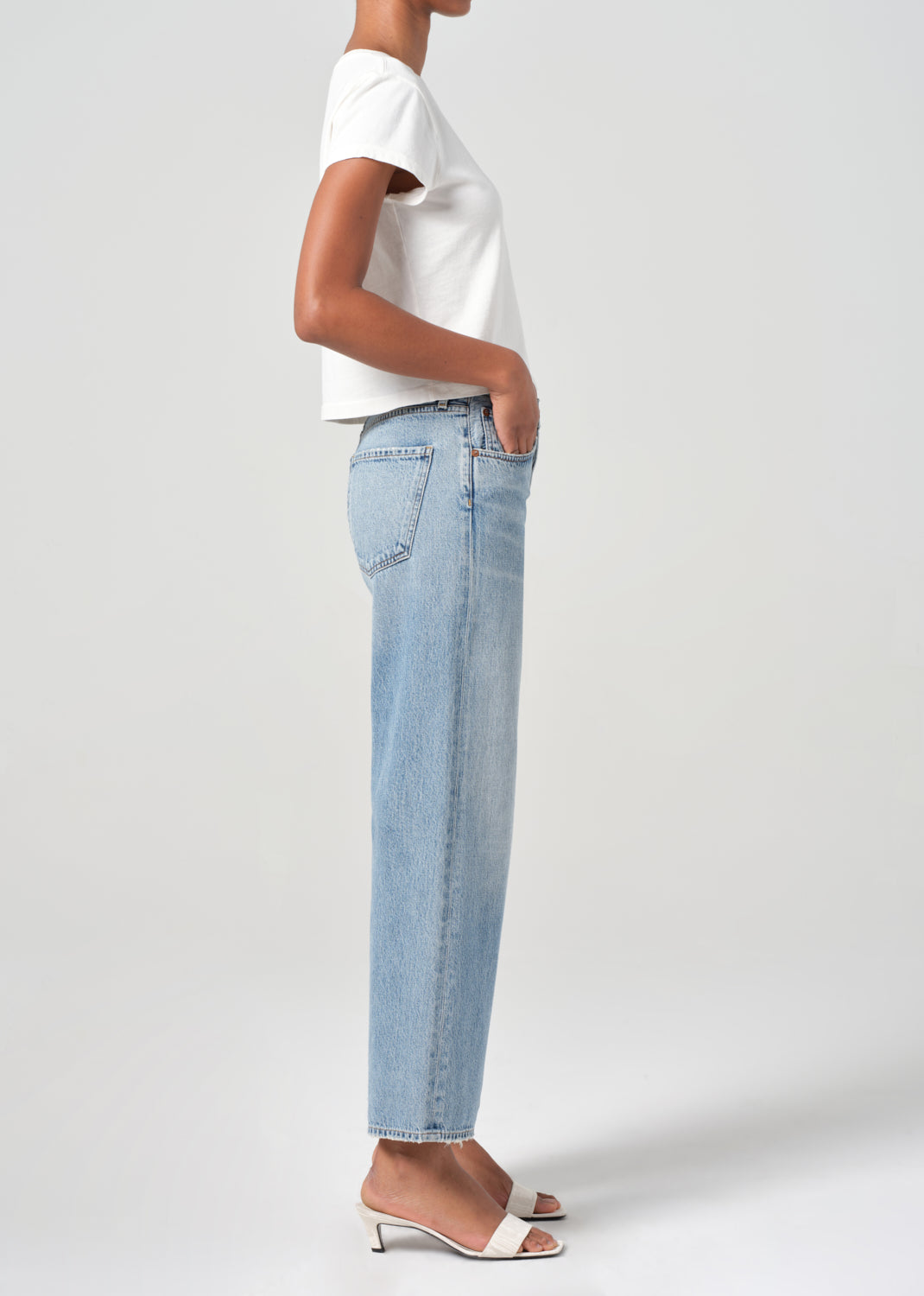 AGOLDE's Ren jeans from the Weightless Collection offer the perfect blend of comfort and style. Made from 100% cotton, they feature a high-rise waist and cropped wide legs for a relaxed yet flattering silhouette. The lightweight fabric ensures all-day comfort, making them ideal for casual wear. Pair them with a half-tucked tee for a cool, effortless look.