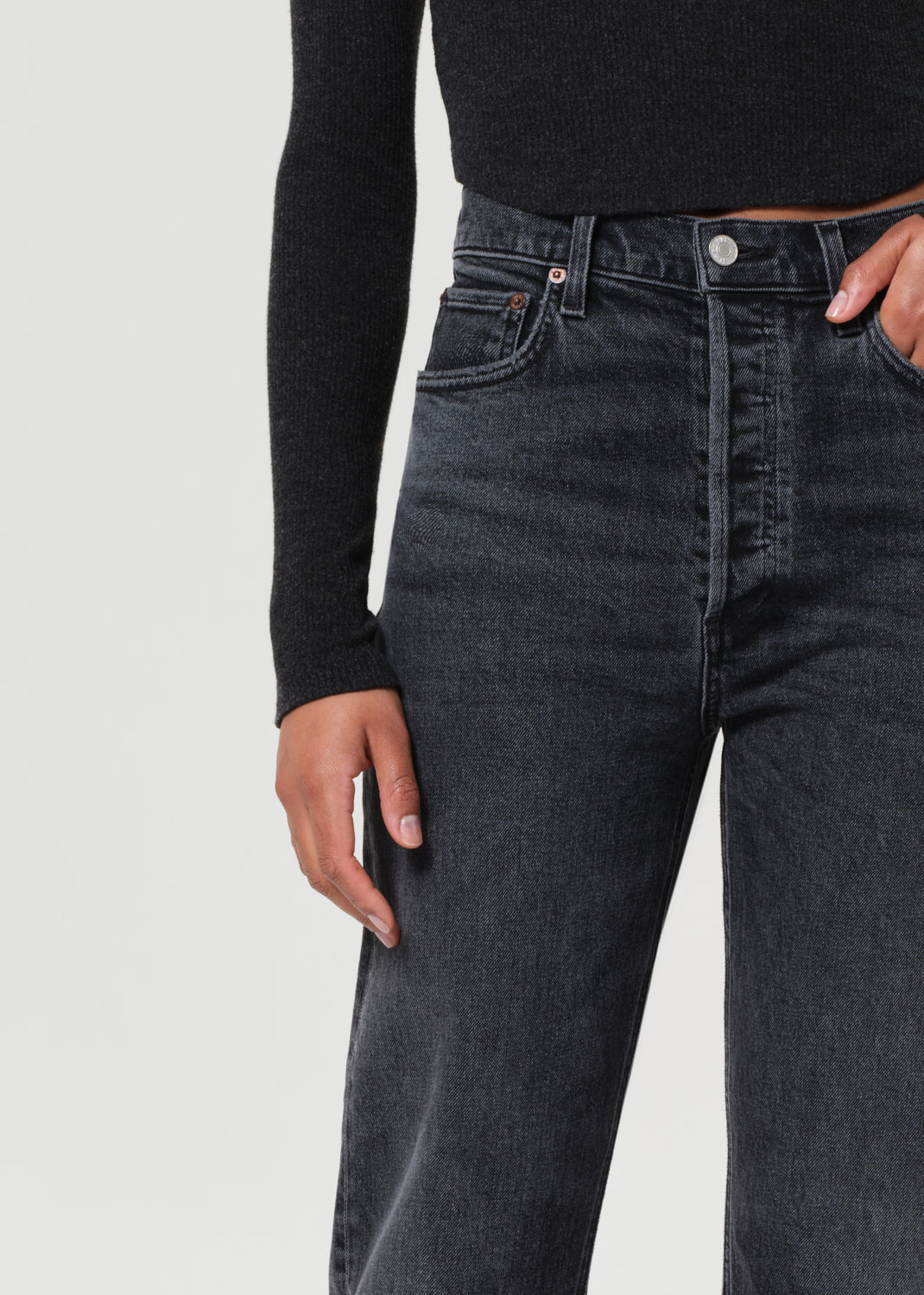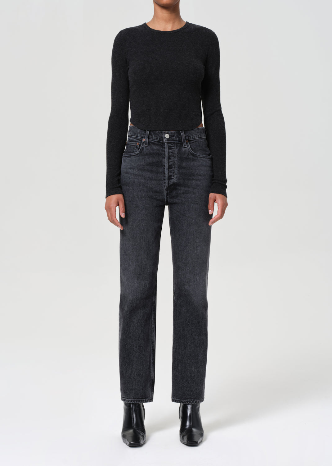 A vintage-inspired fit with a modern feel. The 90’s Pinch Waist features a flattering high-rise waist with a close-fitting top block that hugs through the hips before falling into a classic straight leg. Crafted from black regenerative cotton denim, this pair offers a non-stretch, authentic vintage look. Finished with a full-length inseam, it’s endlessly versatile—style it with anything and everything for effortless, everyday wear.