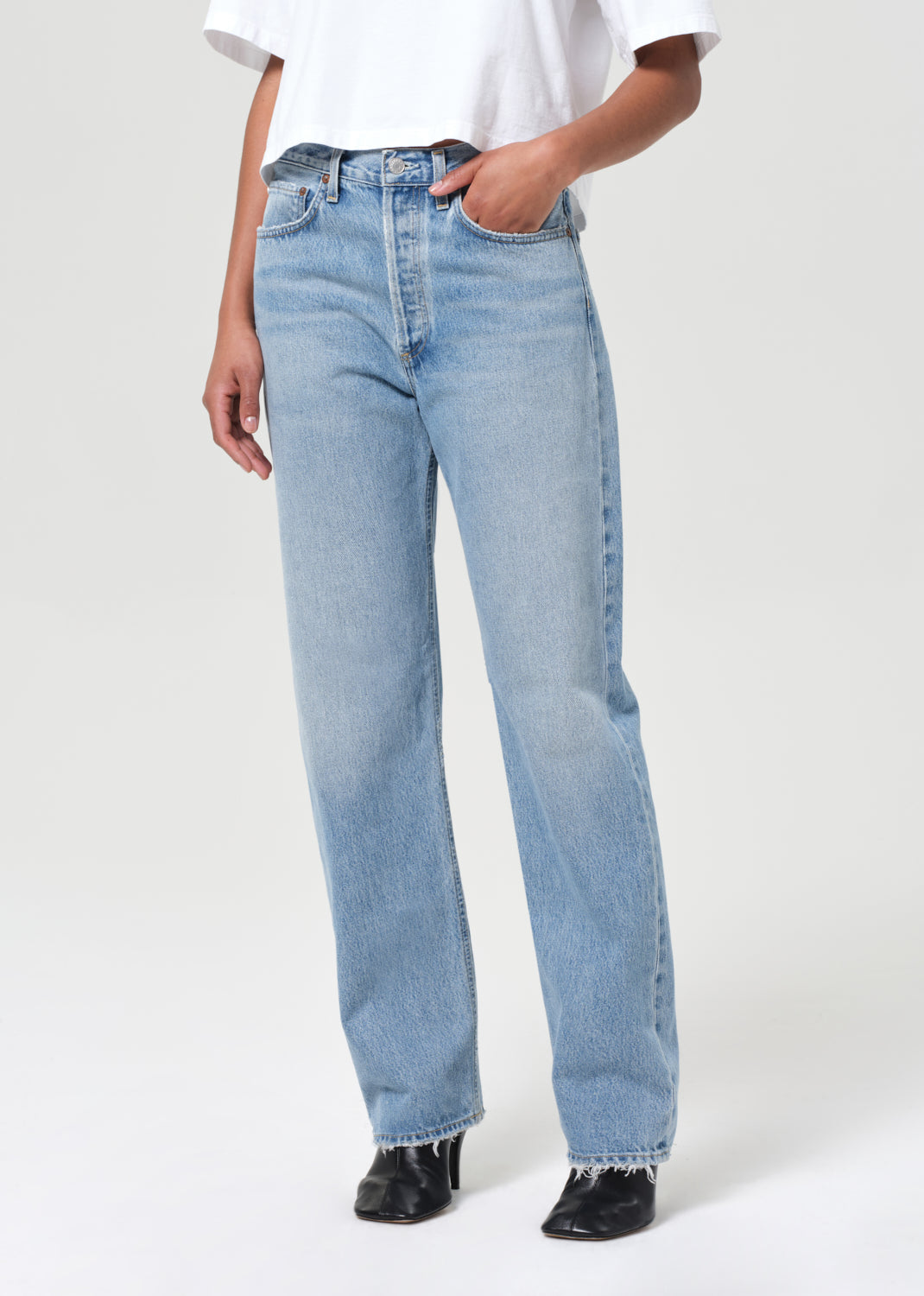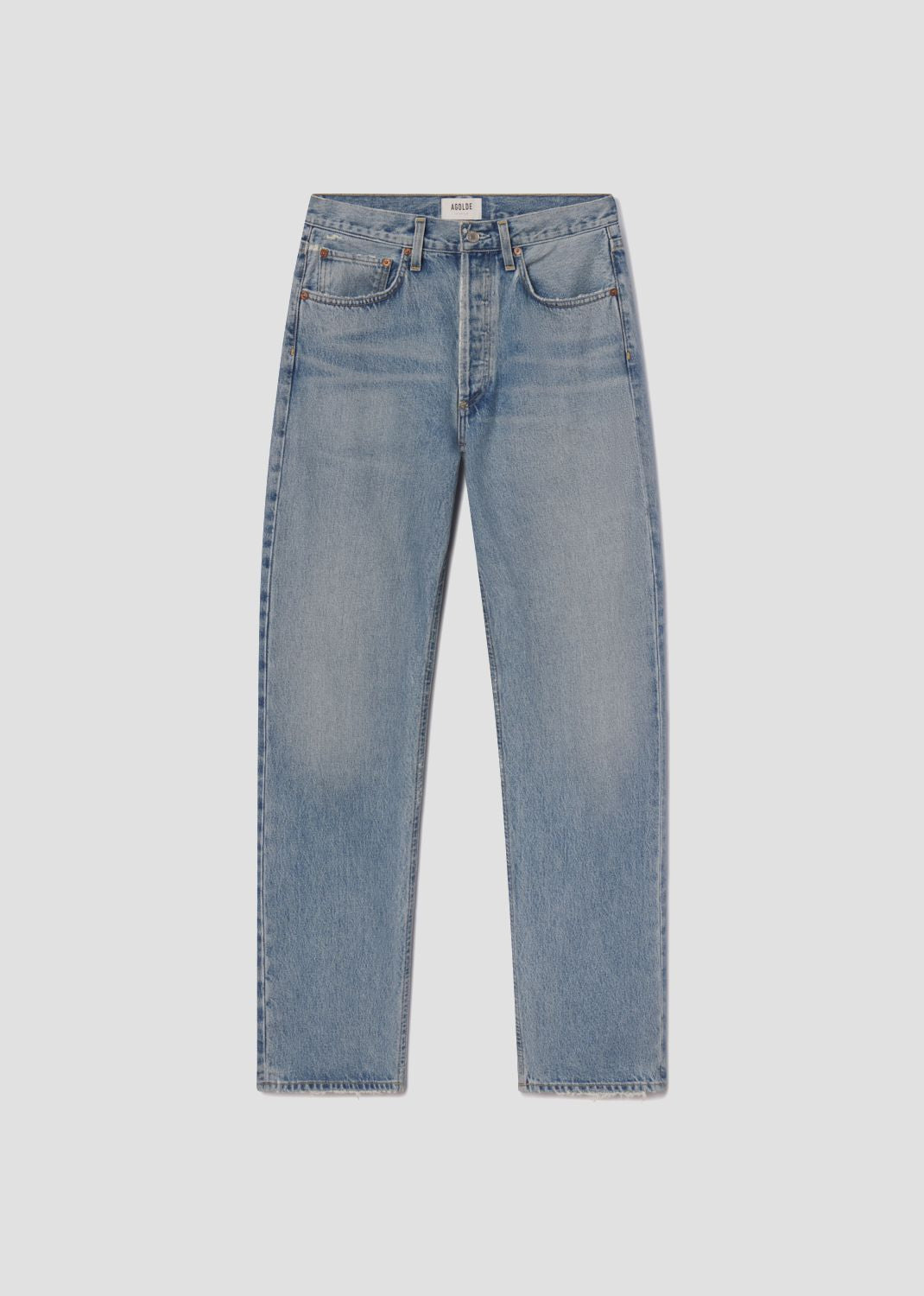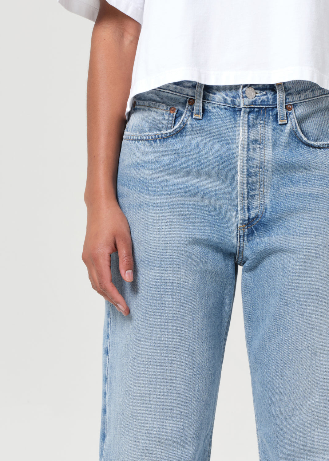 The Kelly features a flattering high-rise waist that leads into a relaxed top block, falling into a classic straight leg with a vintage-inspired extended inseam. Crafted from 100% regenerative cotton in medium vintage indigo, the jeans showcase natural fading, whiskering, and subtle marbling for a perfectly worn-in look. With a non-stretch construction, they offer a timeless, authentic feel. Style them with a sleek bodysuit and ankle boots for a polished look, or pair with a relaxed tee and sneakers for an effortless off-duty vibe.