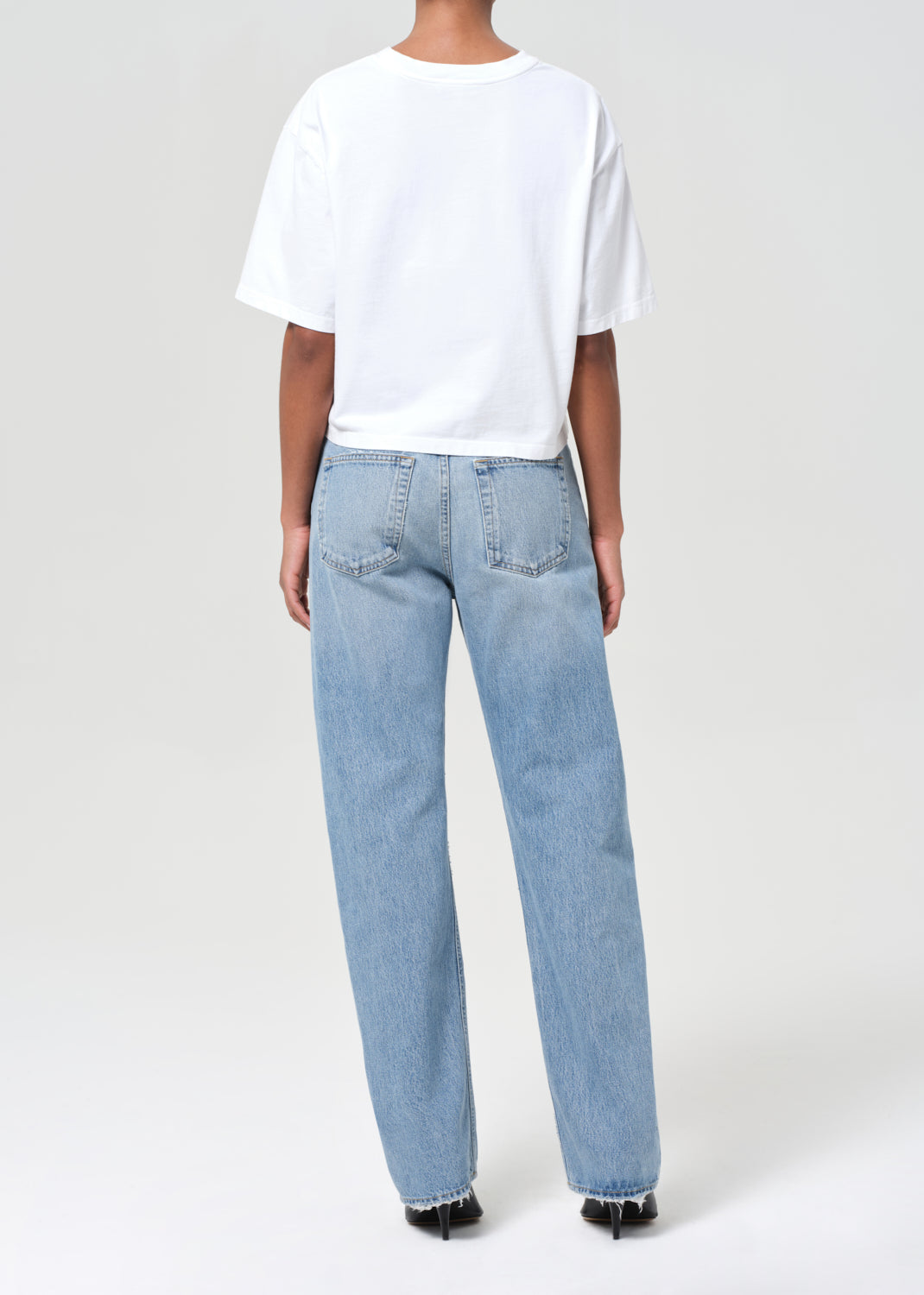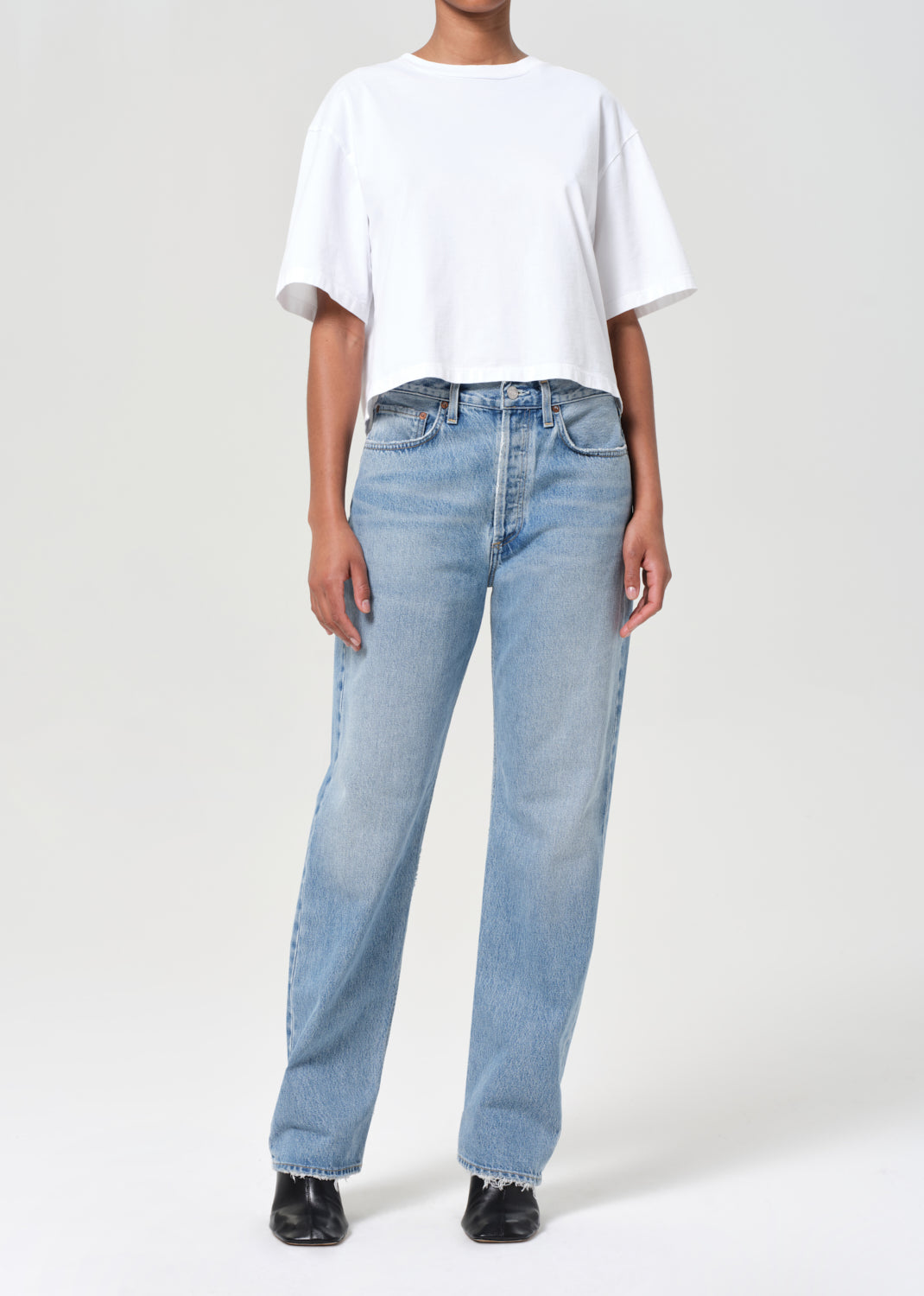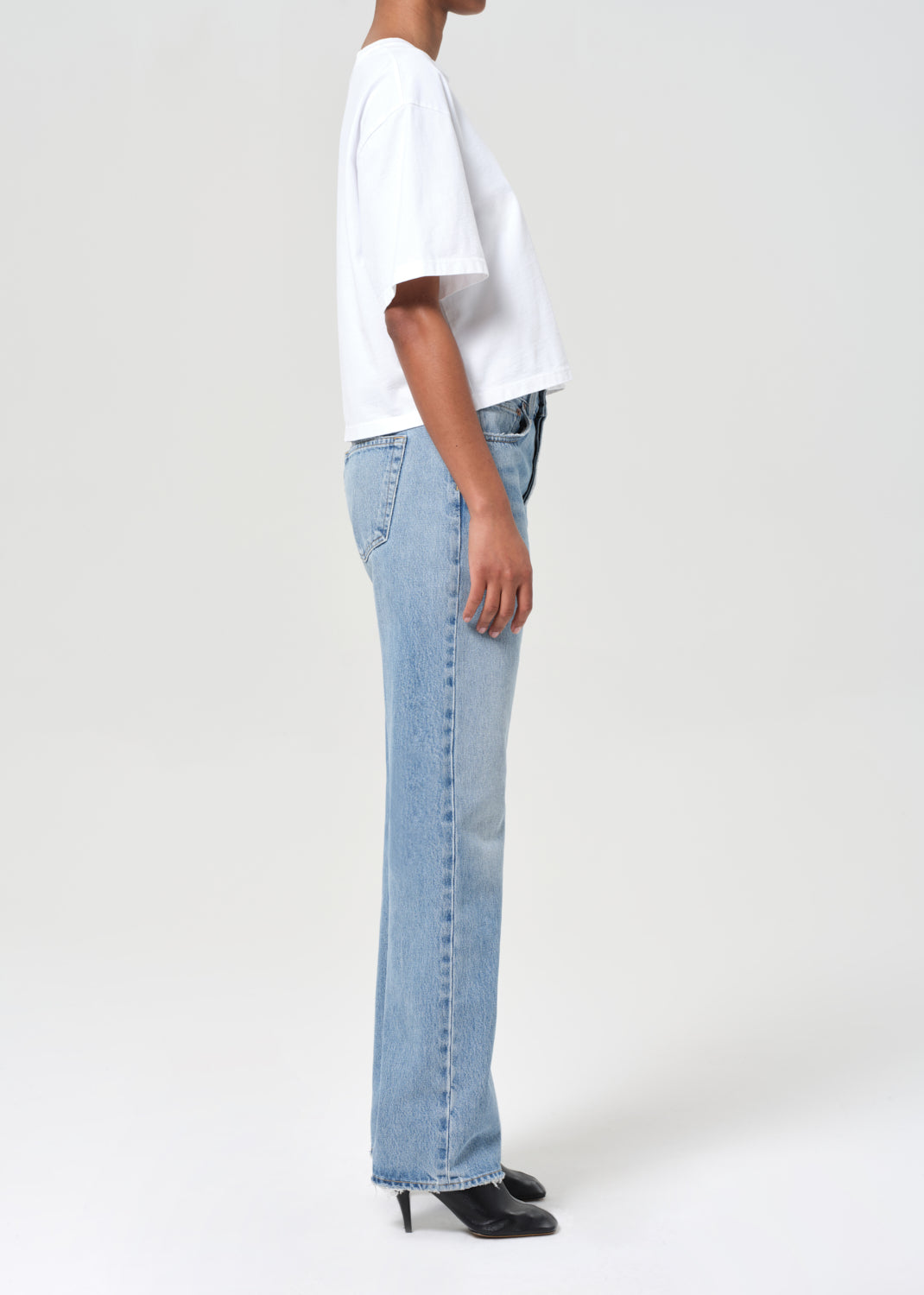 The Kelly features a flattering high-rise waist that leads into a relaxed top block, falling into a classic straight leg with a vintage-inspired extended inseam. Crafted from 100% regenerative cotton in medium vintage indigo, the jeans showcase natural fading, whiskering, and subtle marbling for a perfectly worn-in look. With a non-stretch construction, they offer a timeless, authentic feel. Style them with a sleek bodysuit and ankle boots for a polished look, or pair with a relaxed tee and sneakers for an effortless off-duty vibe.