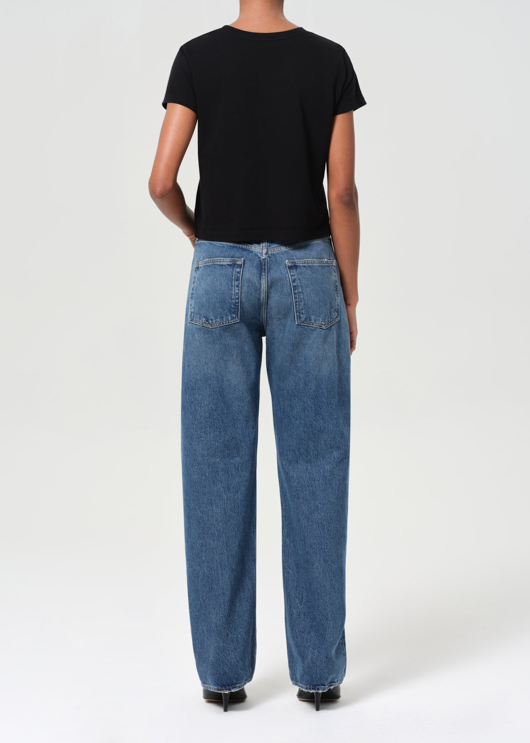 The Kelly features a flattering high-rise waist that leads into a relaxed top block, falling into a classic straight leg with a vintage-inspired extended inseam. Crafted from a blend of regenerative cotton and recycled cotton in dark indigo, this non-stretch denim offers a beautiful drape and a perfectly worn-in look with natural fading and subtle distressing. Style them with a sleek bodysuit and ankle boots for a polished look, or pair with a relaxed tee and sneakers for an effortless off-duty vibe.