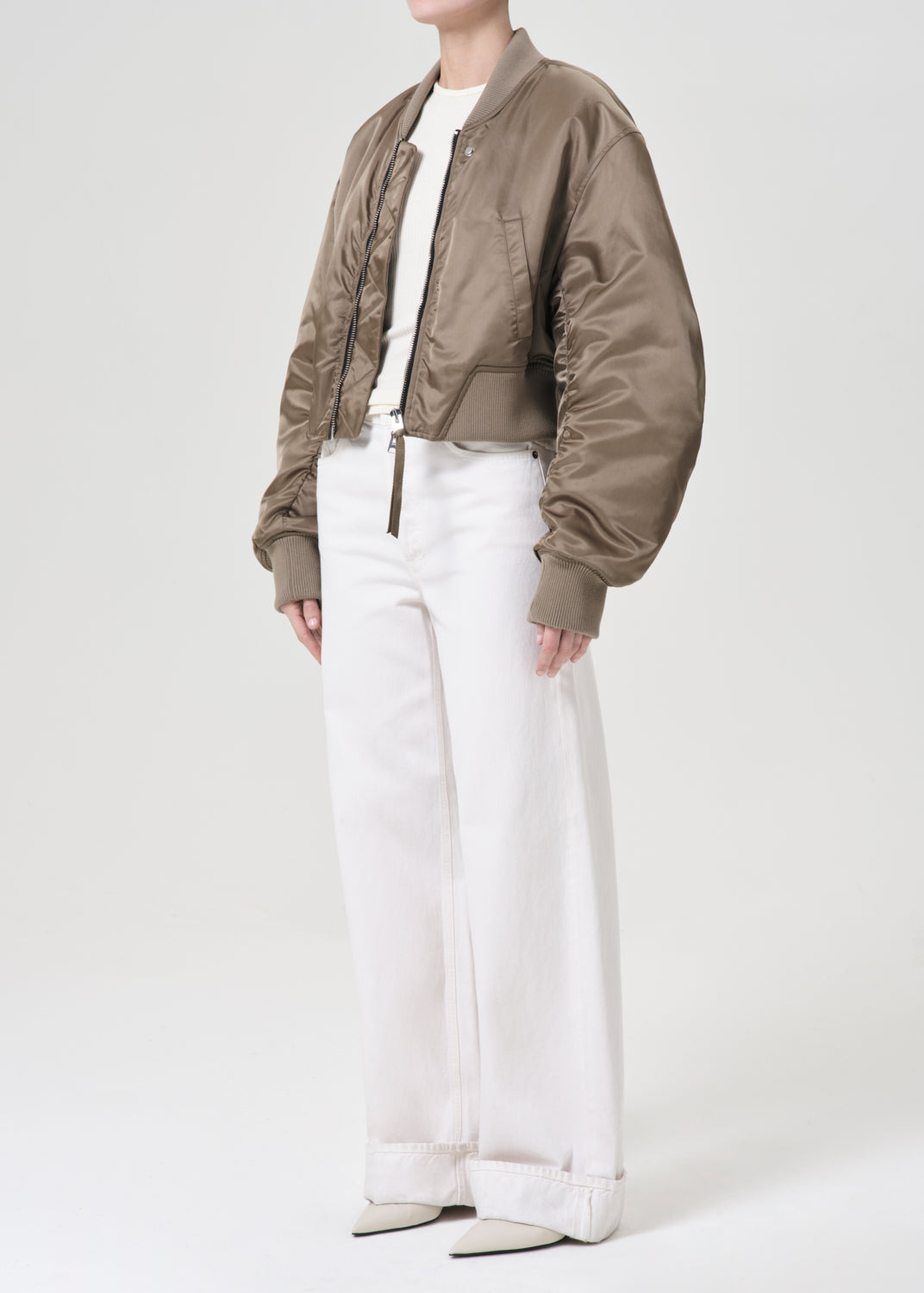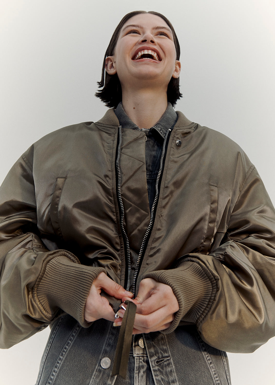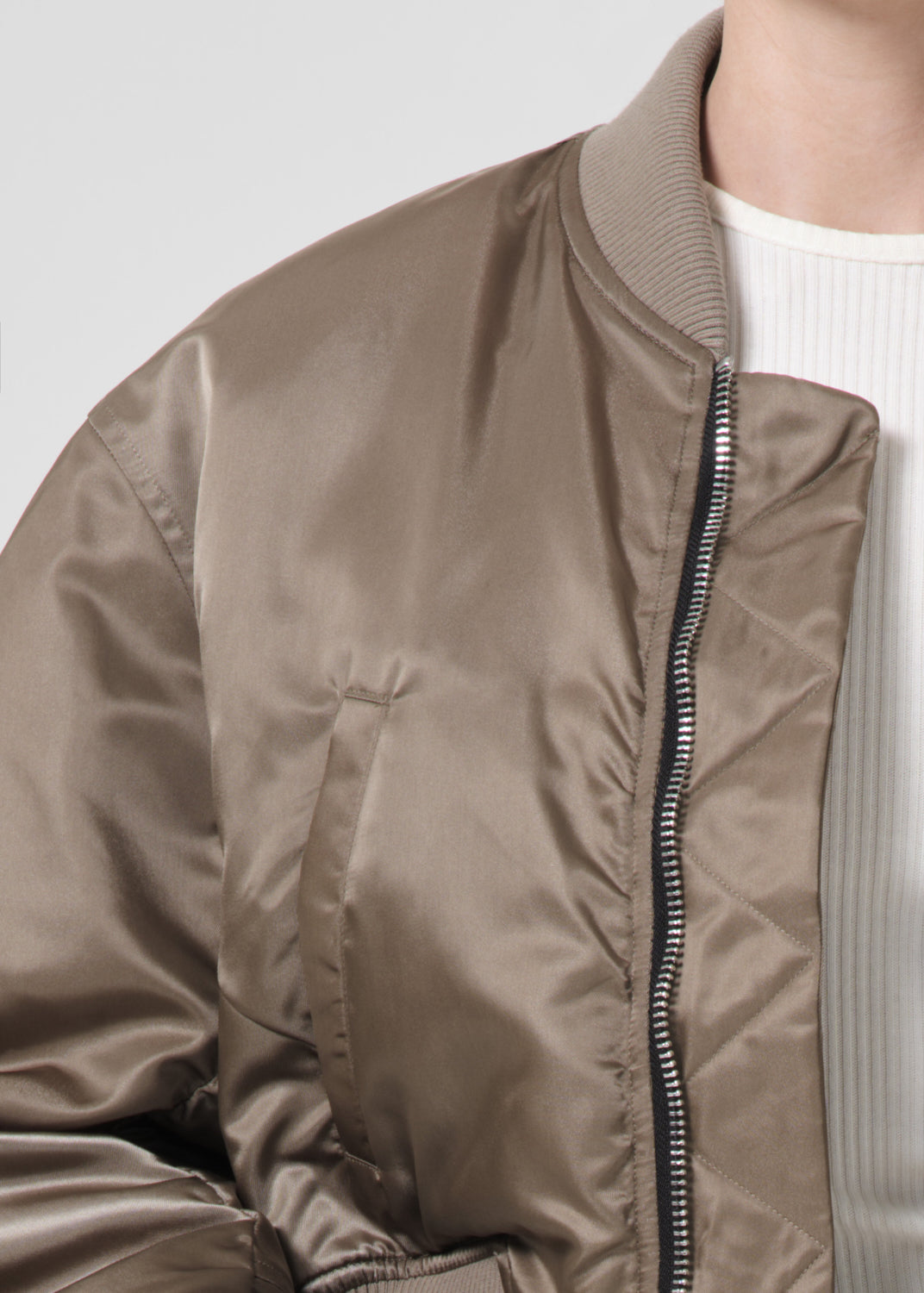 The ultimate layering piece from the West Coast to East London. The Jett Bomber Jacket will layer on to your everyday rotation to create a versatile statement silhouette. The relaxed fit is designed with a dropped shoulder, cropped body and curved sleeve shape. Crafted from recycled nylon and lightly quilted with recycled fibers.