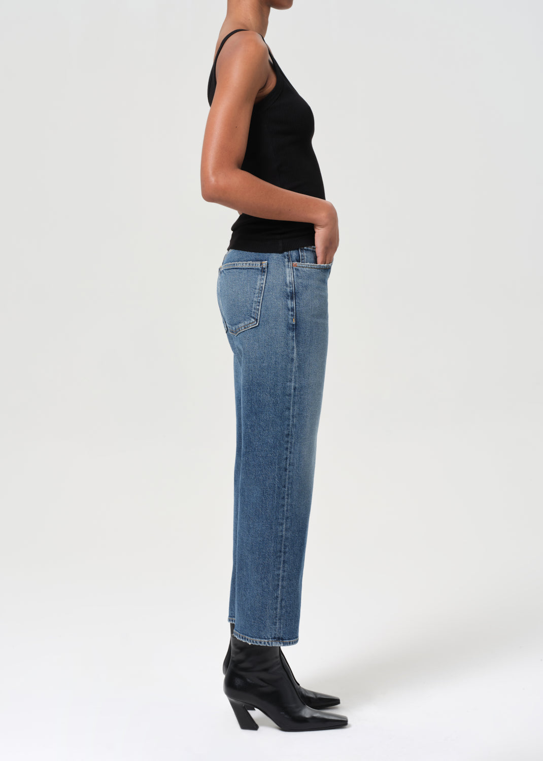 The Harper Crop is your new everyday jean—easy, flattering, and endlessly versatile. This mid-rise pair is cut from comfort-stretch denim in a medium-to-dark indigo wash with soft fading and marbling for a lived-in feel. The relaxed straight leg and cropped inseam make it perfect with sneakers, sandals, or your favorite fall boot.