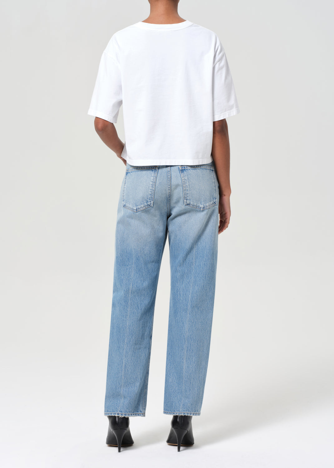 A medium-worn indigo denim with fading, marbling, and whiskering details for a vintage-inspired look. This mid-rise jean sits comfortably at the waist, flowing into a relaxed, loose straight leg. Crafted from rigid, non-stretch 100% regenerative cotton denim, it maintains its shape while offering a soft hand feel that becomes even more comfortable with wear.
