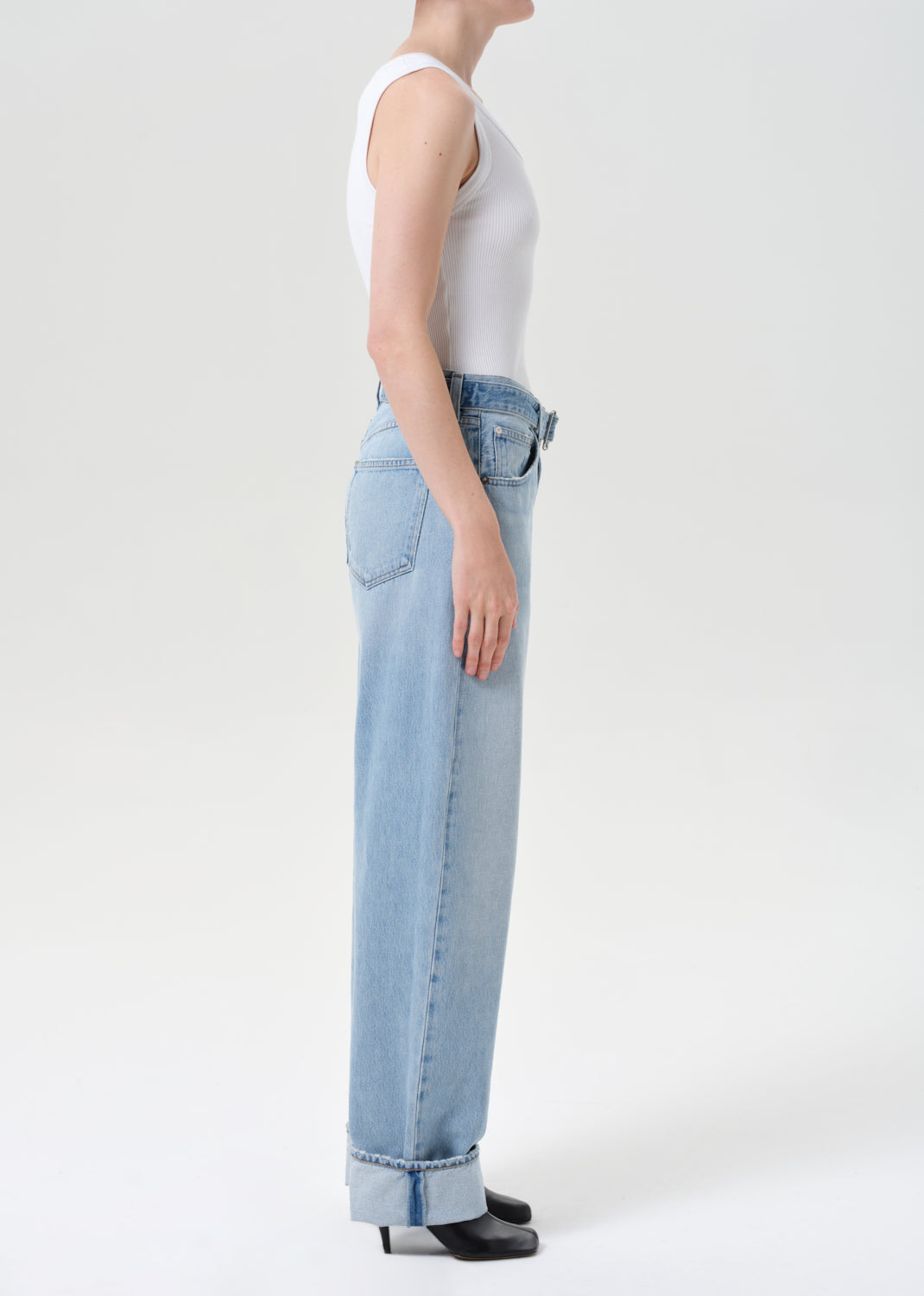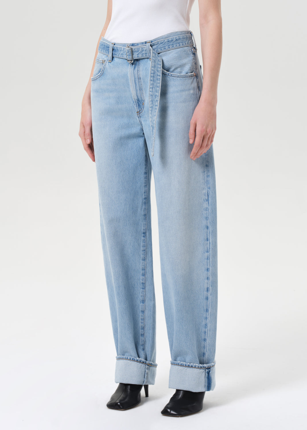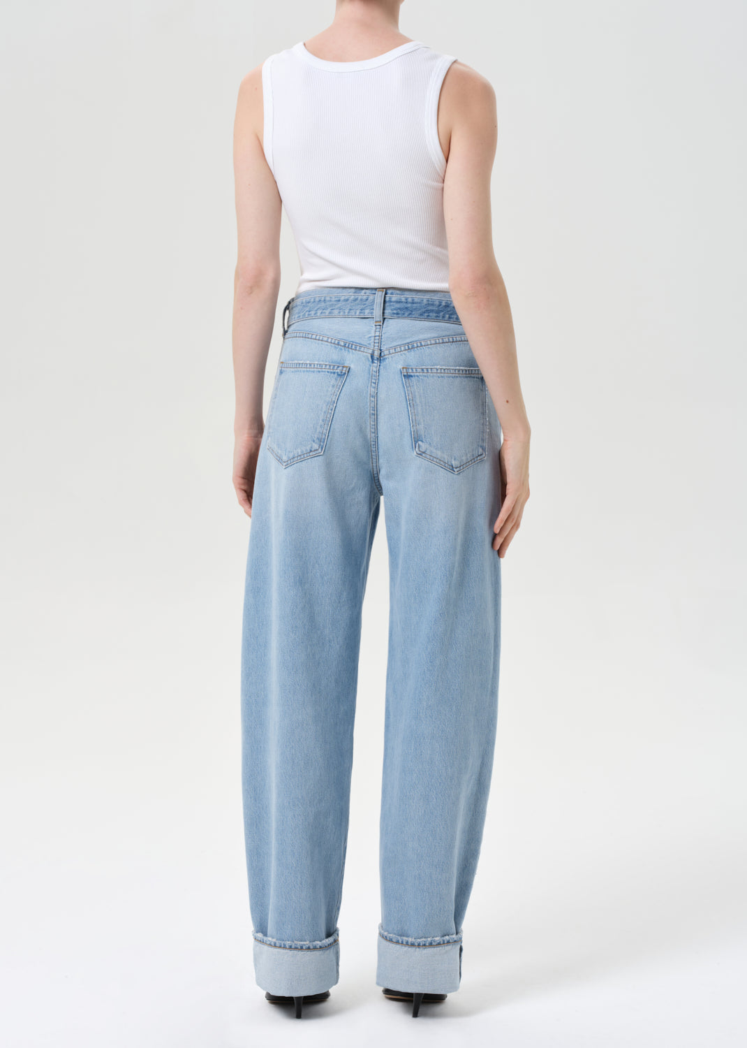 Looks Like: Pale vintage indigo denim pant with optional cuff
