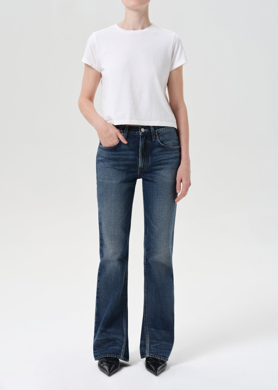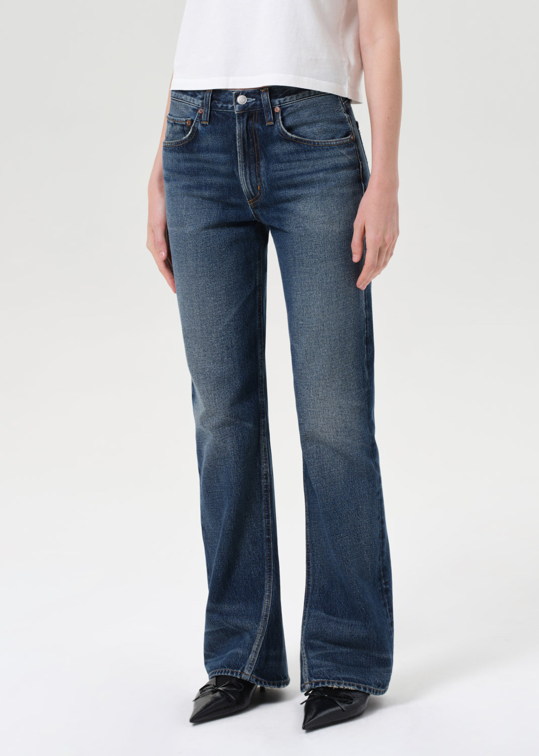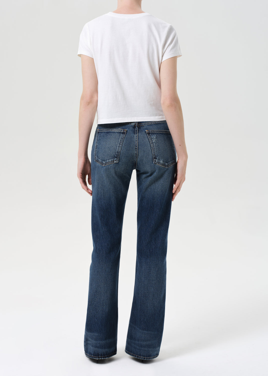 A modern take on the classic bootcut, this mid-rise silhouette hugs through the hips before opening into a subtle kick at the hem. Crafted from rigid, non-stretch regenerative cotton denim with a soft hand, and finished in a dark indigo with authentic fading and whiskering for a broken-in look. Style with a tucked-in tee or structured knit to balance the proportions.