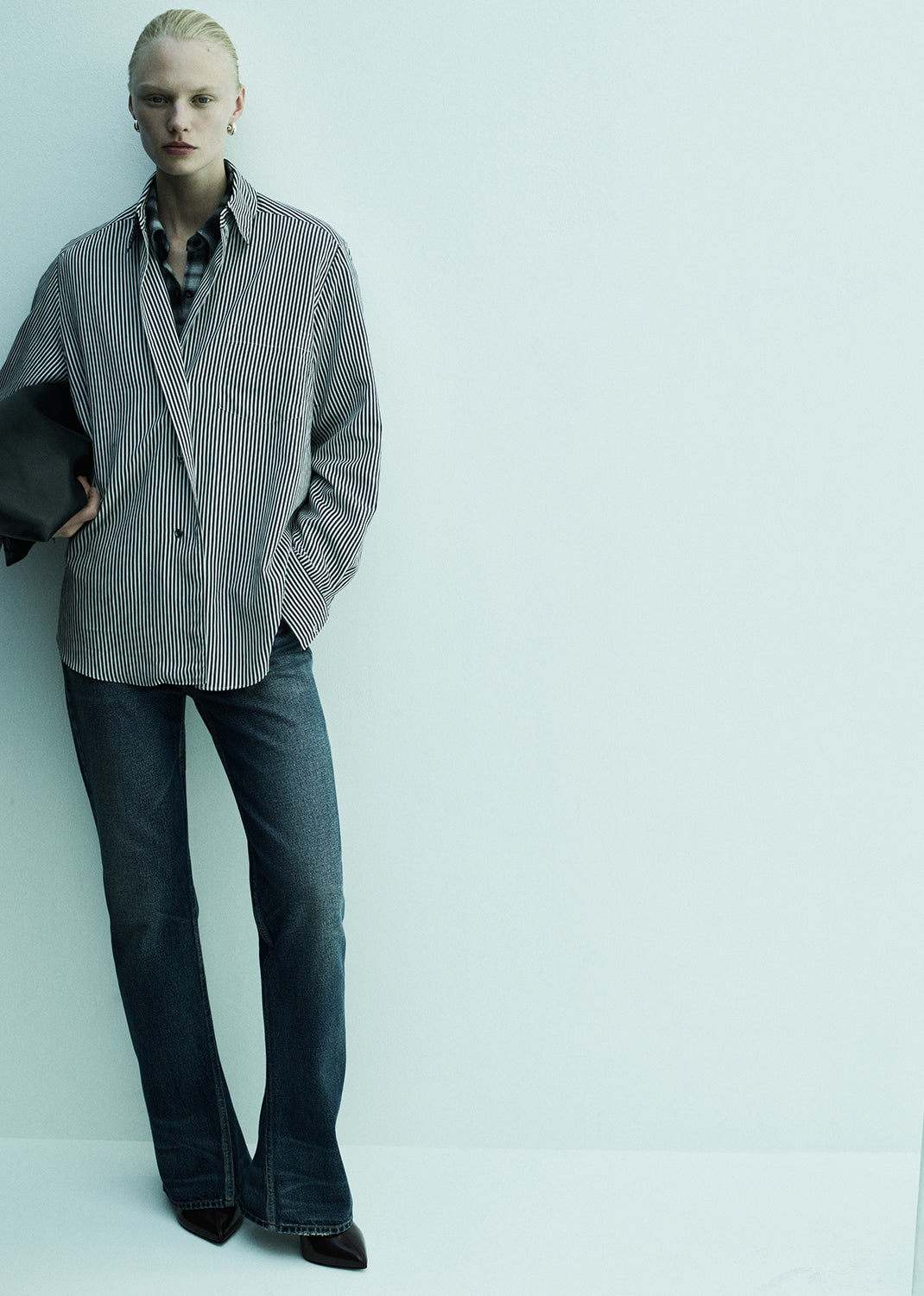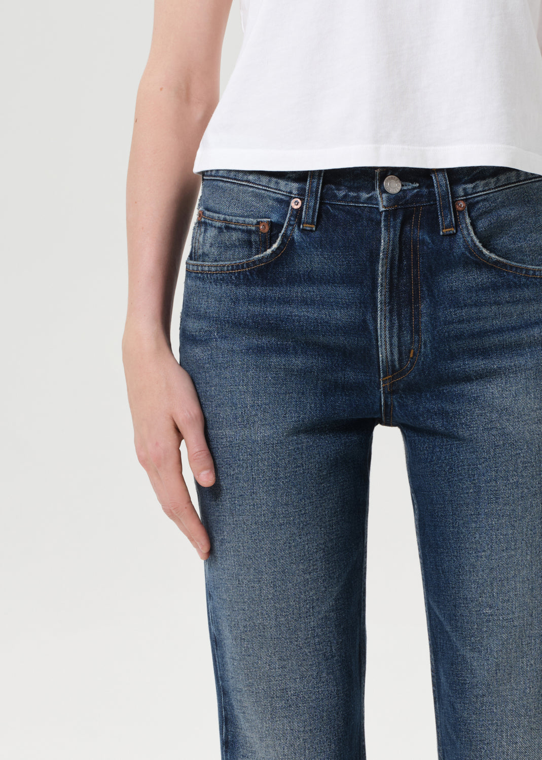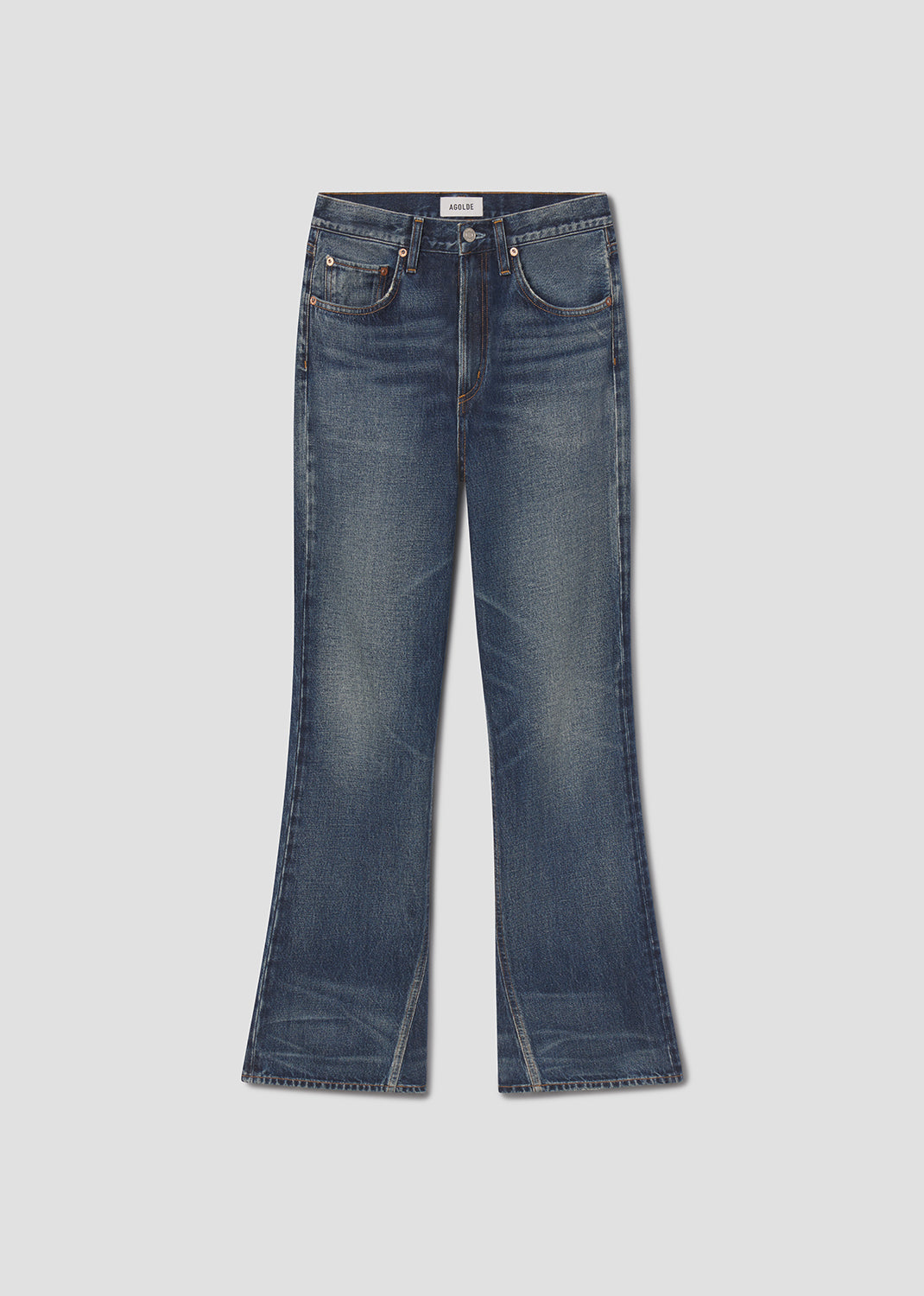 A modern take on the classic bootcut, this mid-rise silhouette hugs through the hips before opening into a subtle kick at the hem. Crafted from rigid, non-stretch regenerative cotton denim with a soft hand, and finished in a dark indigo with authentic fading and whiskering for a broken-in look. Style with a tucked-in tee or structured knit to balance the proportions.