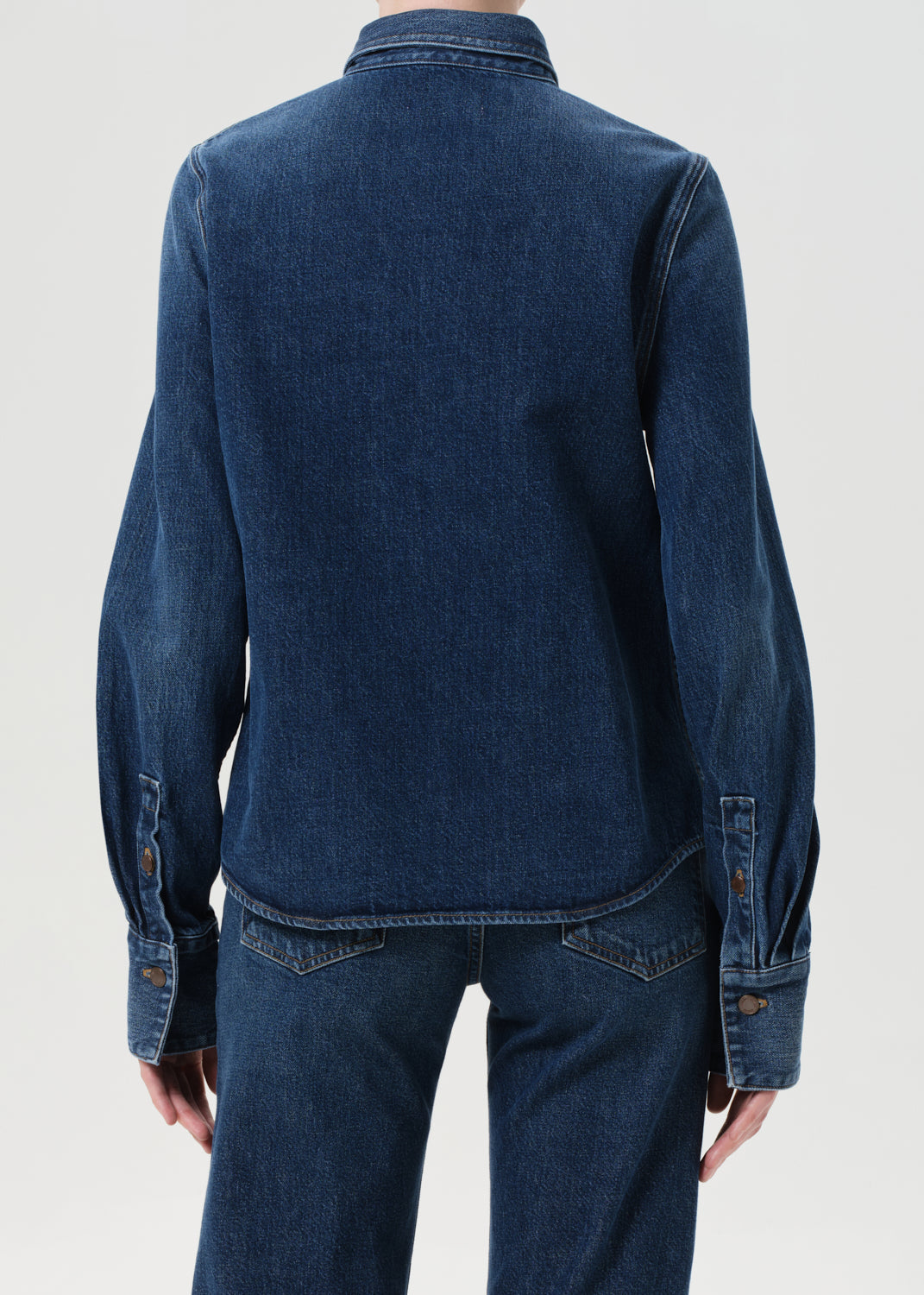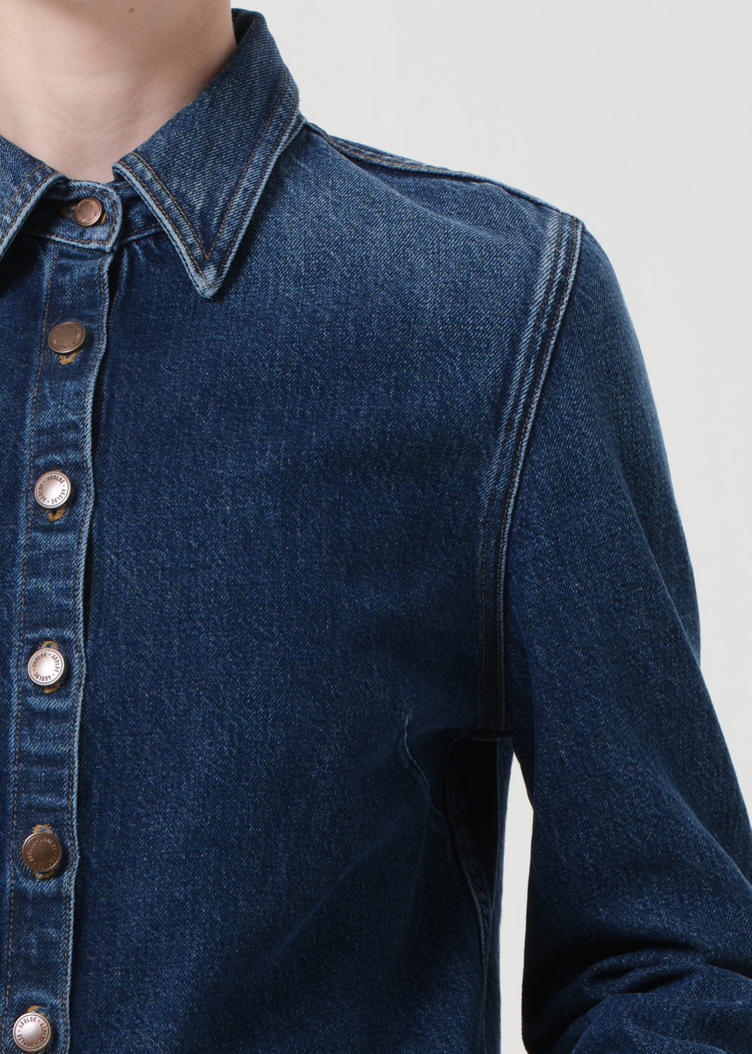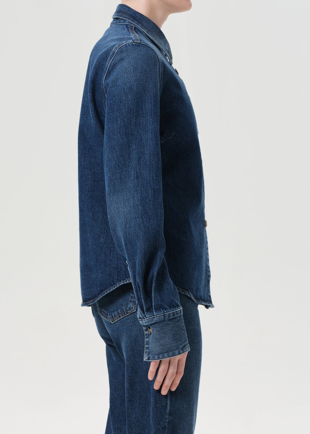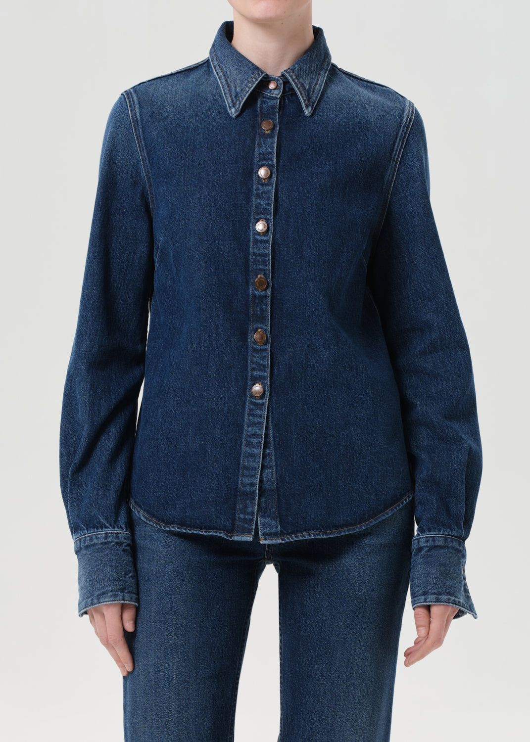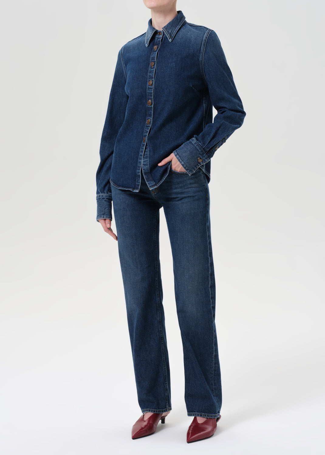 The Talia Shirt is a refined take on classic denim shirting, featuring a curved hem and tailored fit. Crafted from our soft, weightless denim in a rich dark-to-medium indigo wash, it’s finished with vintage-inspired hardware and subtle fading for a lived-in feel. Style buttoned up or layered open.