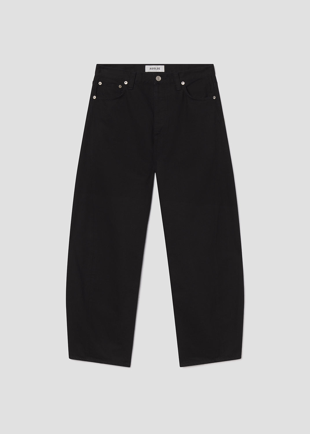 With a sculptural curved leg and flattering high-rise waist, the Luna Pieced Jean delivers a modern take on a tailored silhouette. Crafted from clean overdyed black denim, this version is cut in our weightless, non-stretch cotton for a soft, easy feel. Style with a tucked-in tee or tonal knit to highlight the pieced construction.