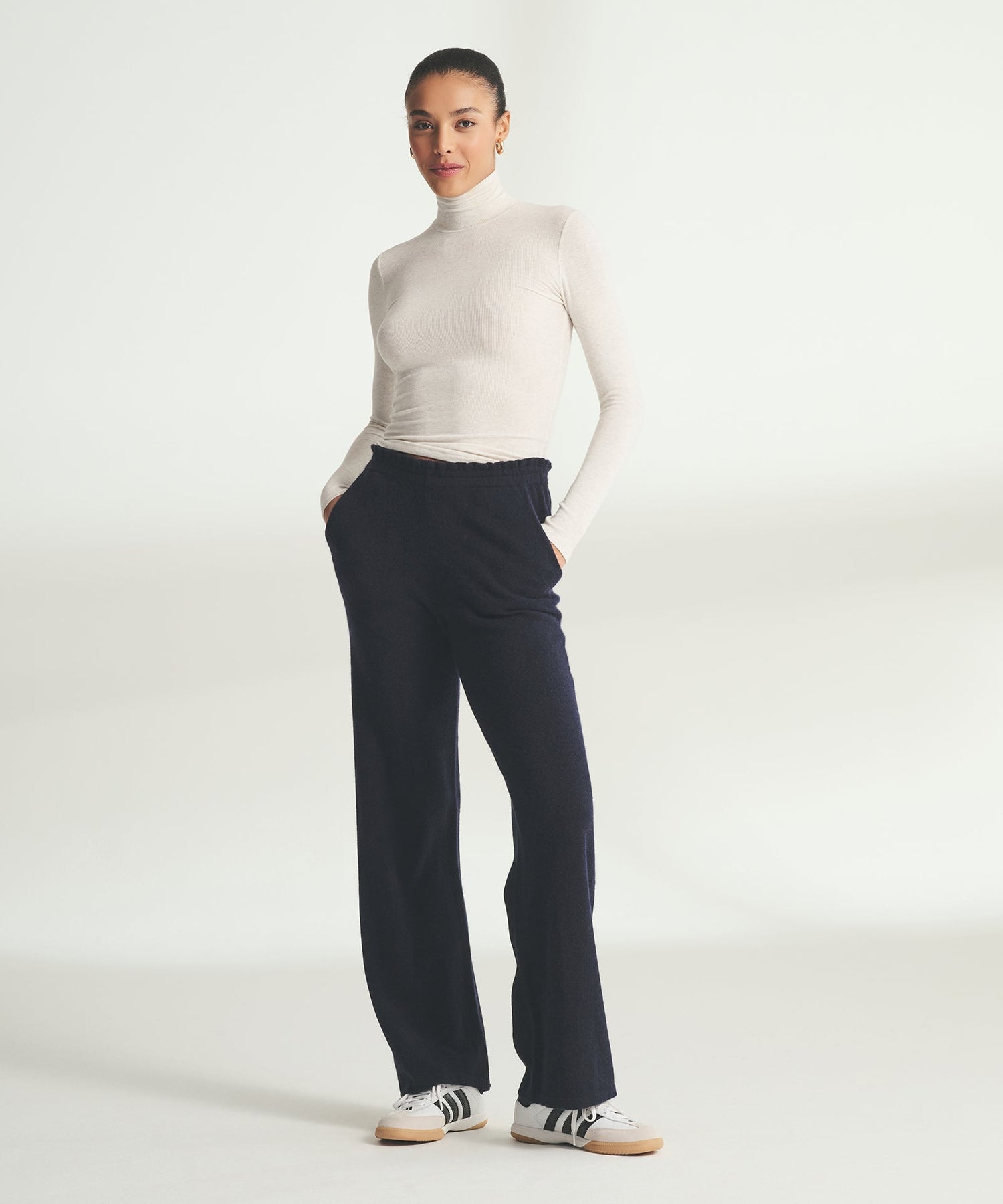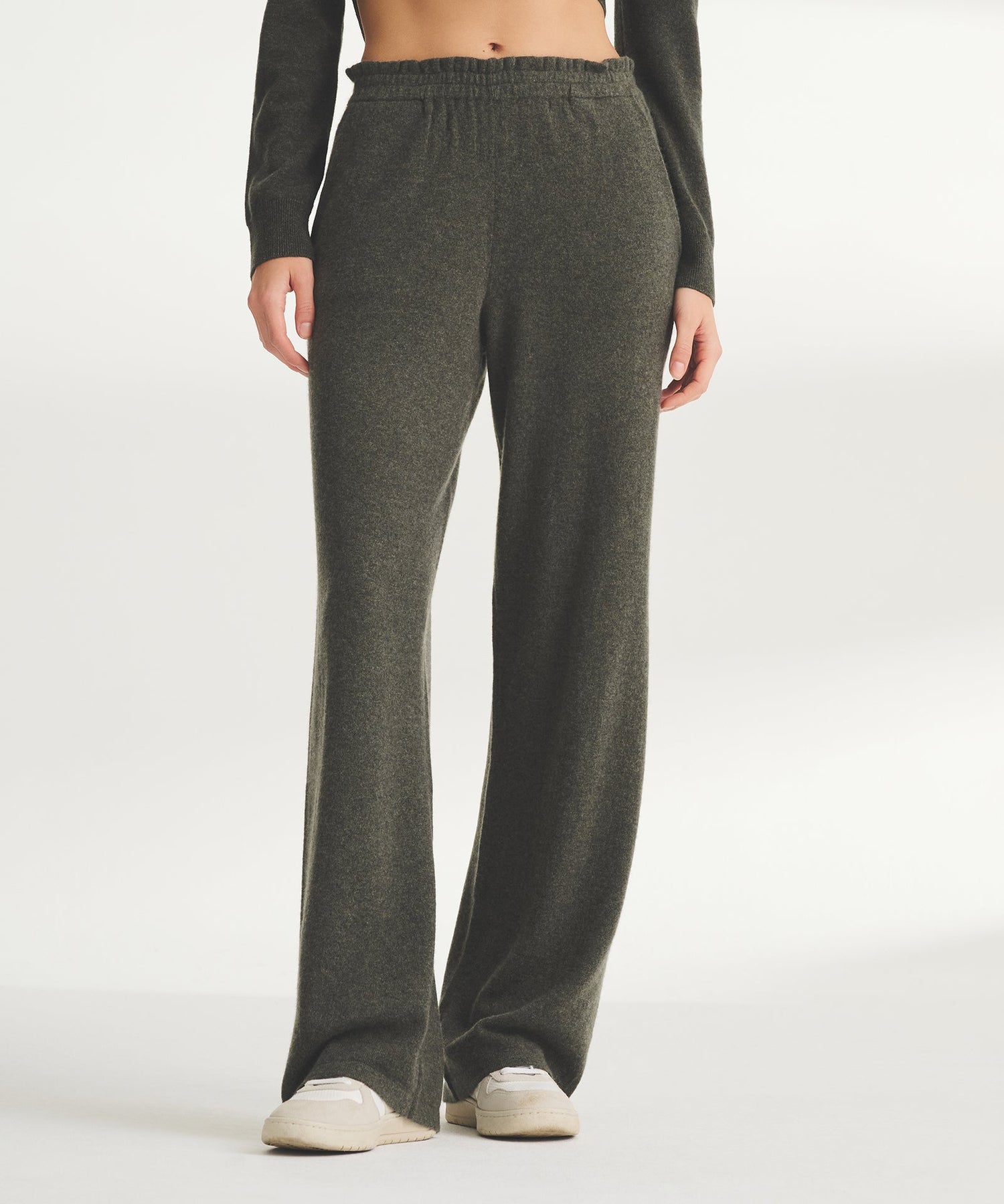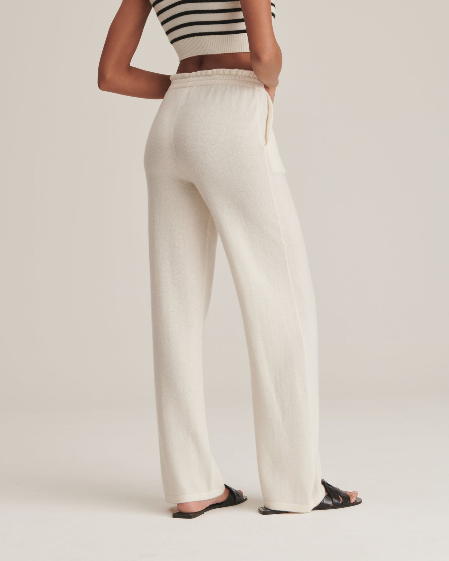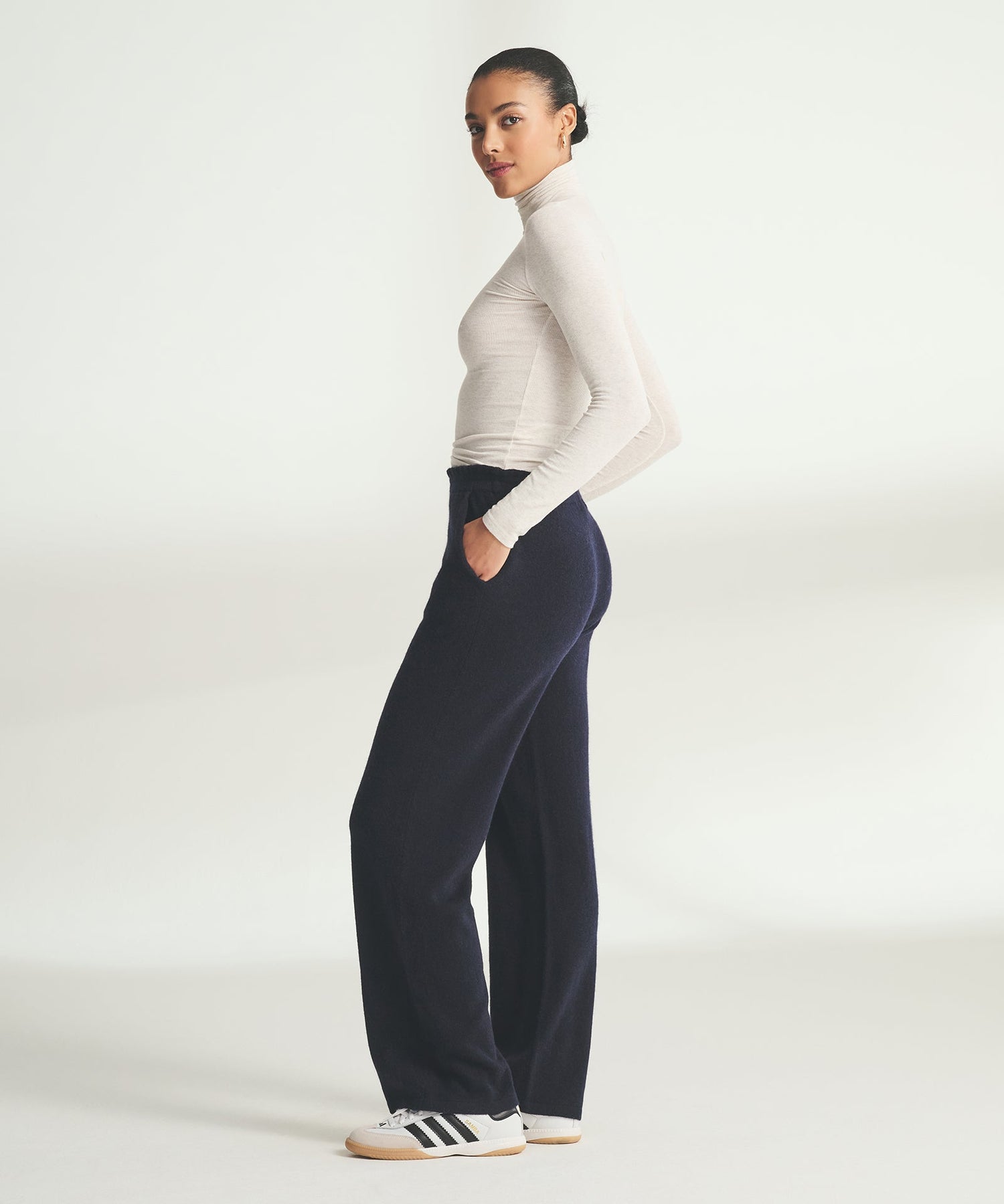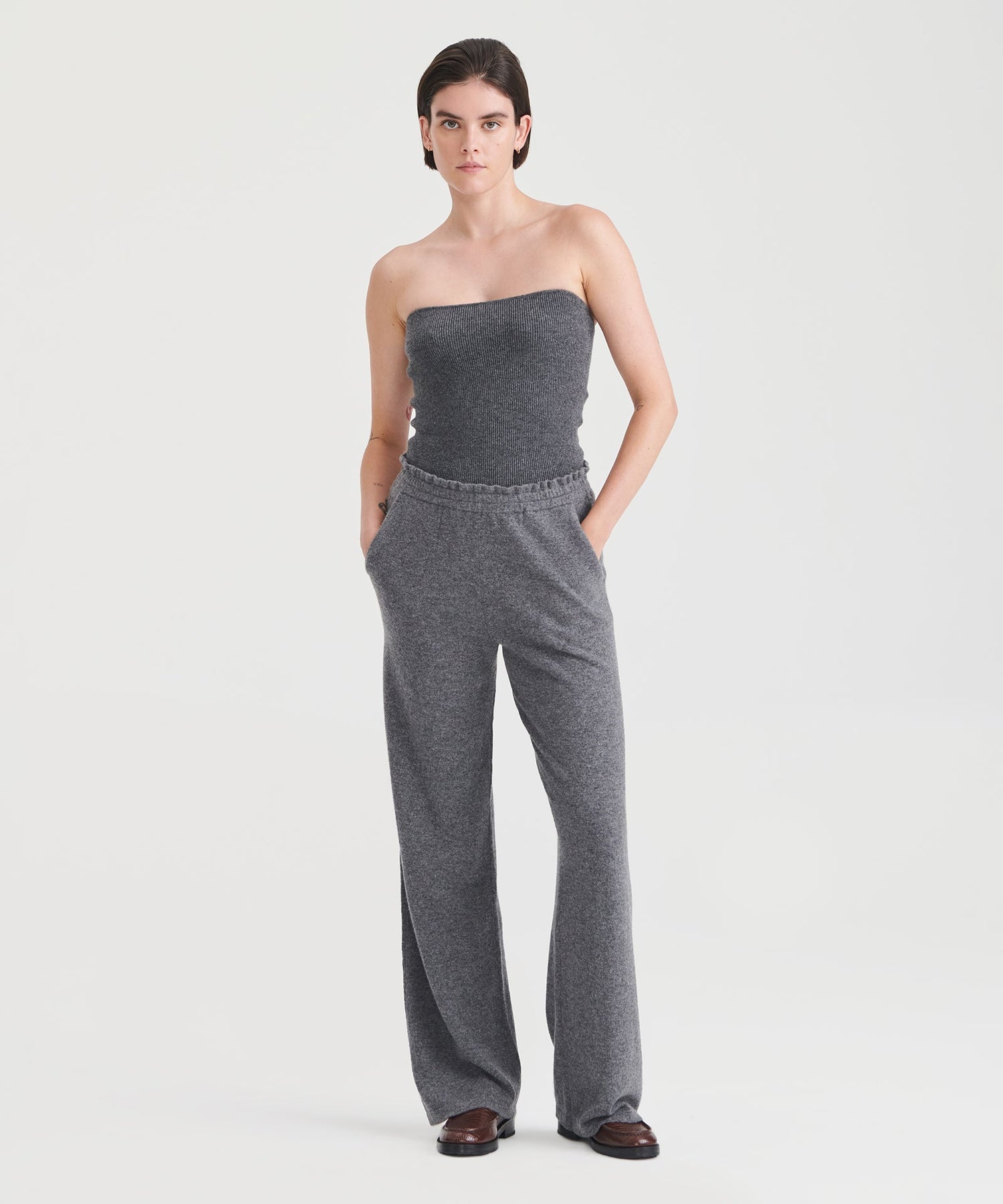 The Cashmere Wide Leg Pant is a chic, easygoing pant with a relaxed classic fit and full length inseam. It features a high rise, elastic paper-bag waistband, and side pockets. Crafted from 100% premium, sustainable cashmere.