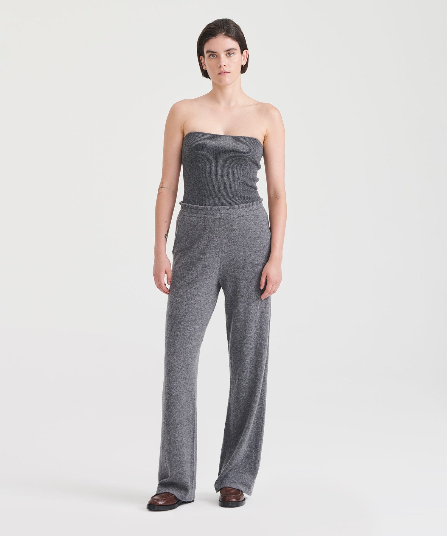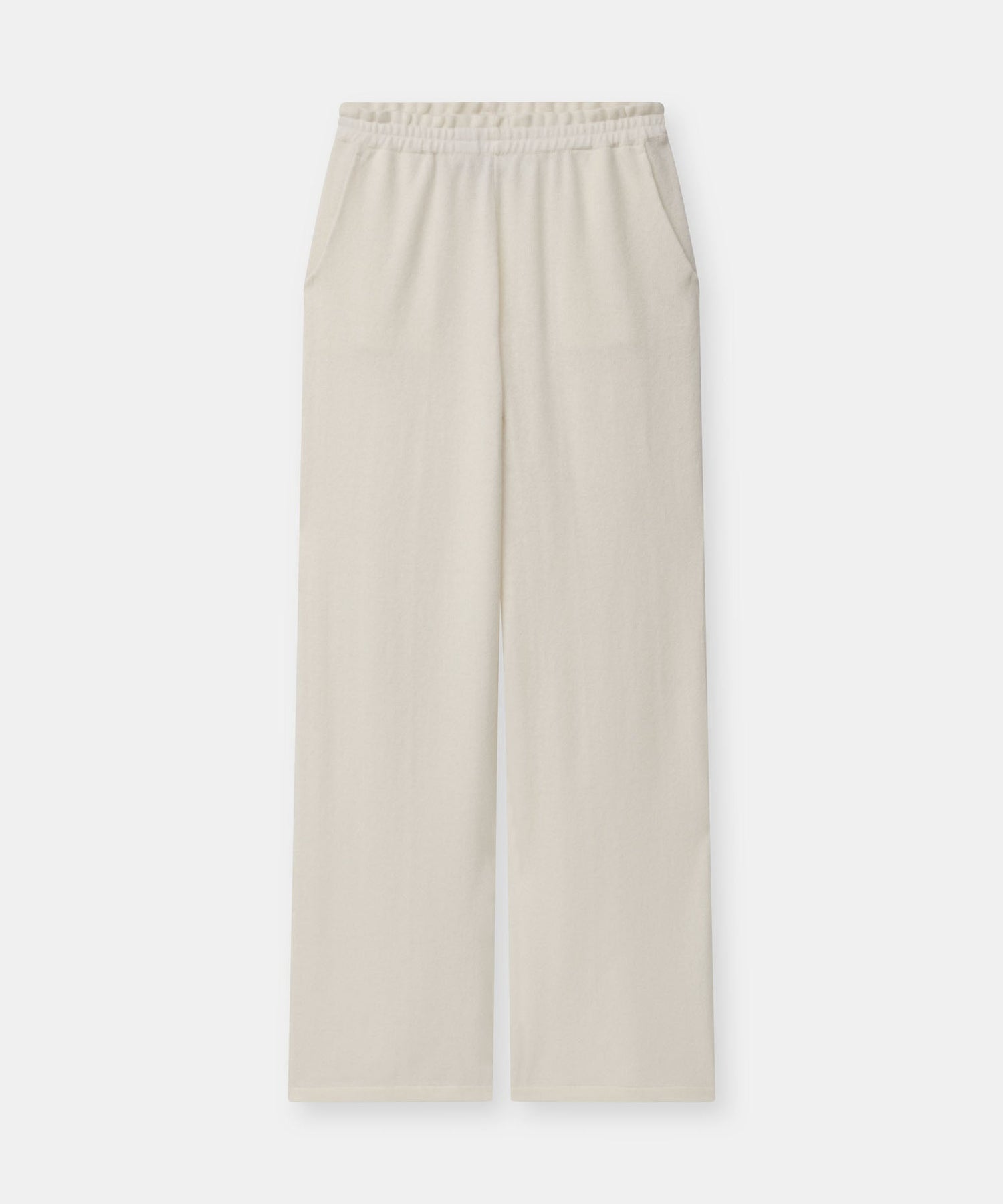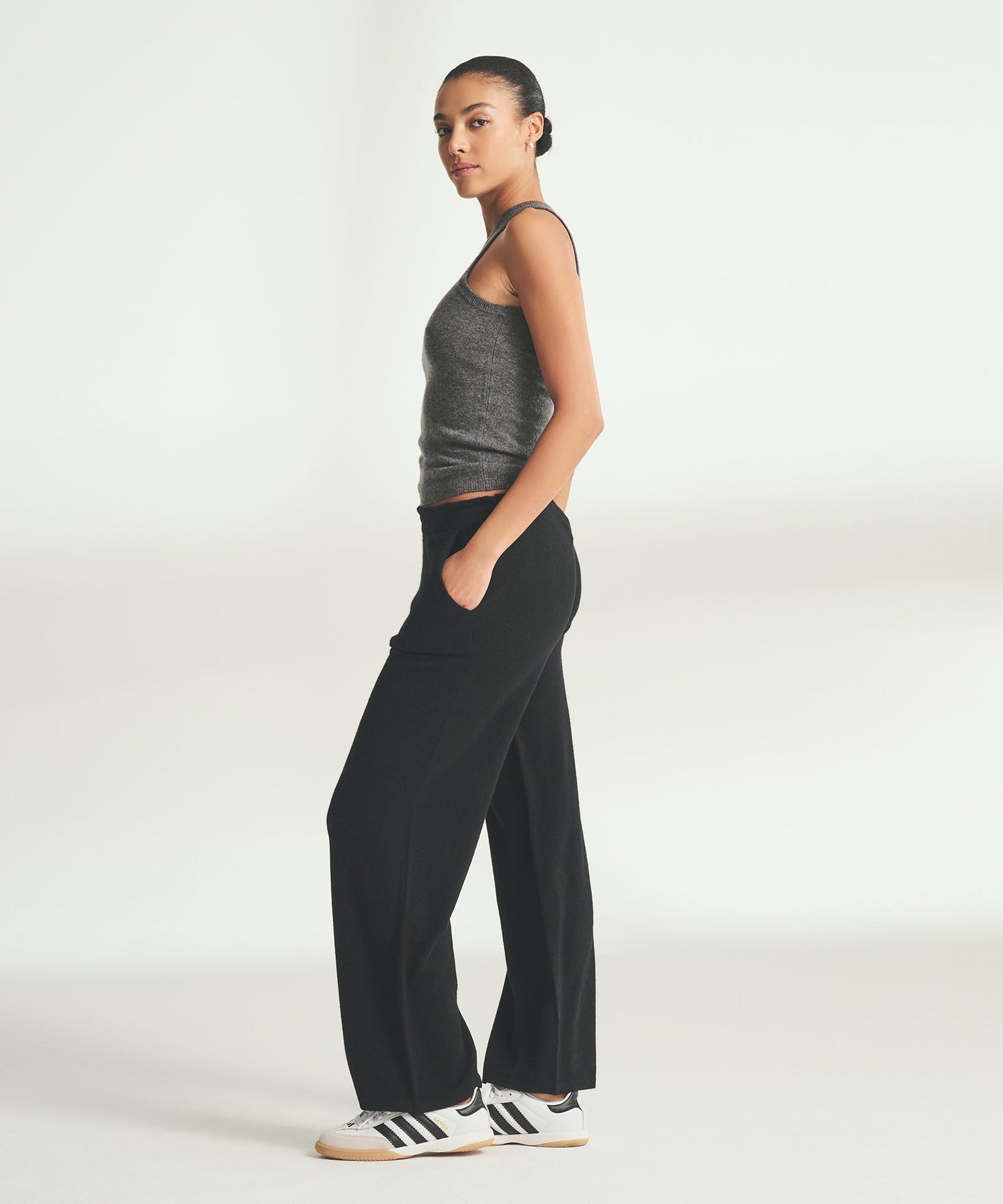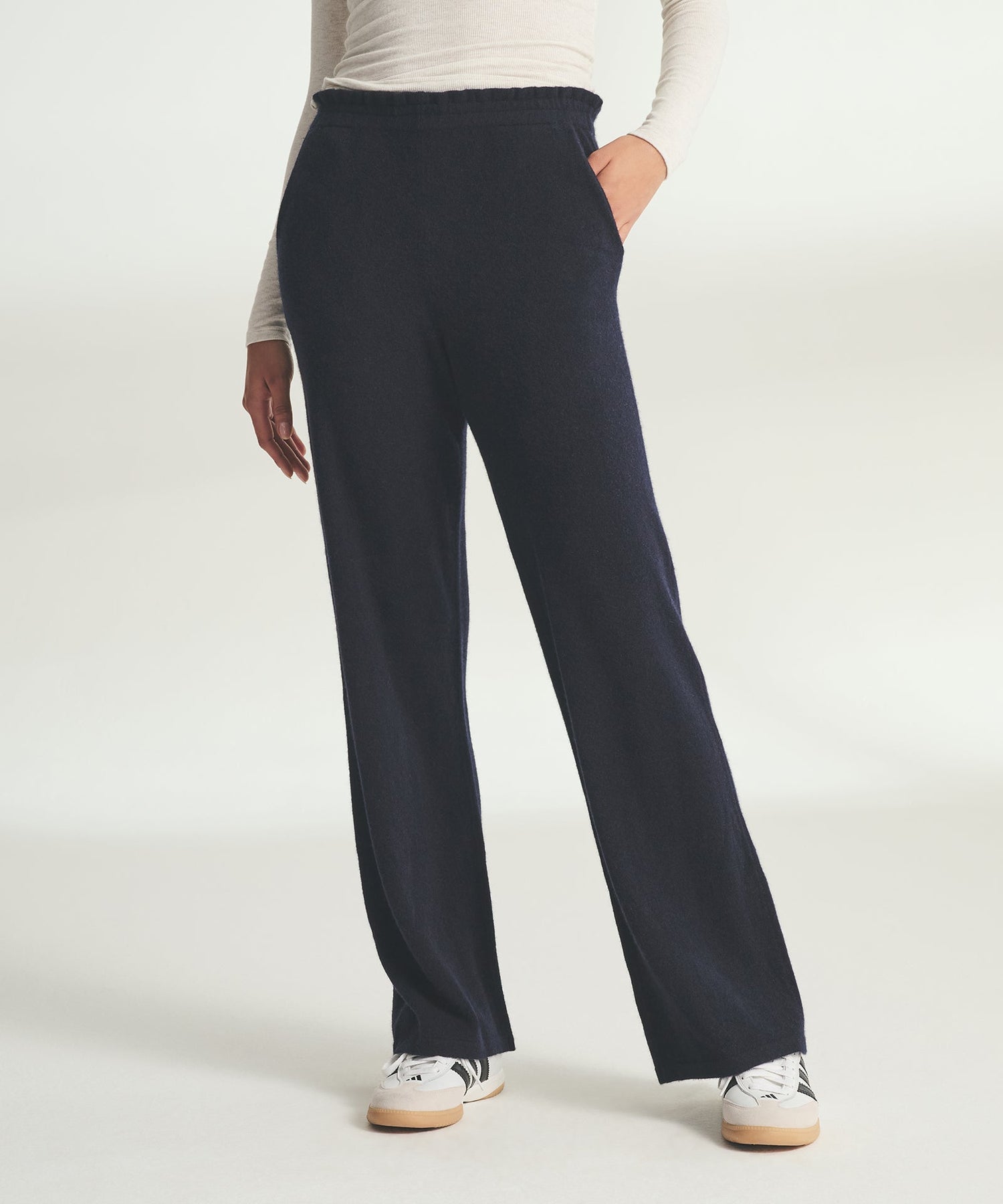 The Cashmere Wide Leg Pant is a chic, easygoing pant with a relaxed classic fit and full length inseam. It features a high rise, elastic paper-bag waistband, and side pockets. Crafted from 100% premium, sustainable cashmere.