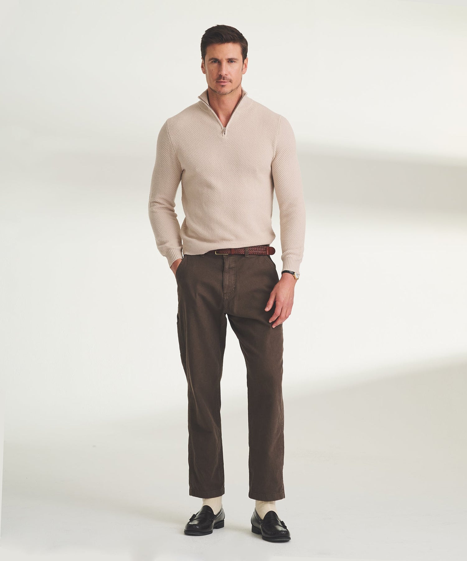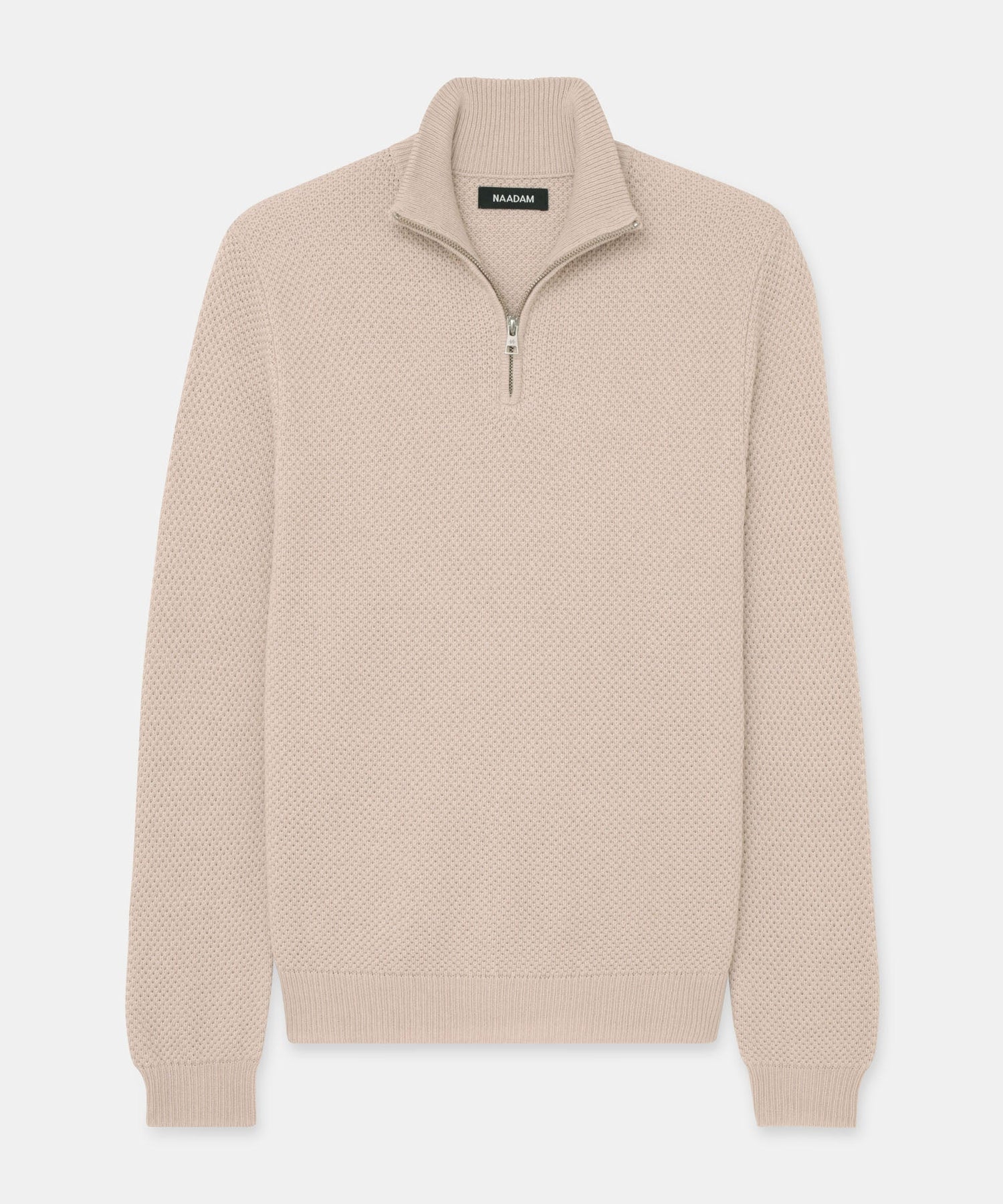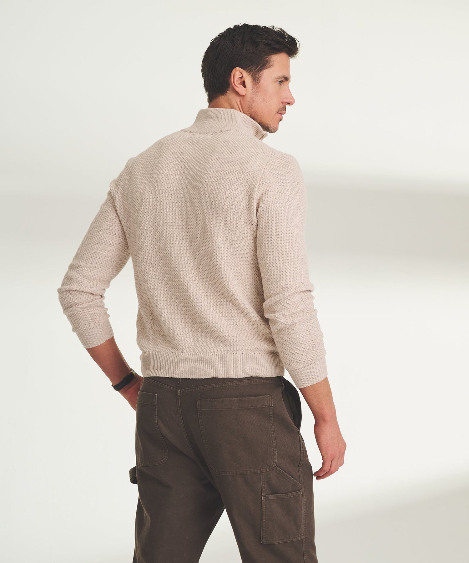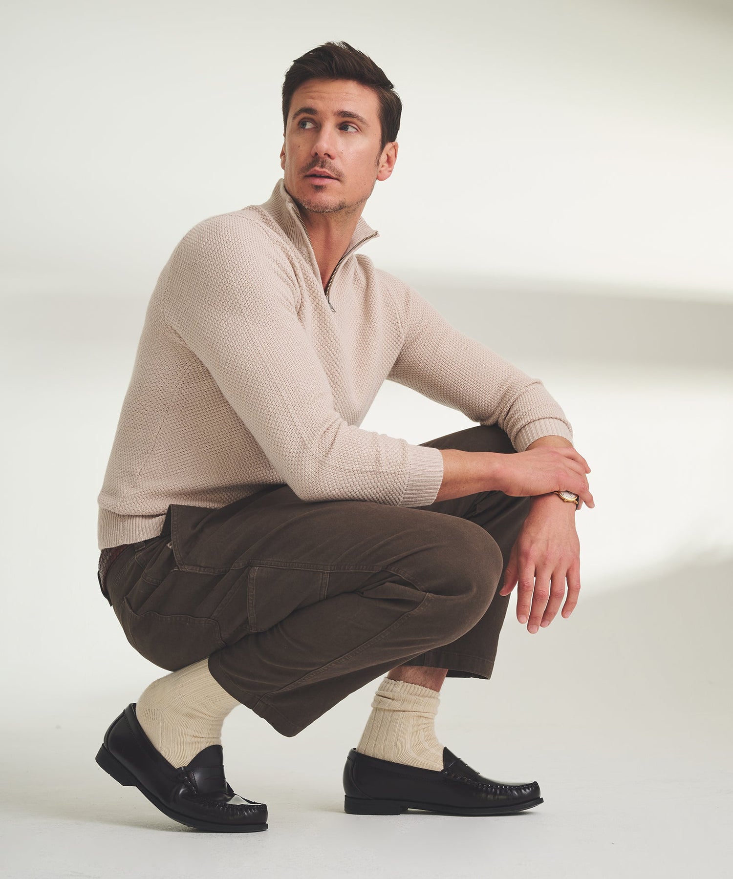 Boating season. The Textured Quarter Zip is a summer-friendly knit with a classic fit. It features a stand-up collar, quarter zip neckline, and breathable, all-over texture. Crafted from Chunky Modal: a cool and breathable yarn made from modal, cotton, and a hint of cashmere for unmatched softness.