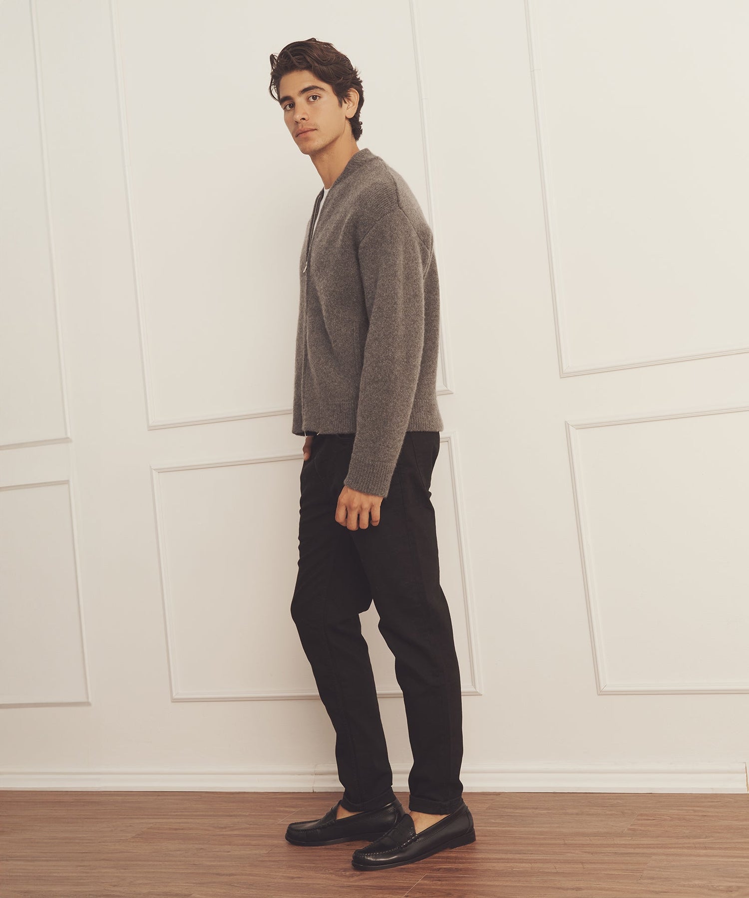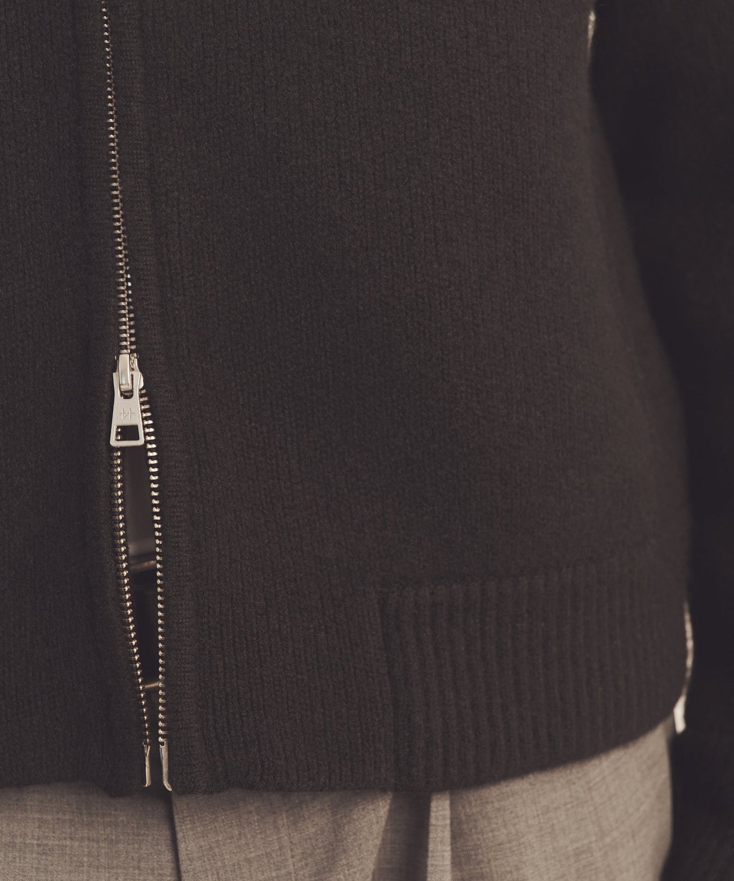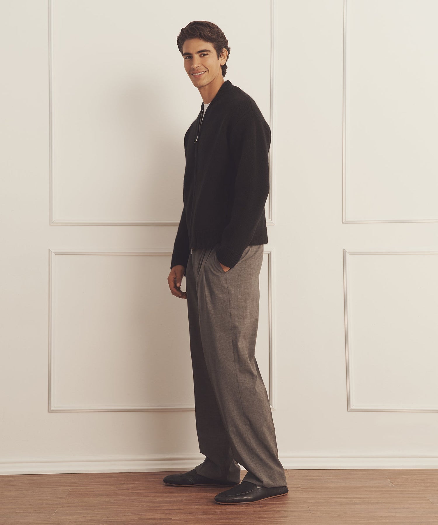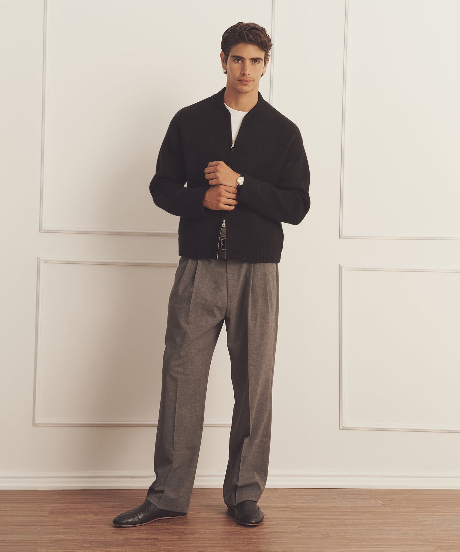 The Ultra Luxe Cashmere Bomber is a stylish sweater jacket with a relaxed classic fit. It features ribbed details, pockets, a zip front, and a bomber jacket silhouette. Crafted from 100% premium, sustainable cashmere.