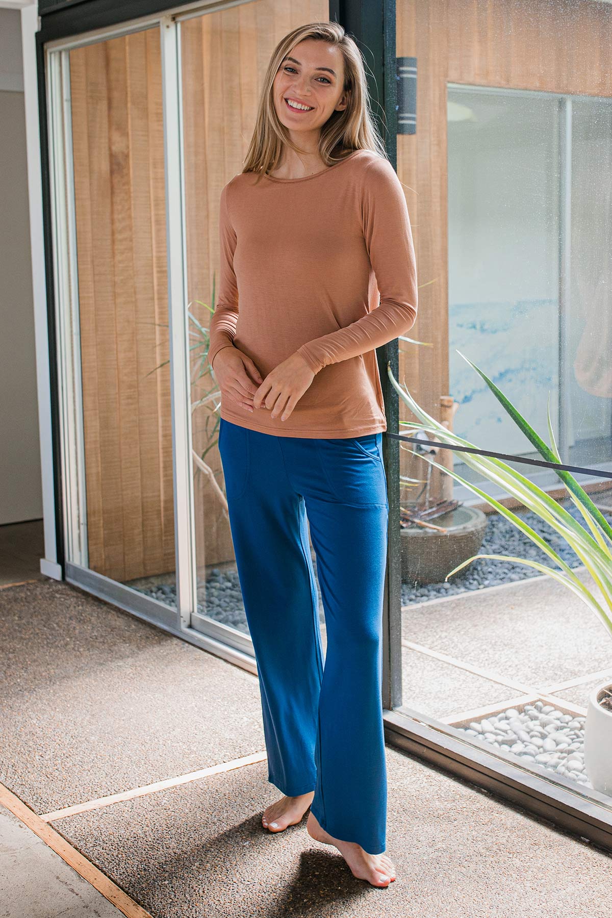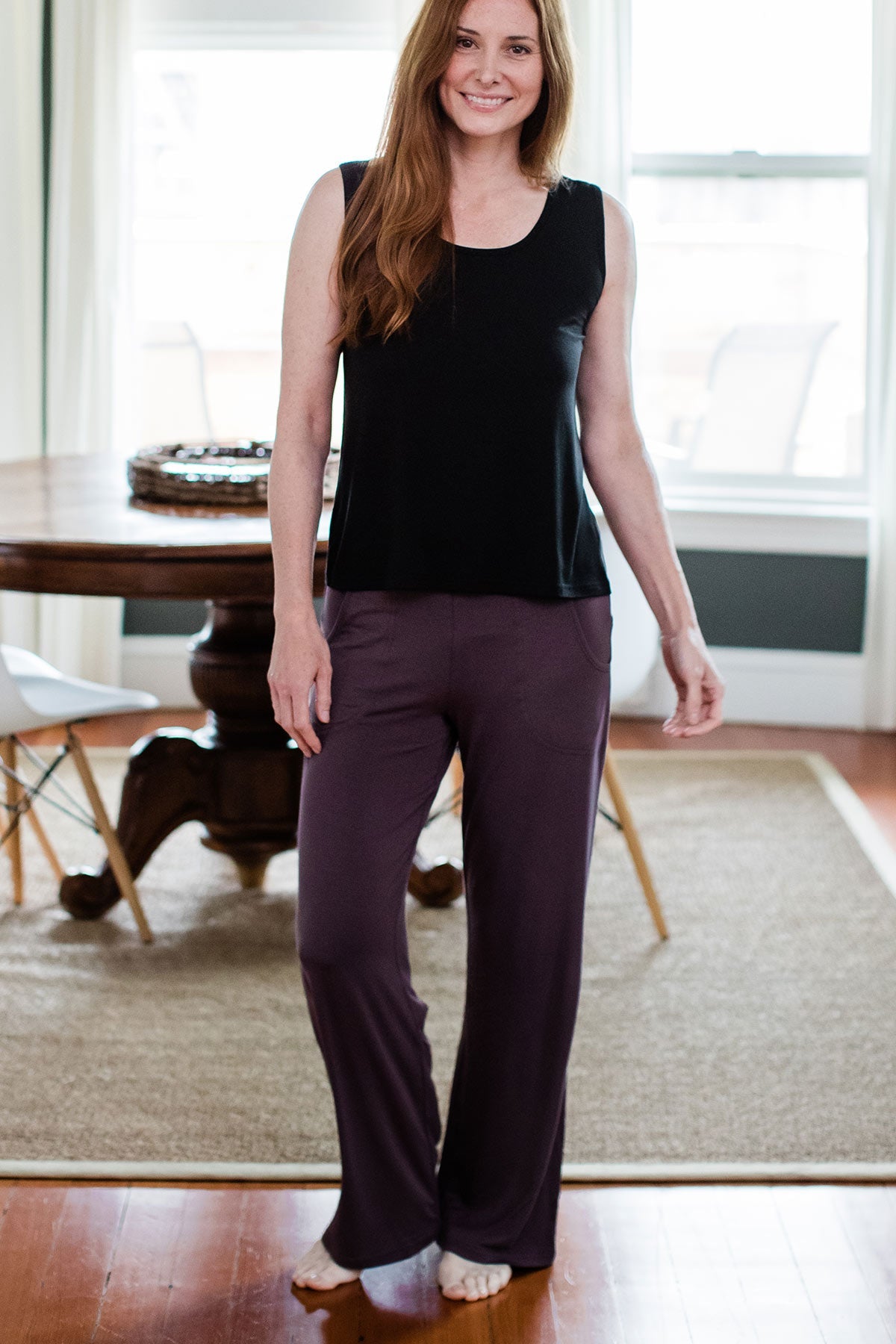 When you must get dressed for the day but crave the barely-there comfort of PJs, the Kayla Pant is where you'll find it. With a casual fold-over waist, loose-fitting flare leg, and deep side pockets, this bamboo pant is distinctly day wear, but just barely. 30" inseam.