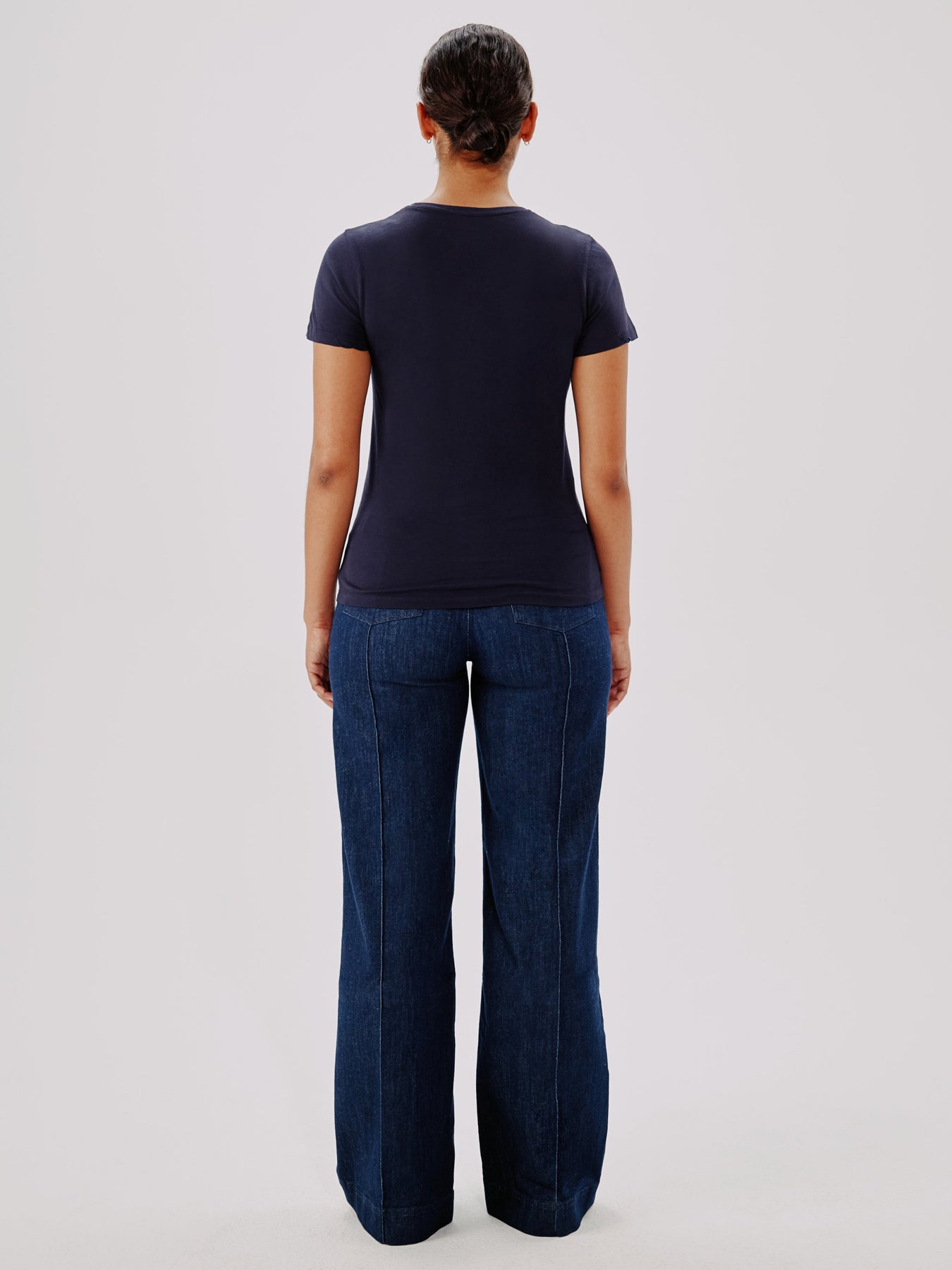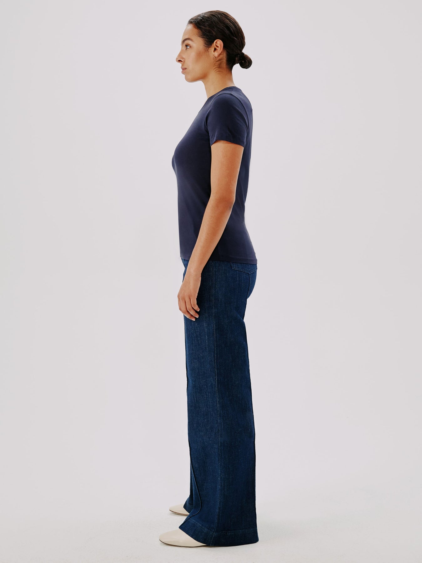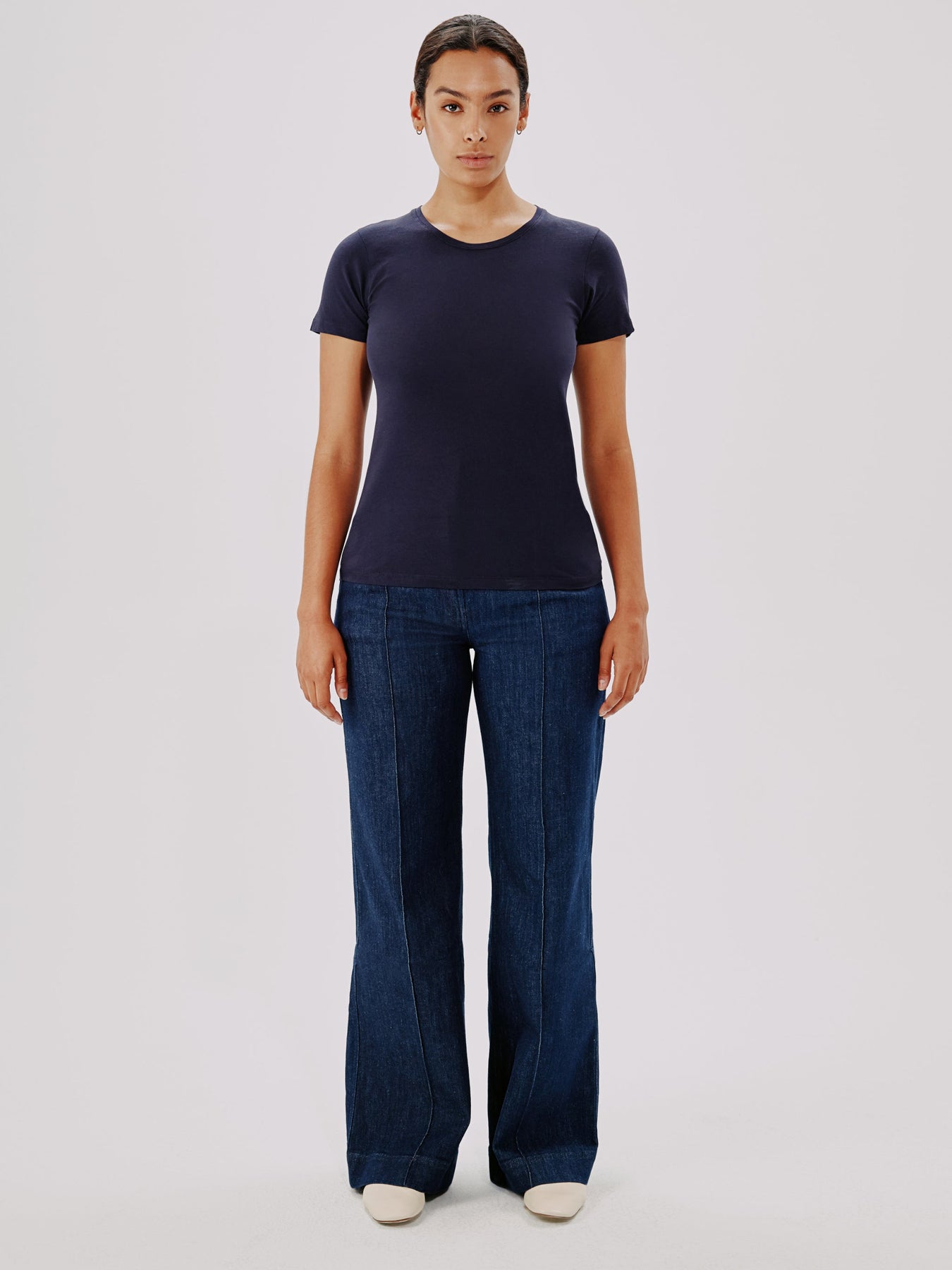 An essential, forever relevant silhouette, this slightly sheer, crewneck tee skims the body and features a light kick at the sleeve. Pair with the Single Pleat Pant for classic, refined casual.
