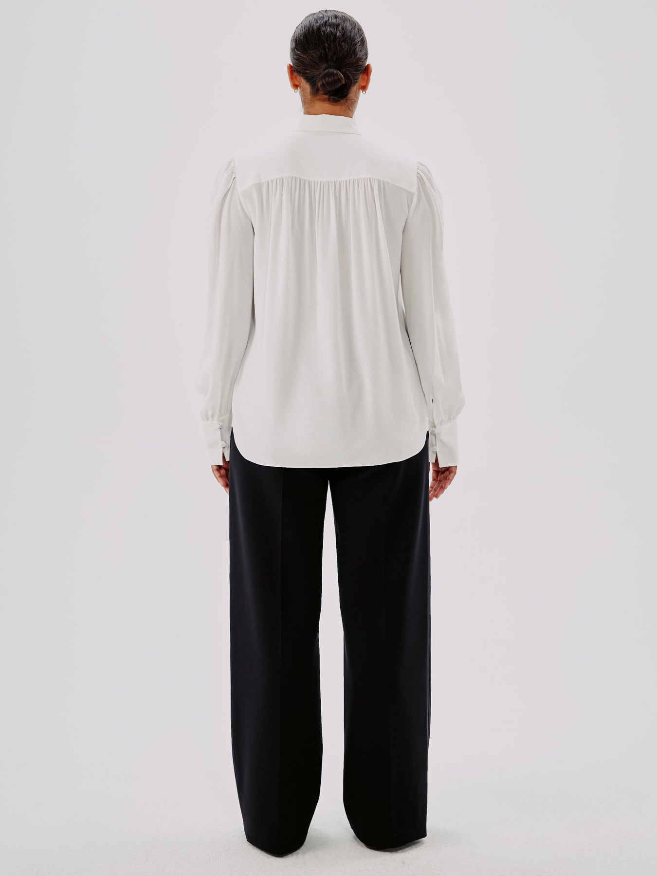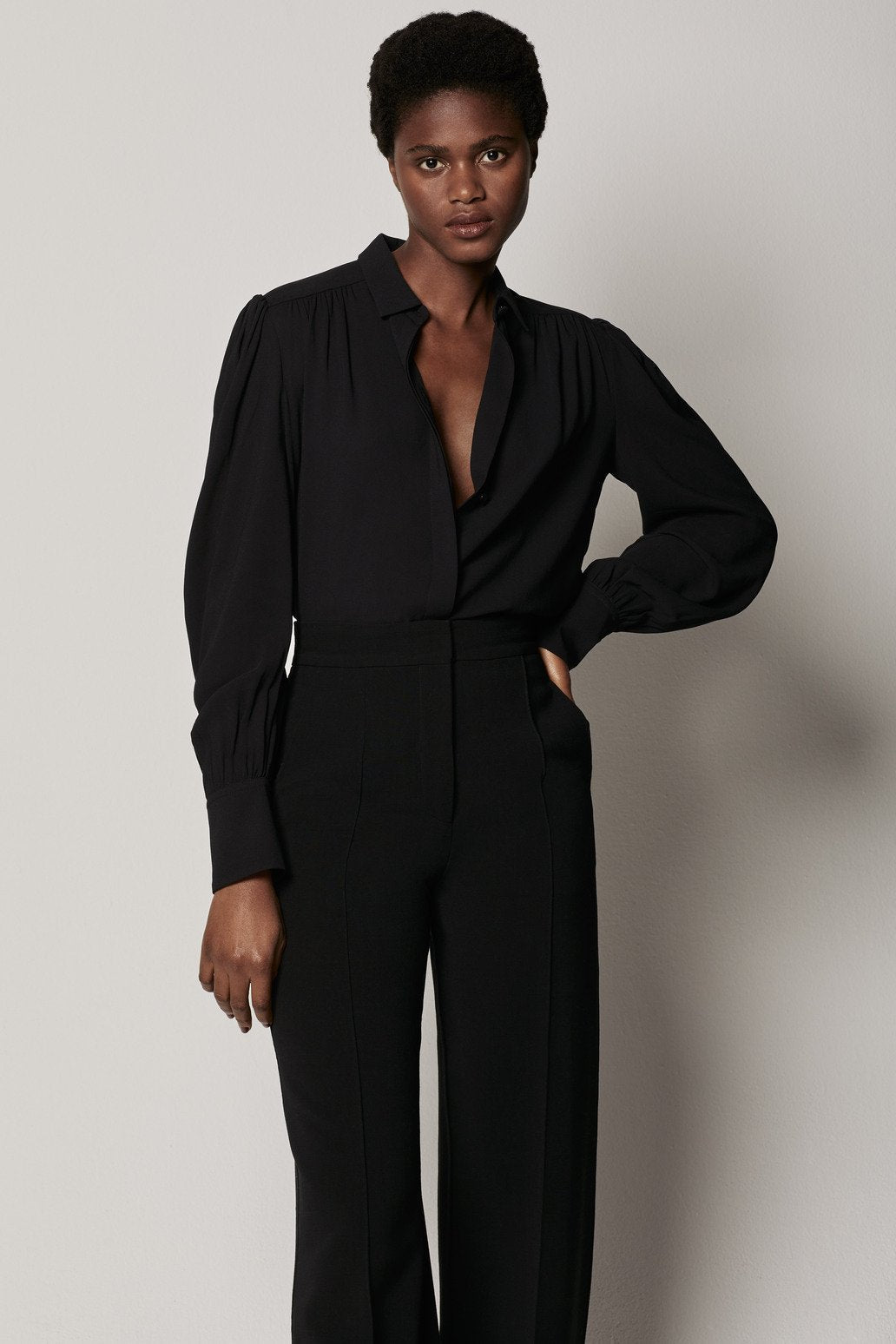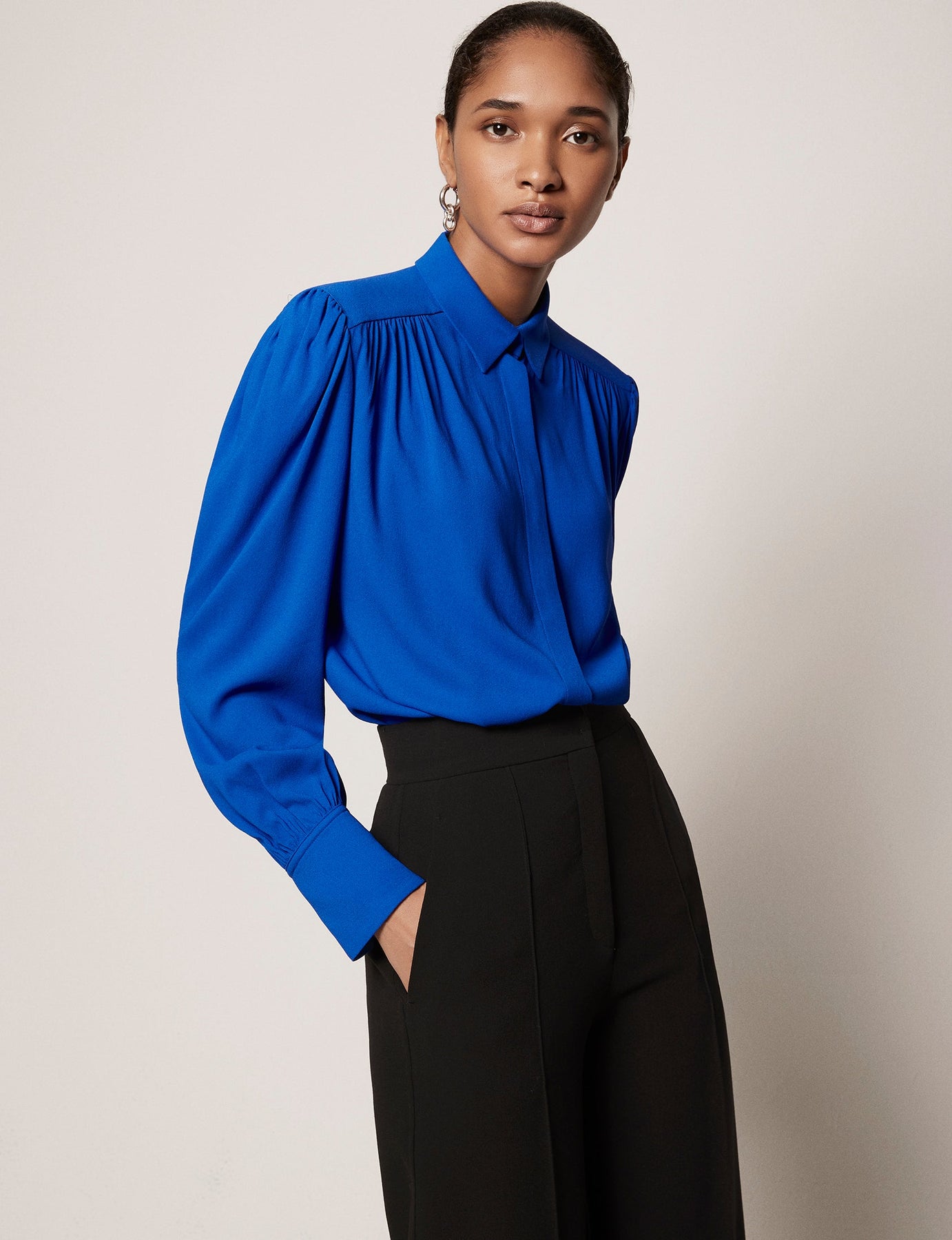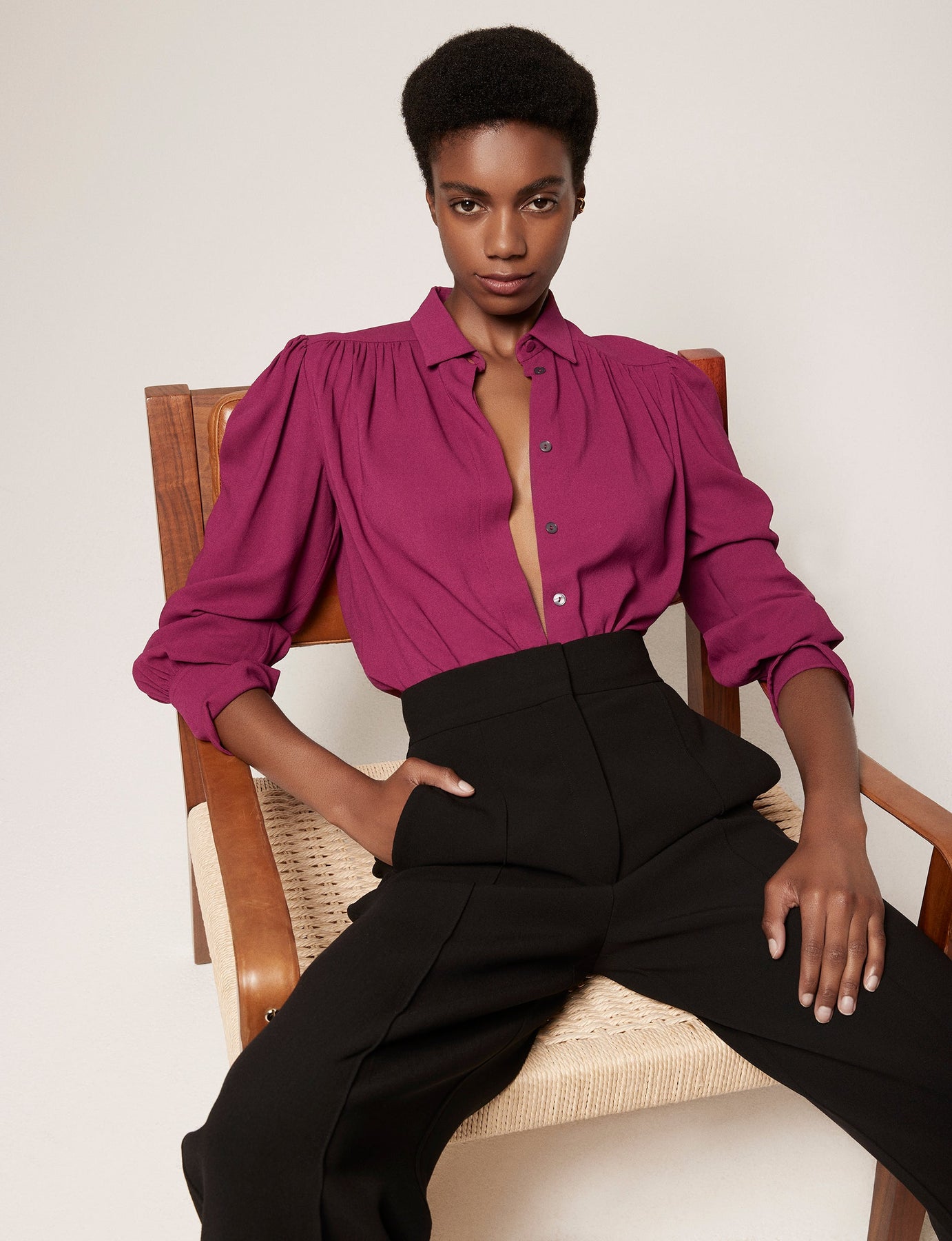 Elegant gathers throughout the body of this blouse and covered buttons at the cuff make this a detailed & impactful piece that can be dressed up or down. This style runs large; we recommend sizing down.