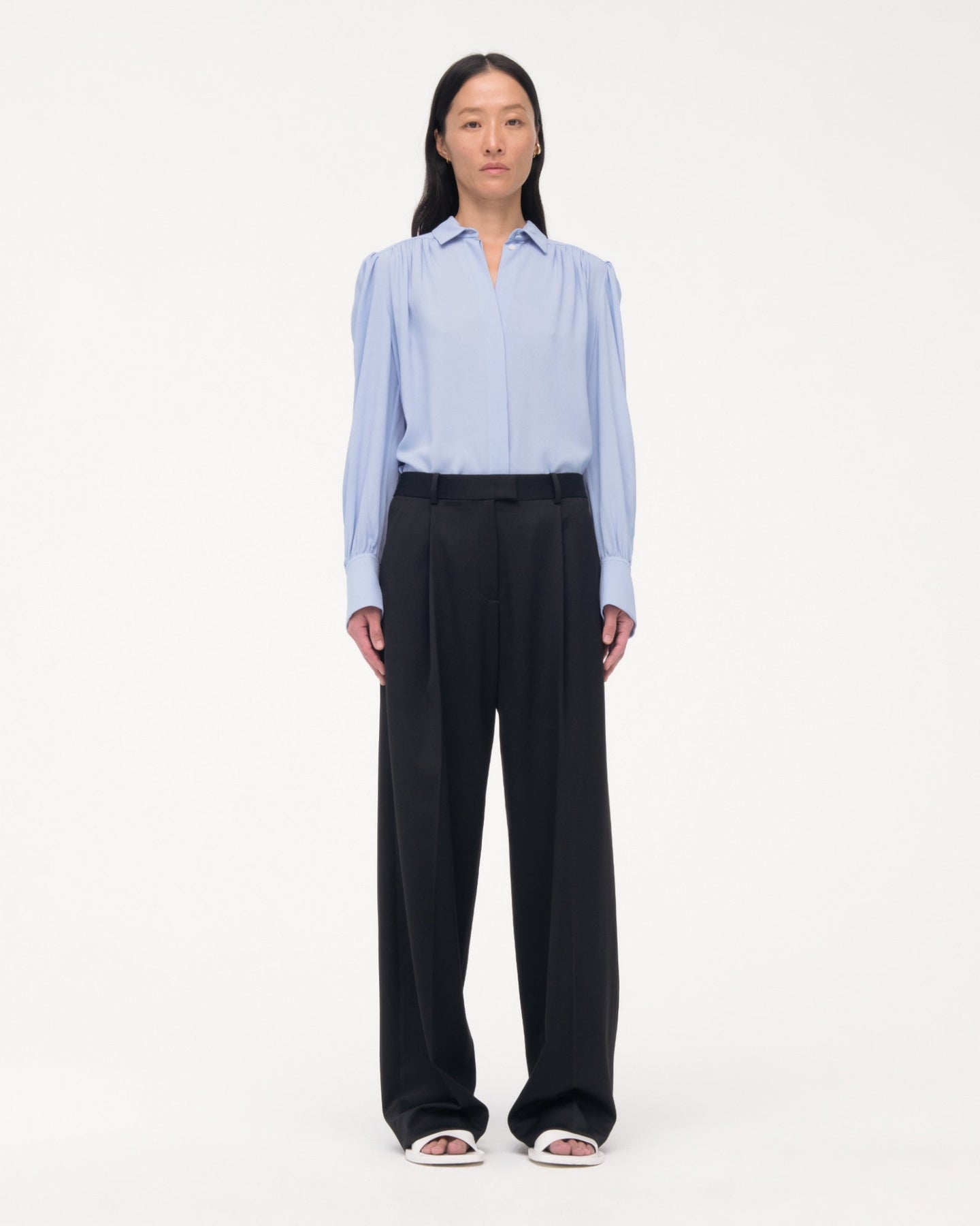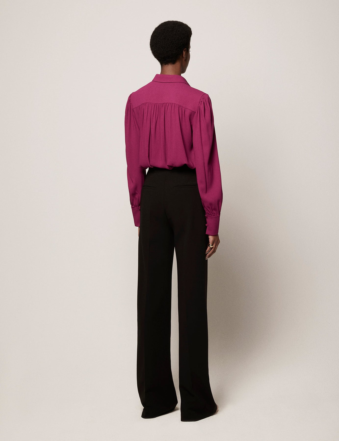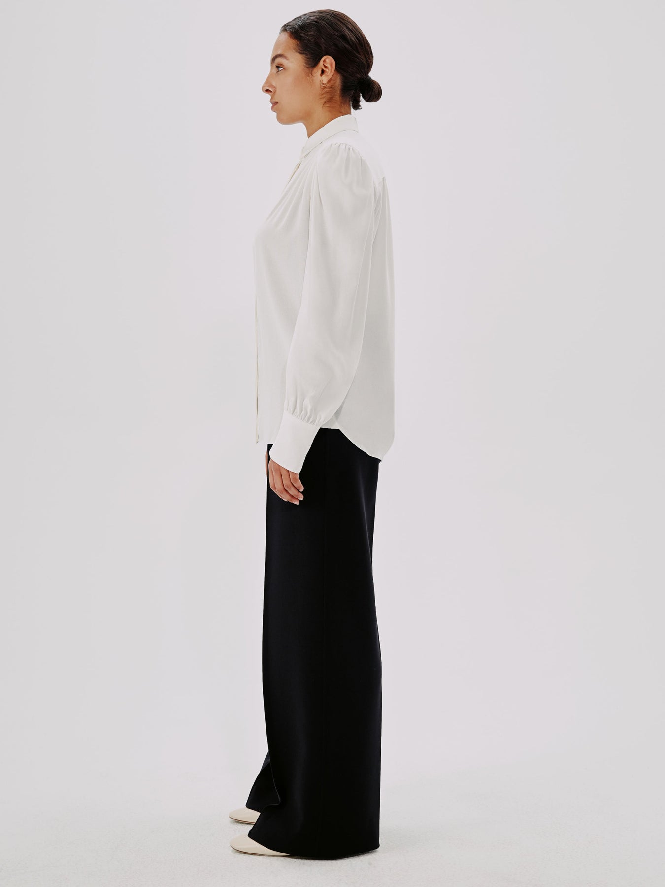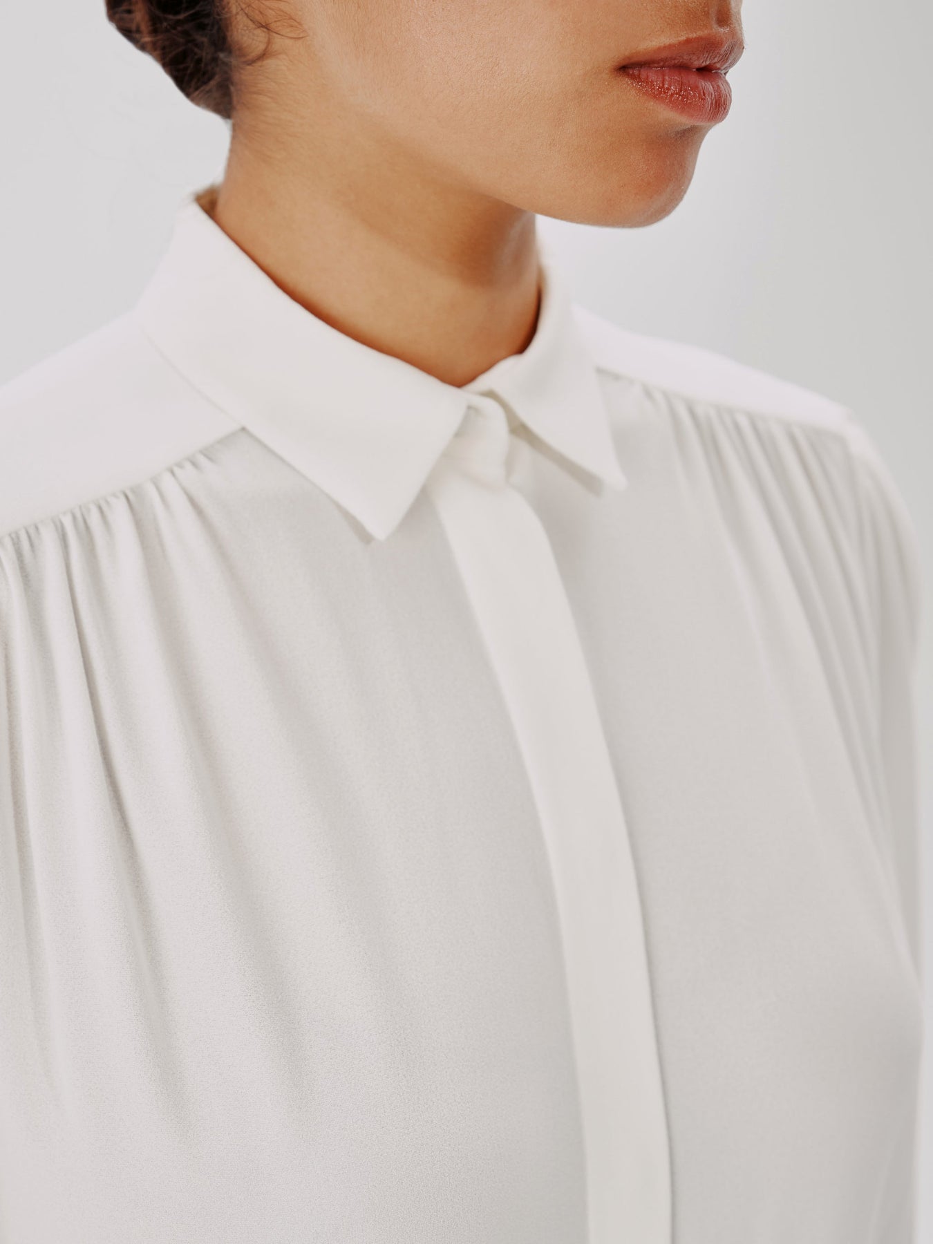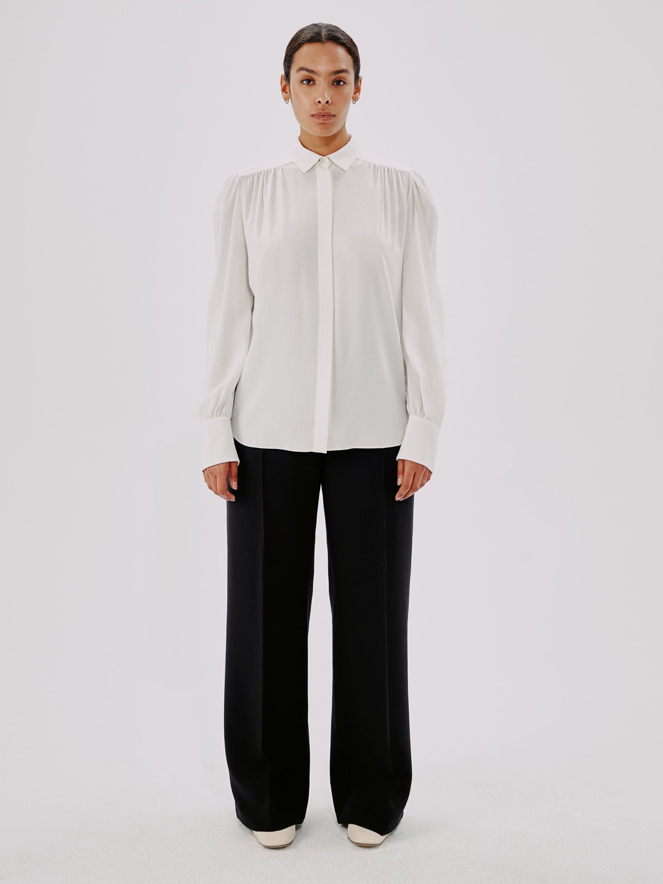 Elegant gathers throughout the body of this blouse and covered buttons at the cuff make this a detailed & impactful piece that can be dressed up or down. This style runs large; we recommend sizing down.