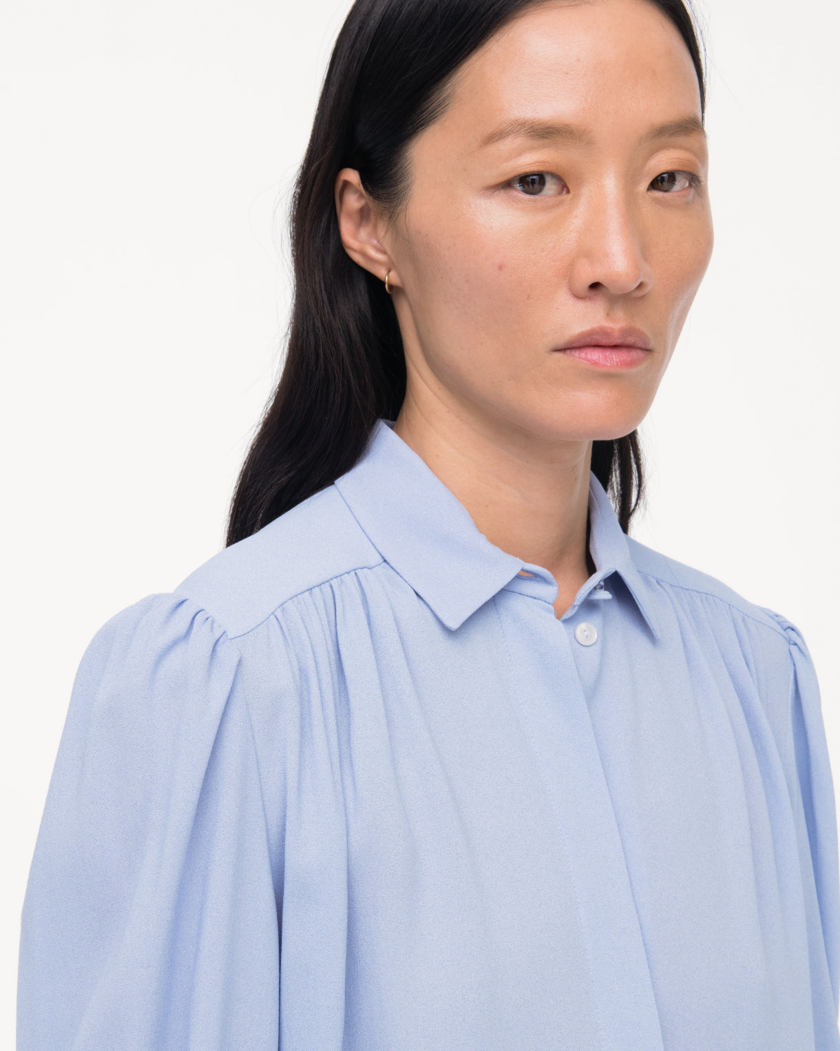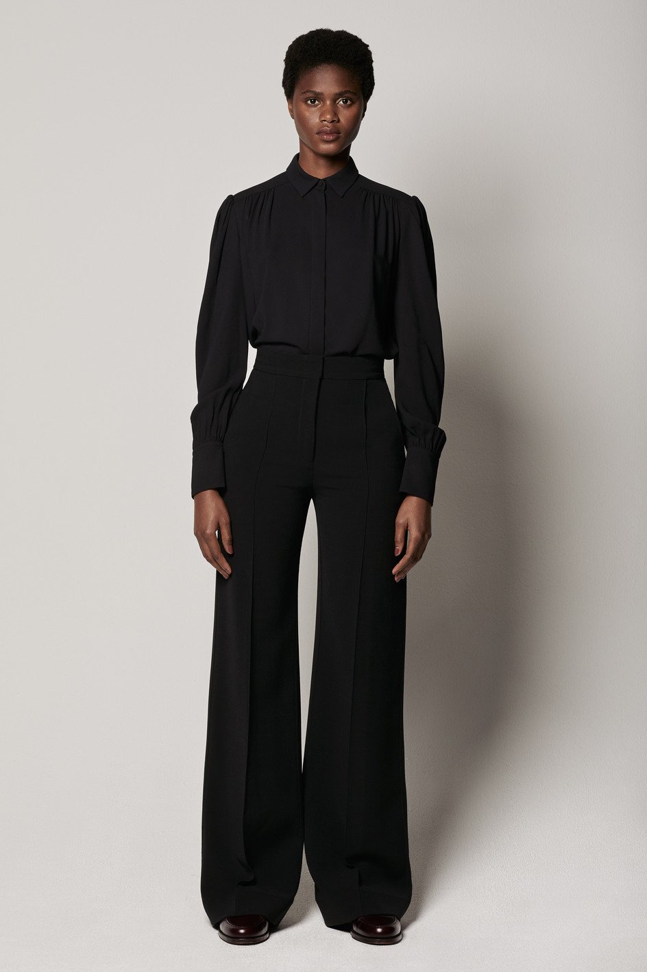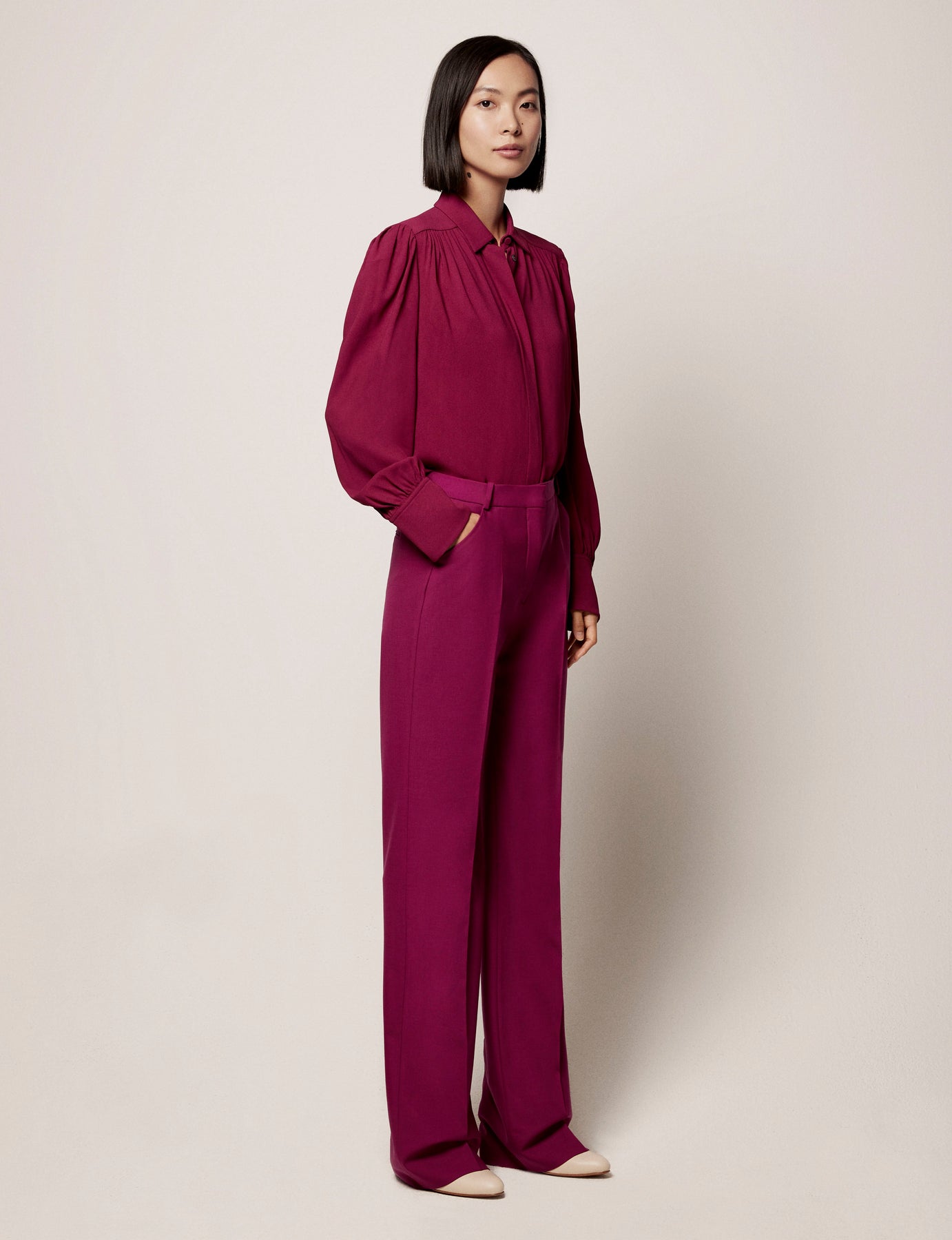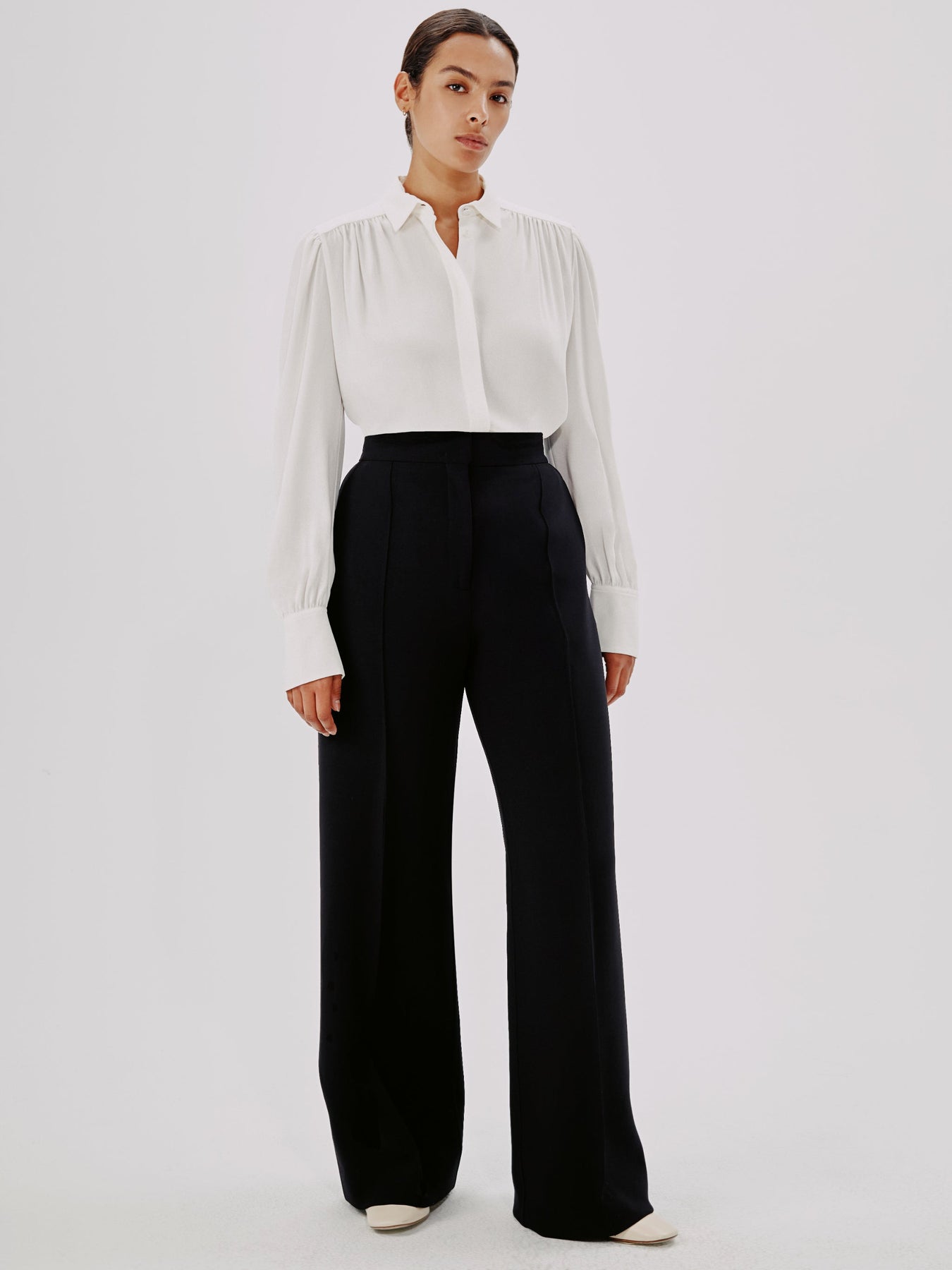 Elegant gathers throughout the body of this blouse and covered buttons at the cuff make this a detailed & impactful piece that can be dressed up or down. This style runs large; we recommend sizing down.