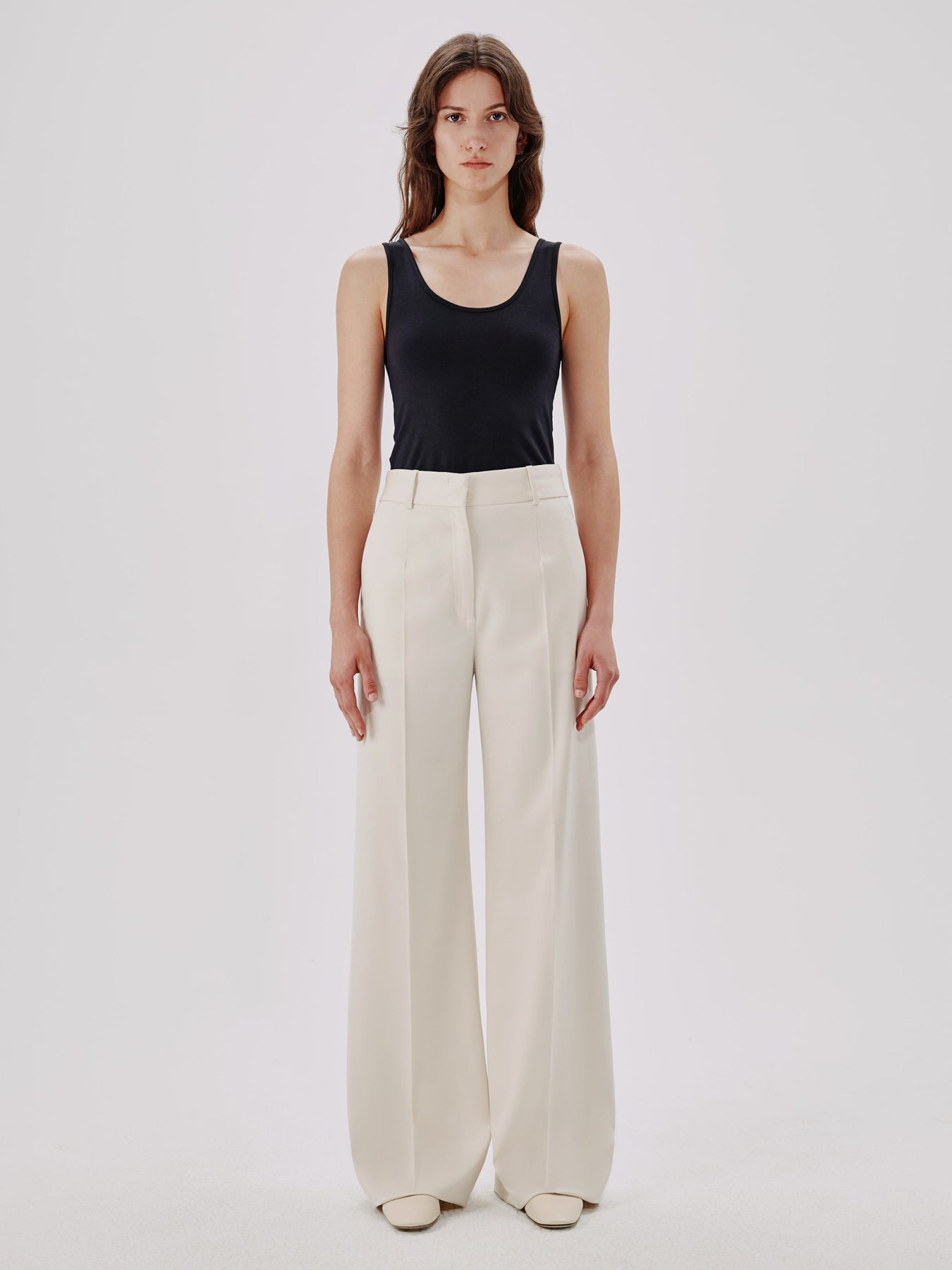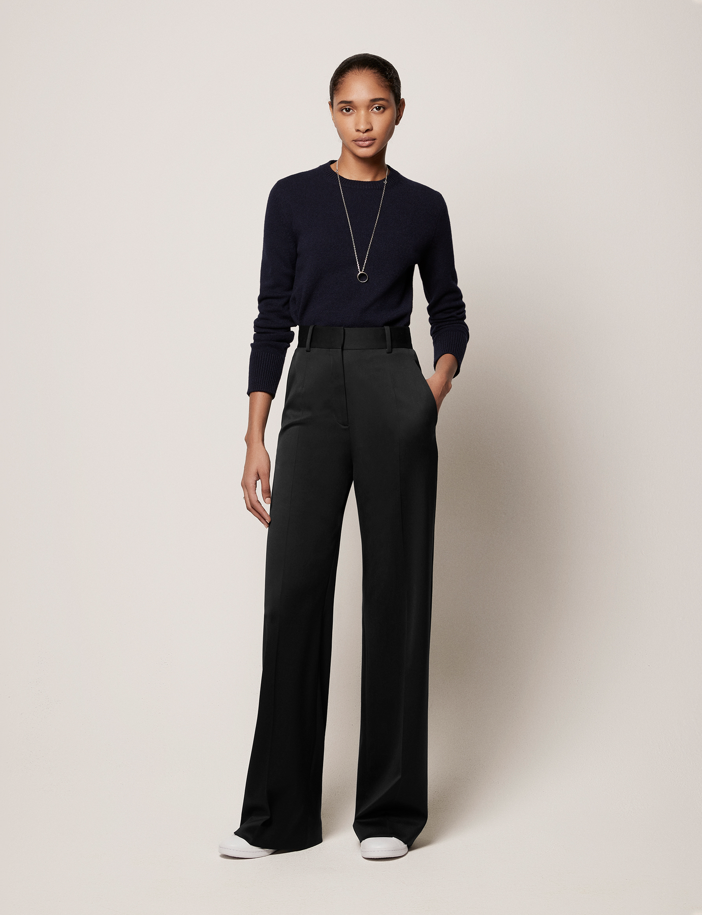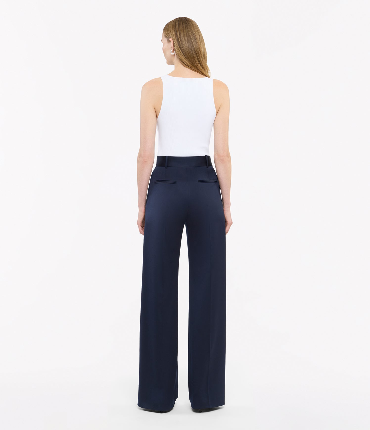 Our iconic Wide Leg Pant joins the classic tailoring lineup as a quintessential modern trouser. This high waisted style sits at the true waist and falls full-length down the leg, elongating the body. The style runs small, and we recommend sizing up.