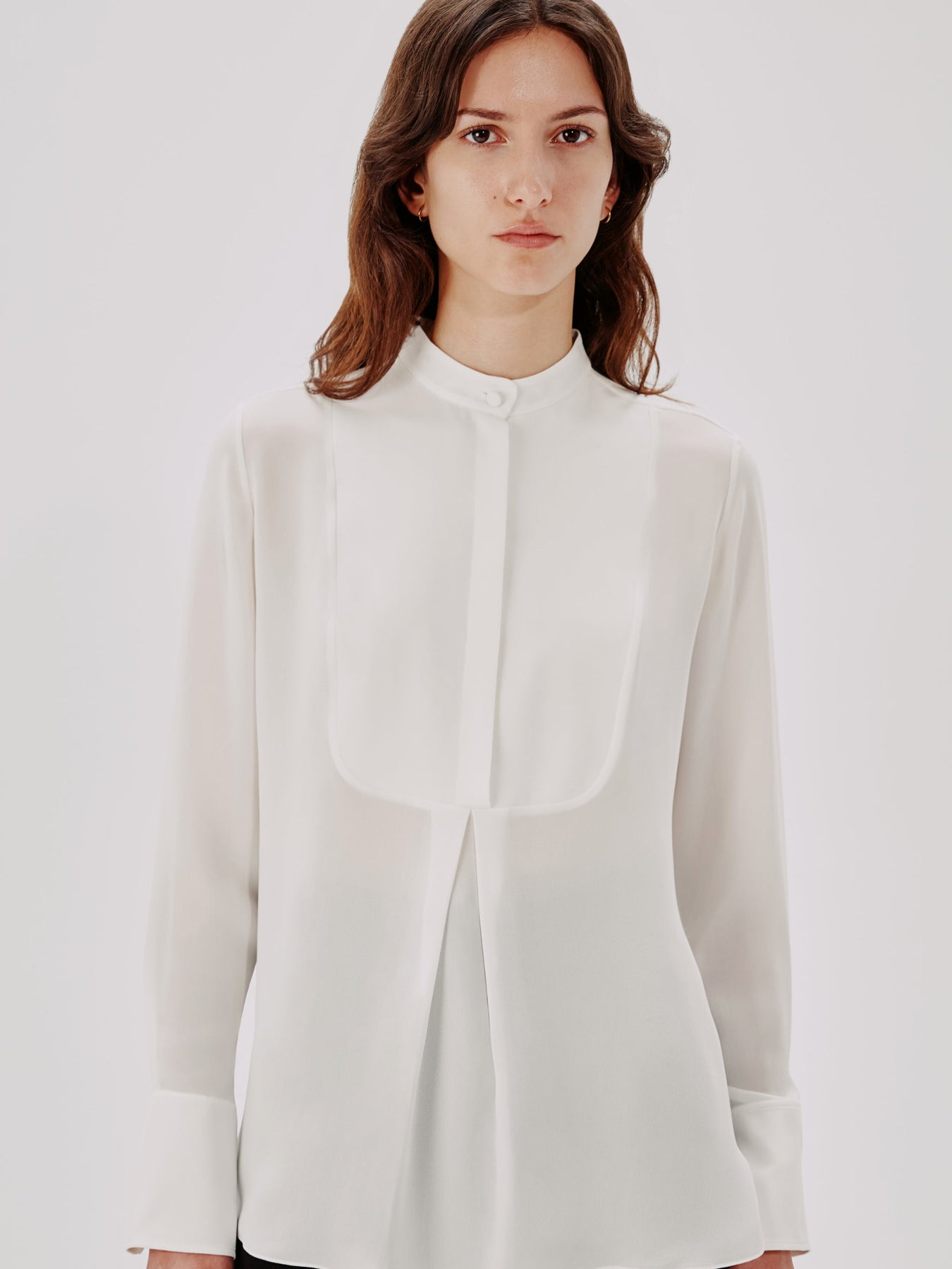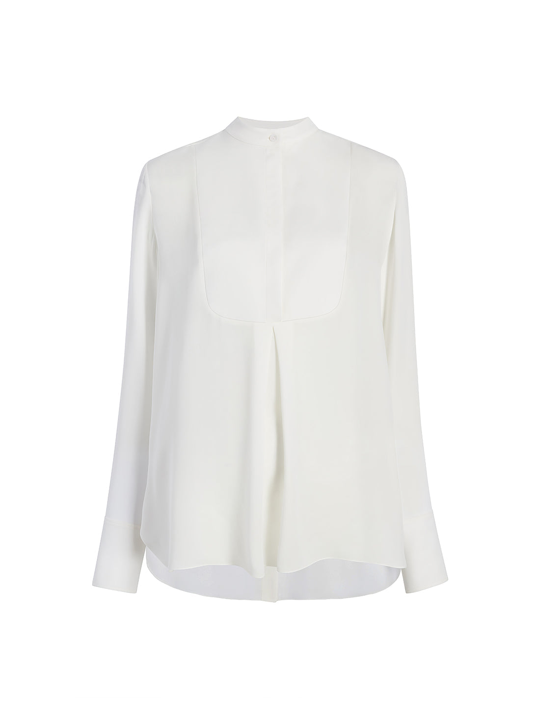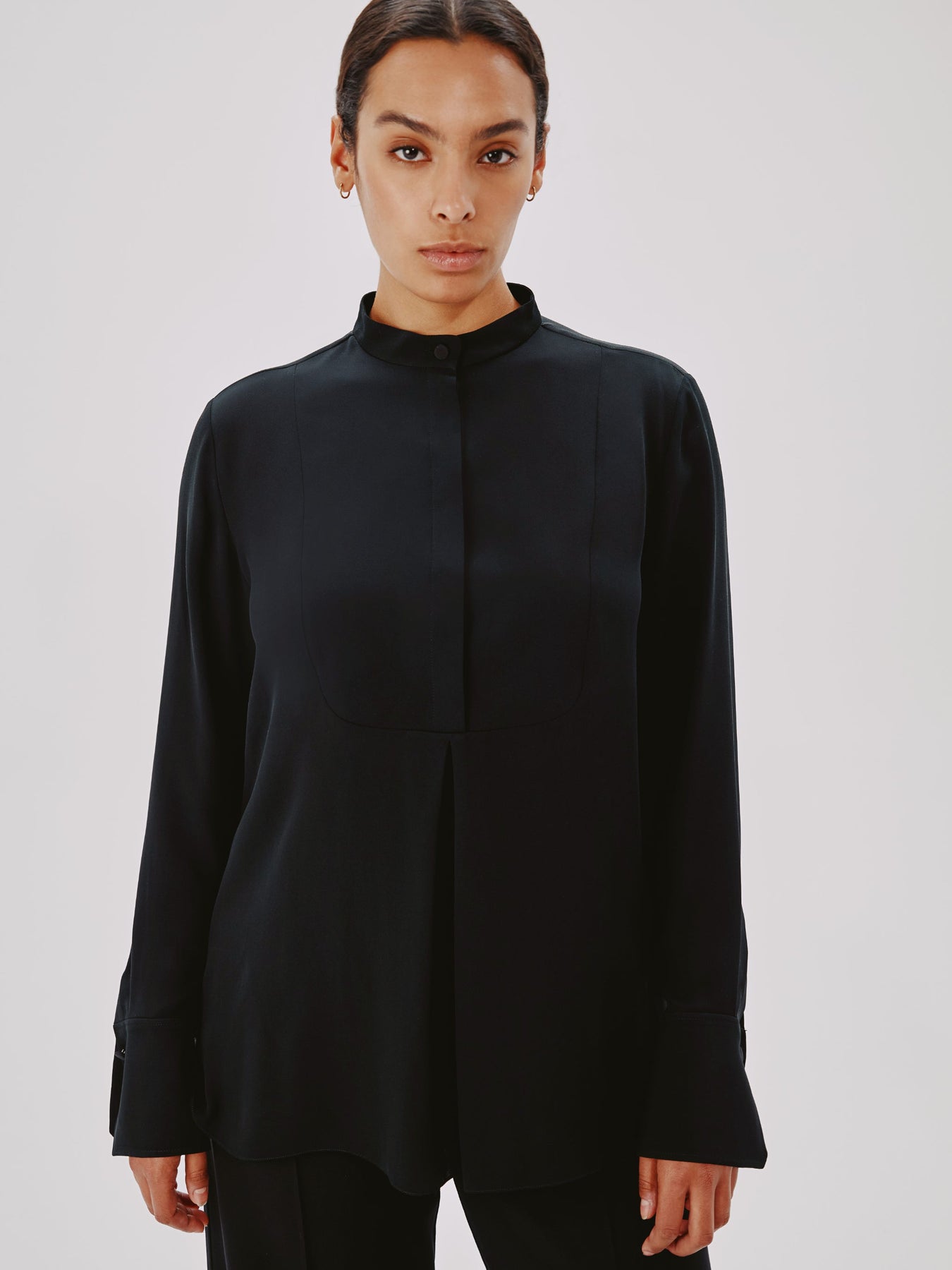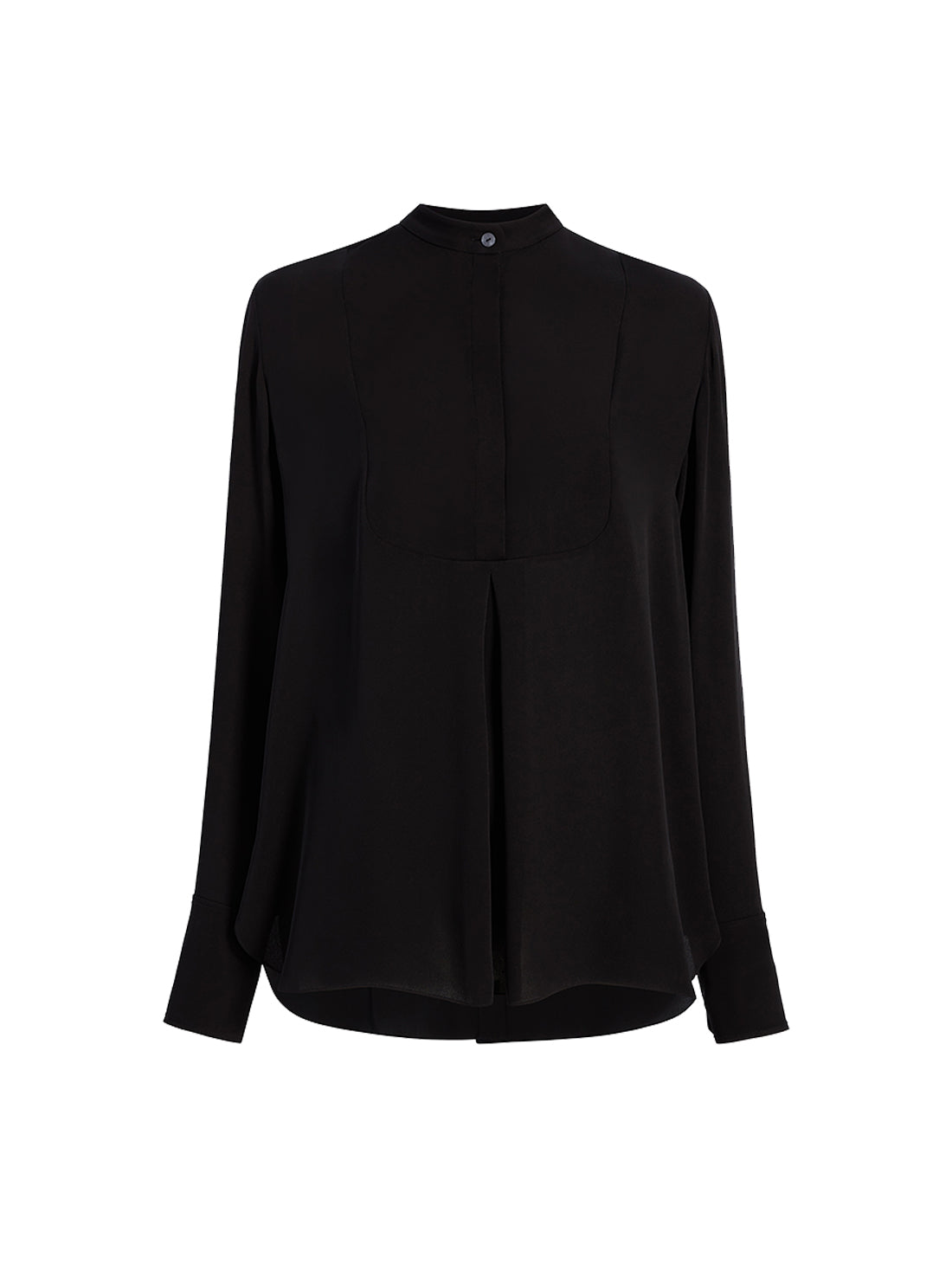 This blouse pulls inspiration from classic menswear, complete with a mandarin collar bib and pleating detail. The concealed button placket can be worn open to reveal the button details, or closed.