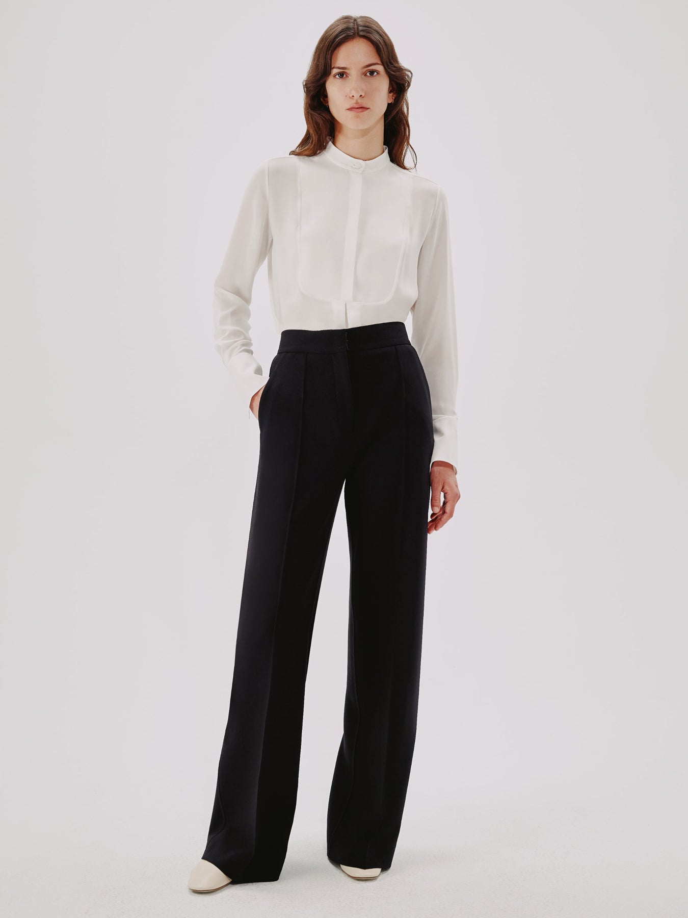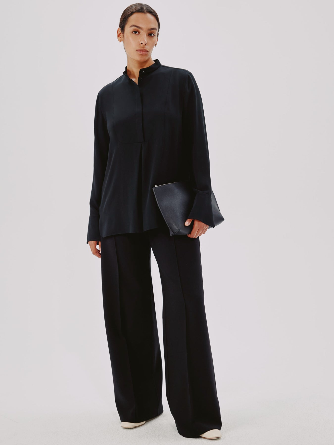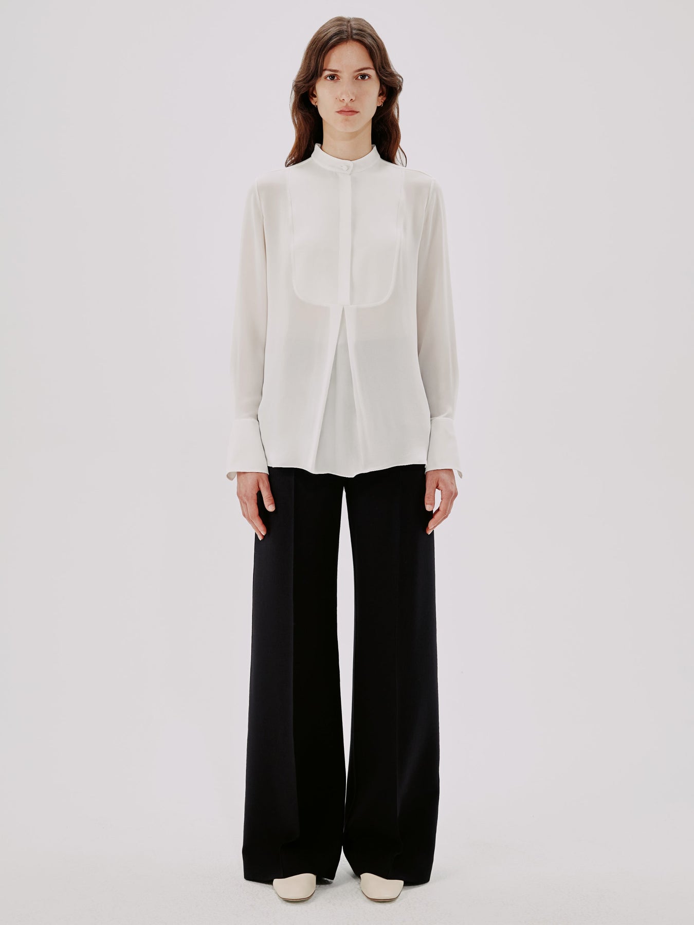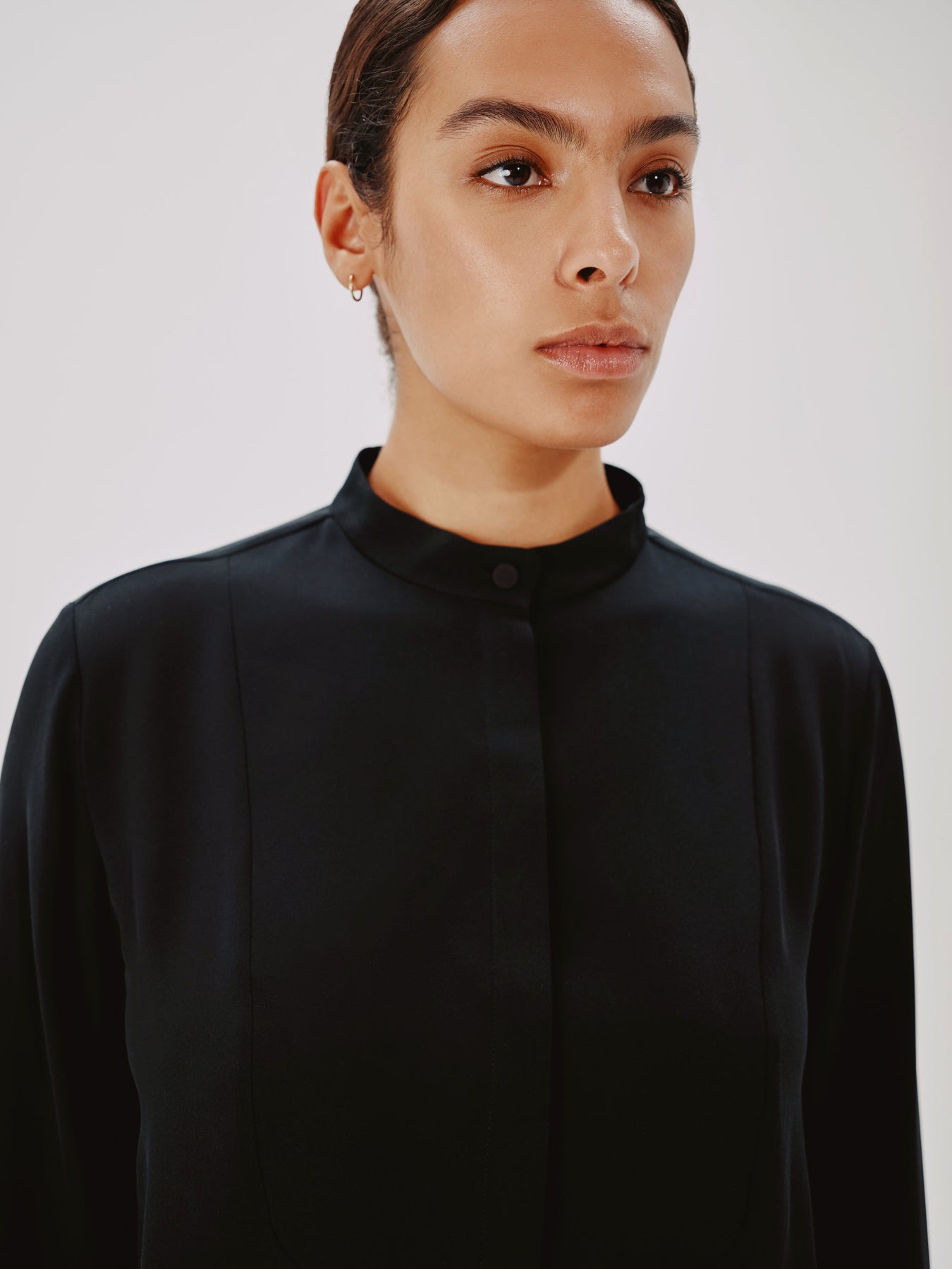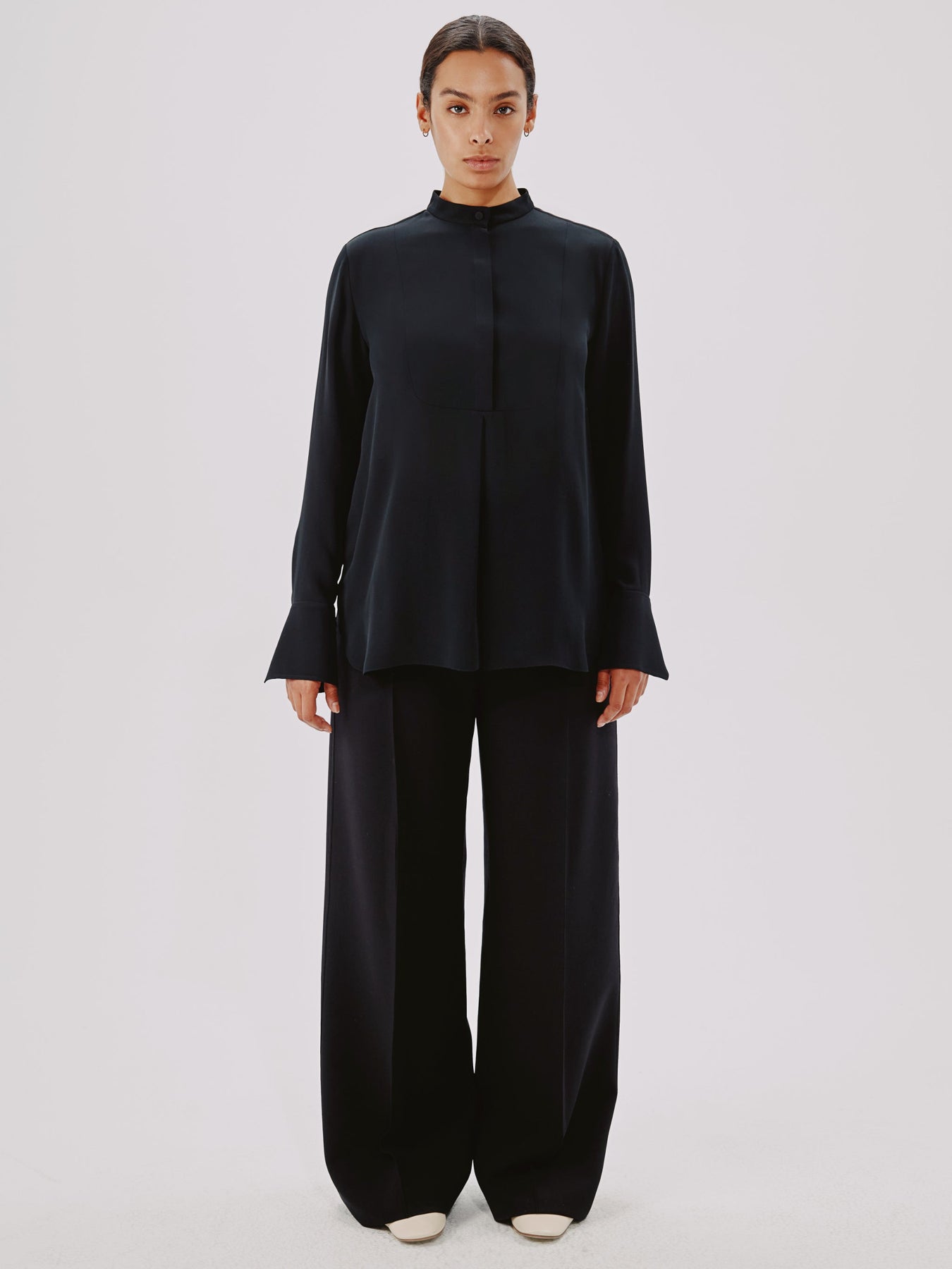 This blouse pulls inspiration from classic menswear, complete with a mandarin collar bib and pleating detail. The concealed button placket can be worn open to reveal the button details, or closed.