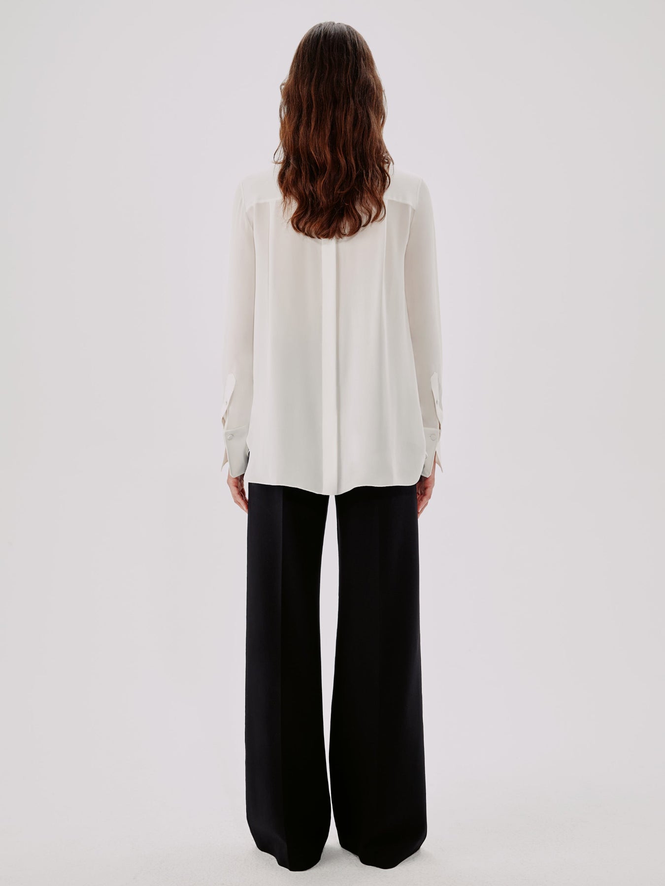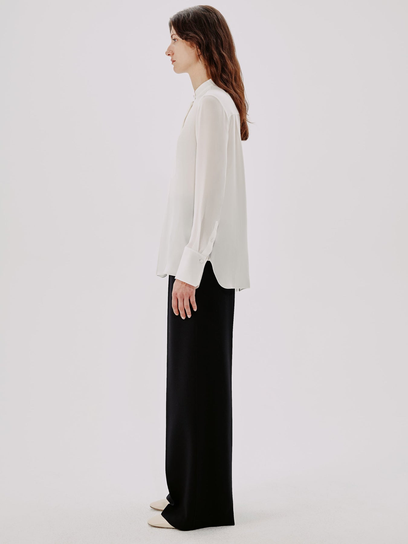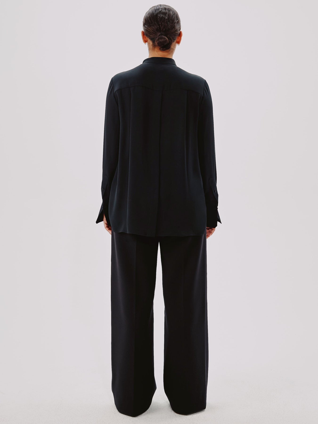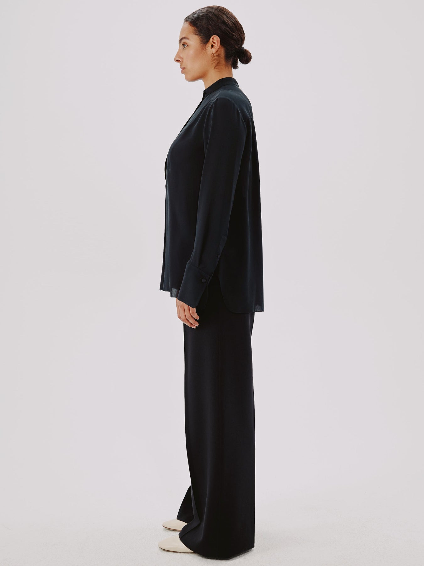 This blouse pulls inspiration from classic menswear, complete with a mandarin collar bib and pleating detail. The concealed button placket can be worn open to reveal the button details, or closed.