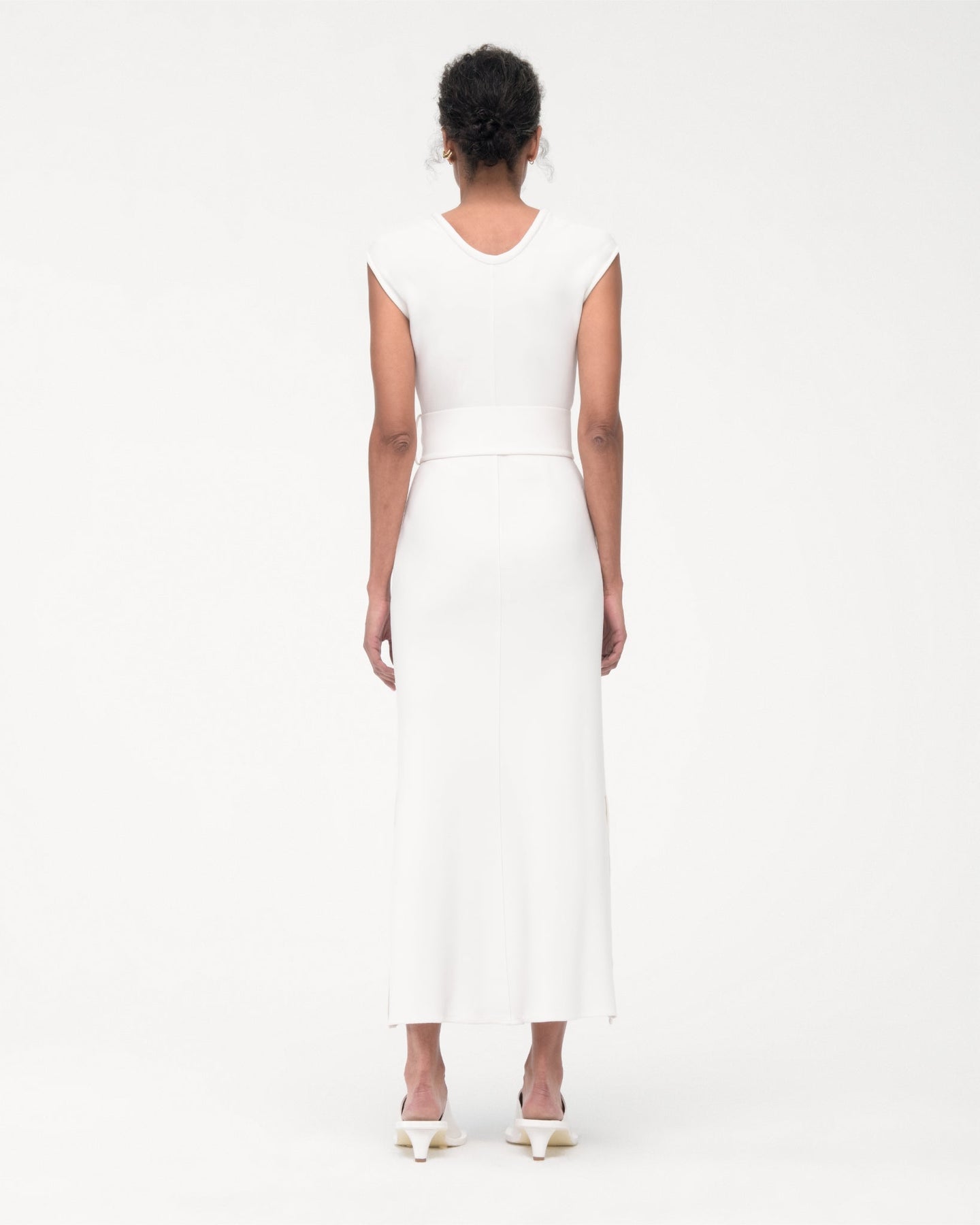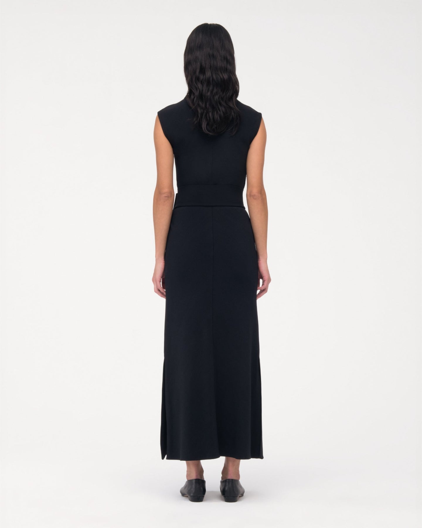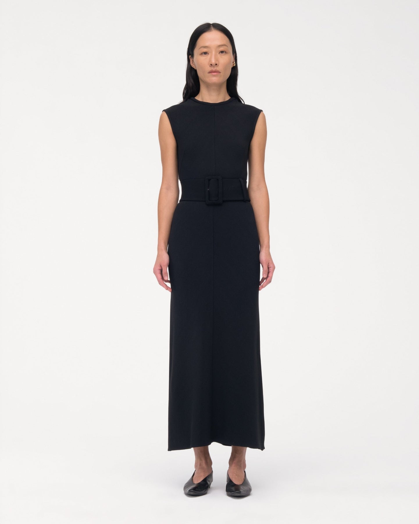 Wear this slip-on, ankle-length dress with the self-belt to create an empire waist or without for a clean silhouette. Features a u back neckline with puffed binding. For a dynamic, monochrome outfit, pair with the Convertible Trench.