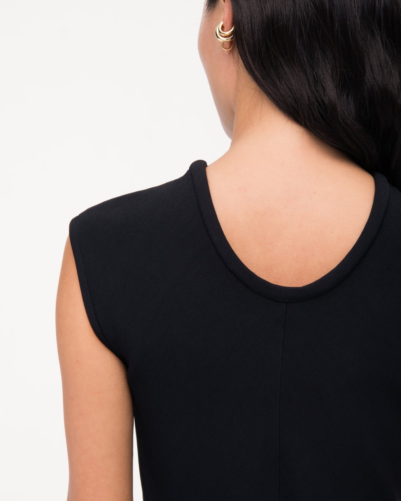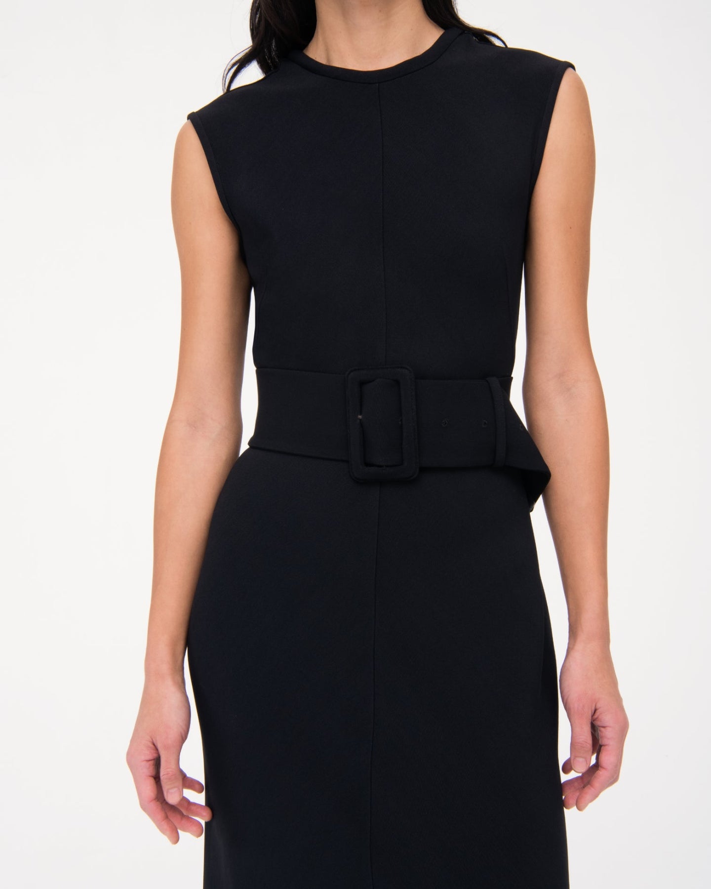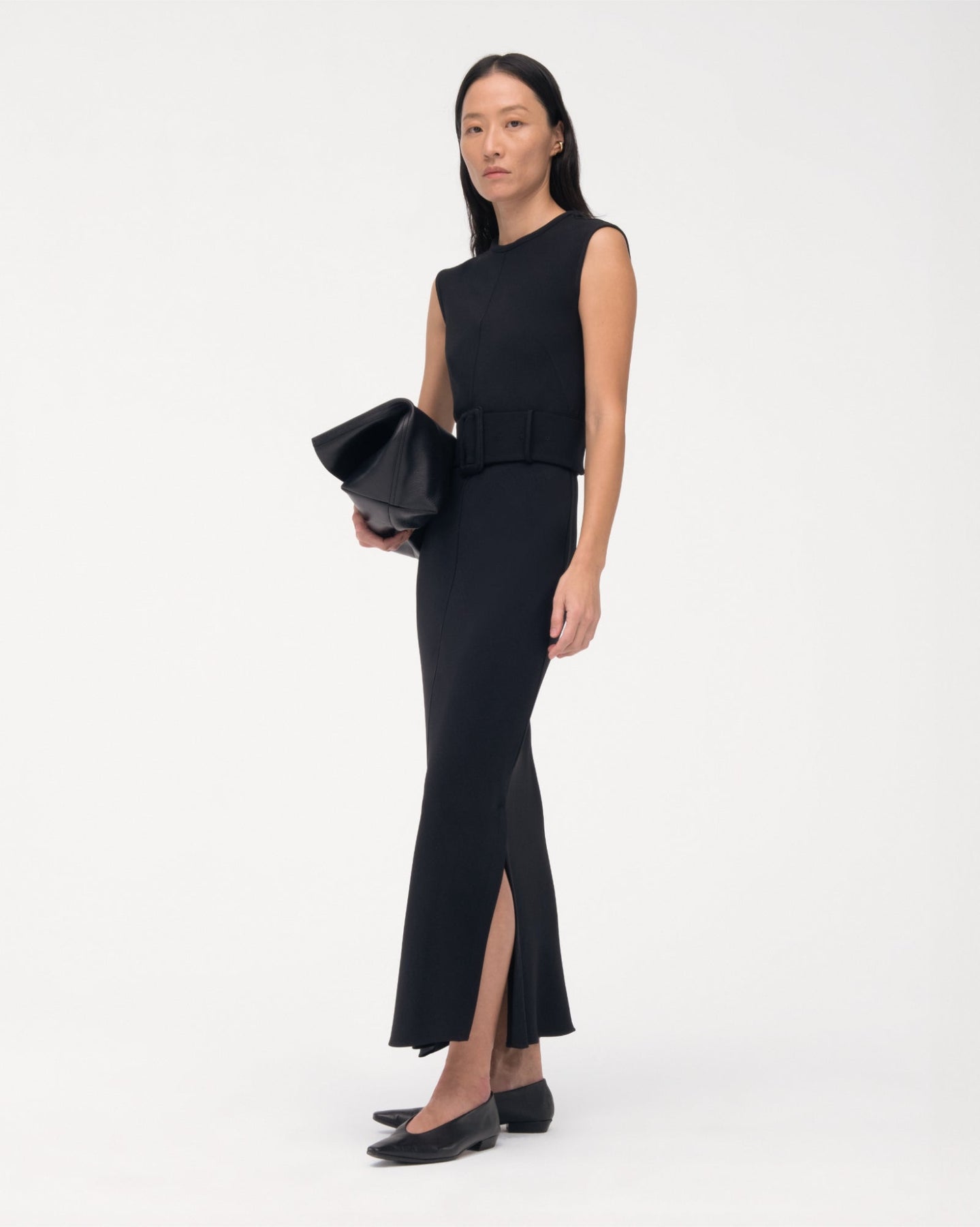Wear this slip-on, ankle-length dress with the self-belt to create an empire waist or without for a clean silhouette. Features a u back neckline with puffed binding. For a dynamic, monochrome outfit, pair with the Convertible Trench.