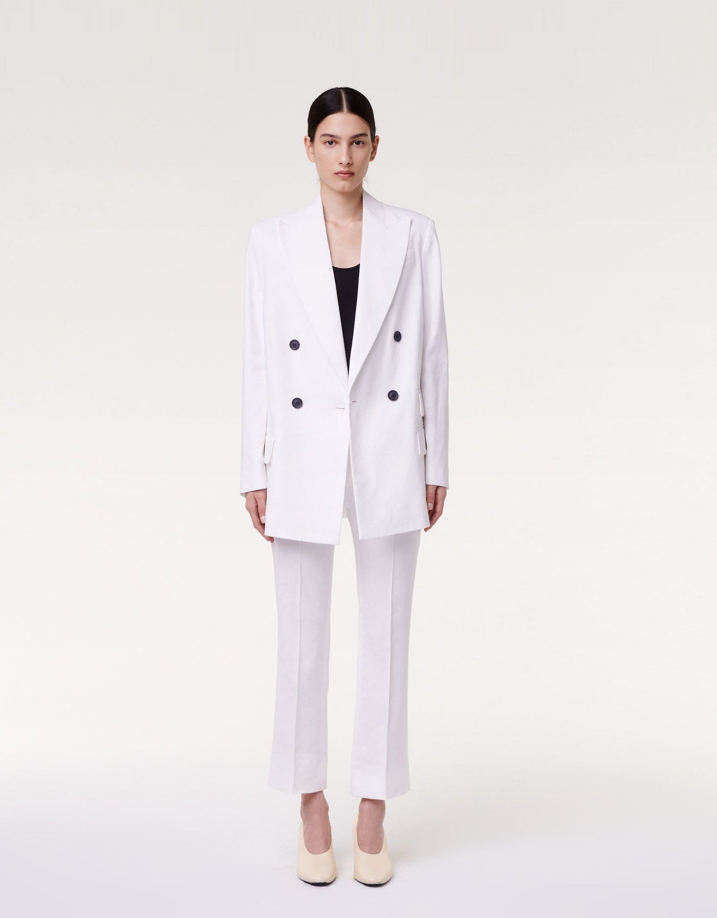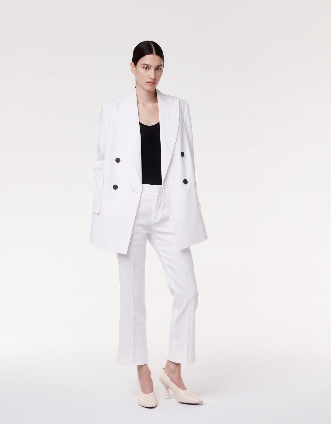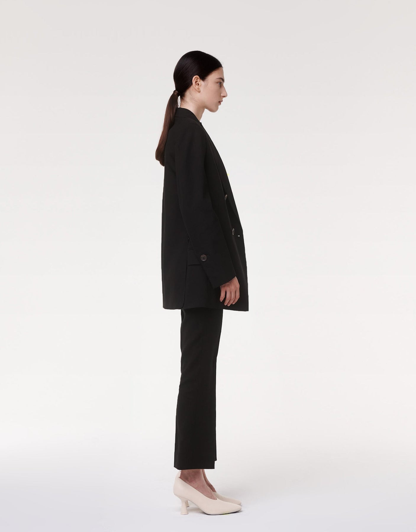 Invisible zippers at the back side panel can create slit details in this double-breasted style. Features corozo buttons at the sleeve vents and as the front closures. Pair with the Belted Tailored Vest or Crop Flare Trouser.