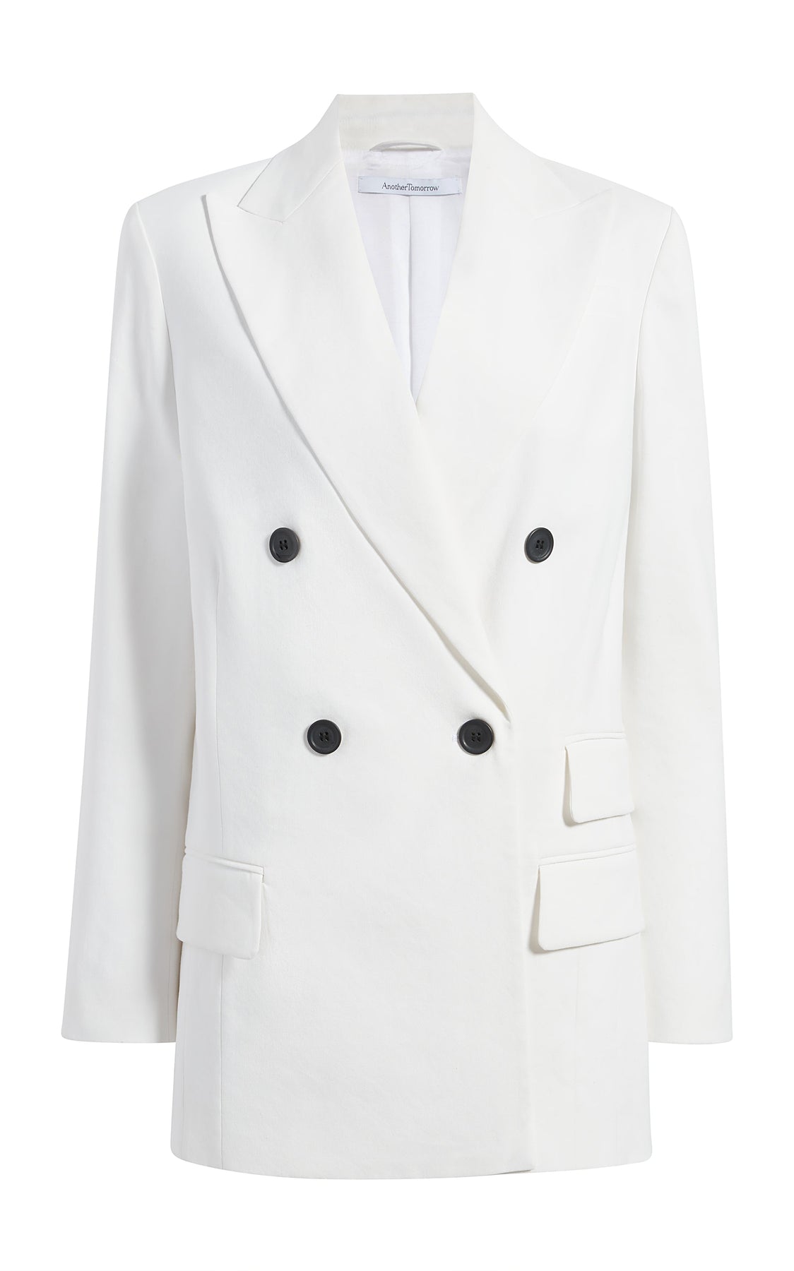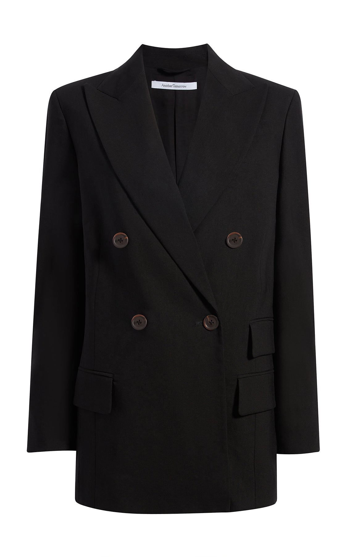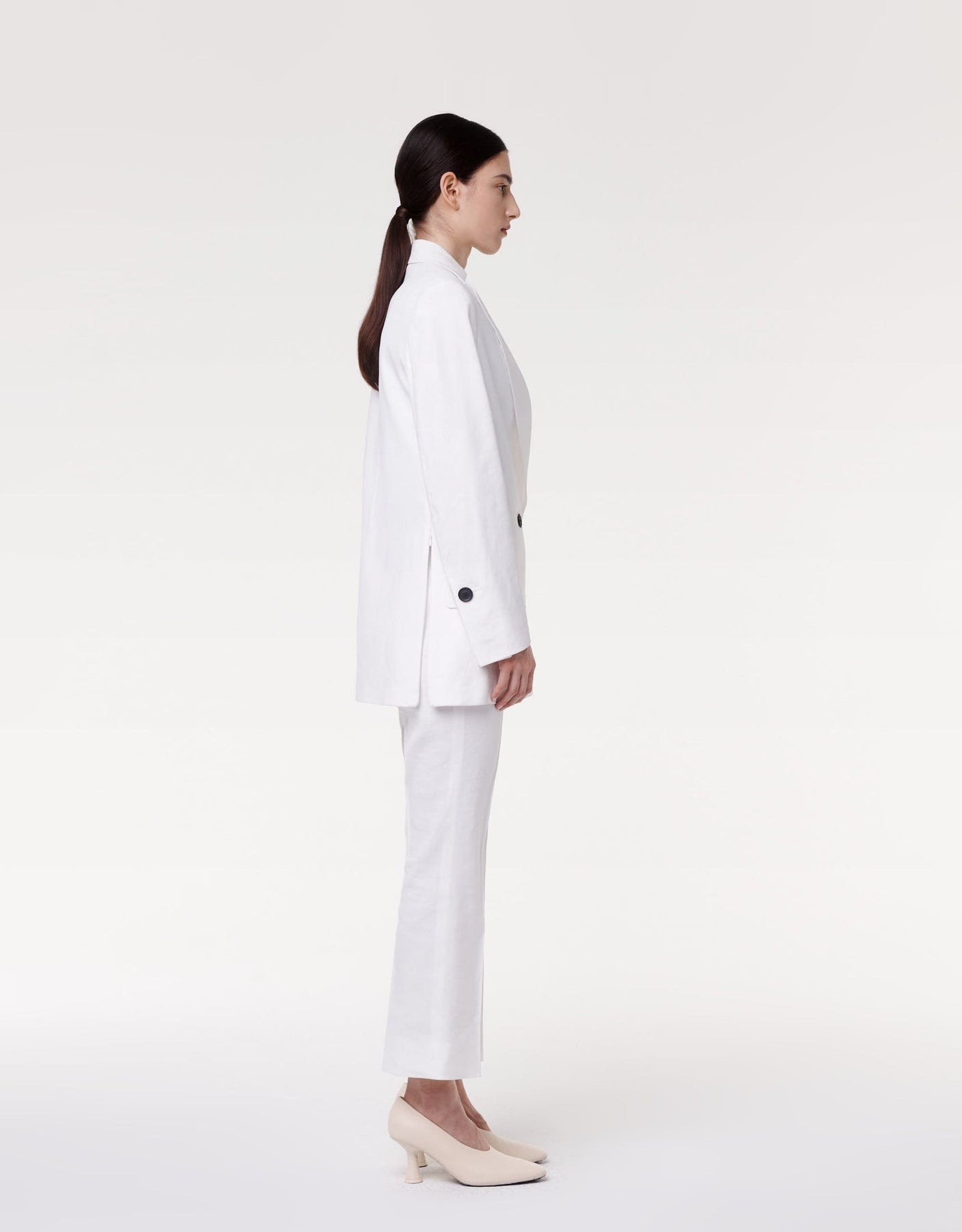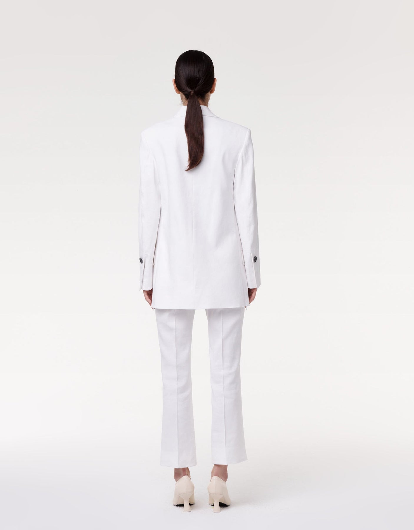 Invisible zippers at the back side panel can create slit details in this double-breasted style. Features corozo buttons at the sleeve vents and as the front closures. Pair with the Belted Tailored Vest or Crop Flare Trouser.