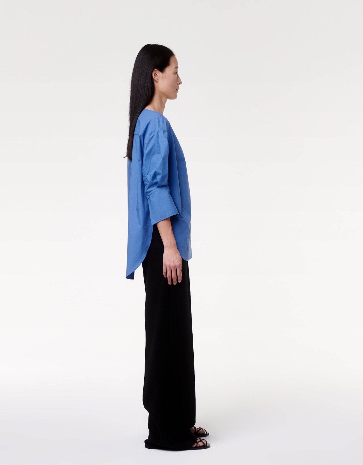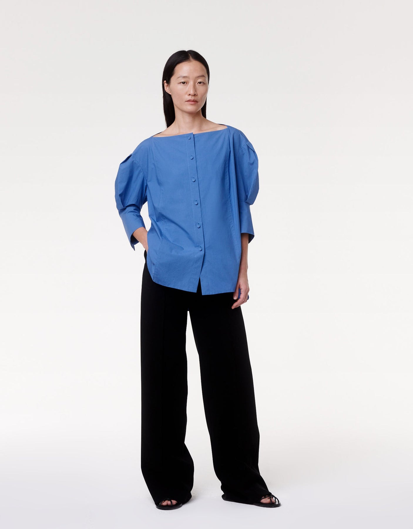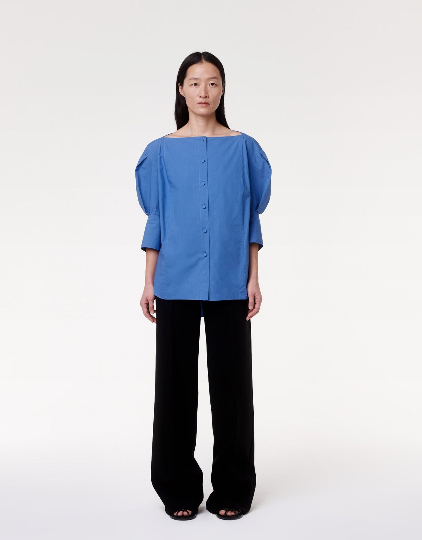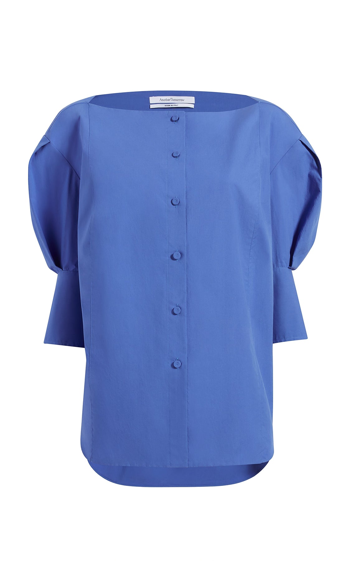 Unique details like a wide neckline, an exaggerated curved hem with slits at side seams ,and short sleeves with pleats combine to create an unexpected silhouette that still retains a timeless, sophisticated feel. Featuring self-covered buttons, and wide cuffs, this blouse has a slightly oversized fit.
