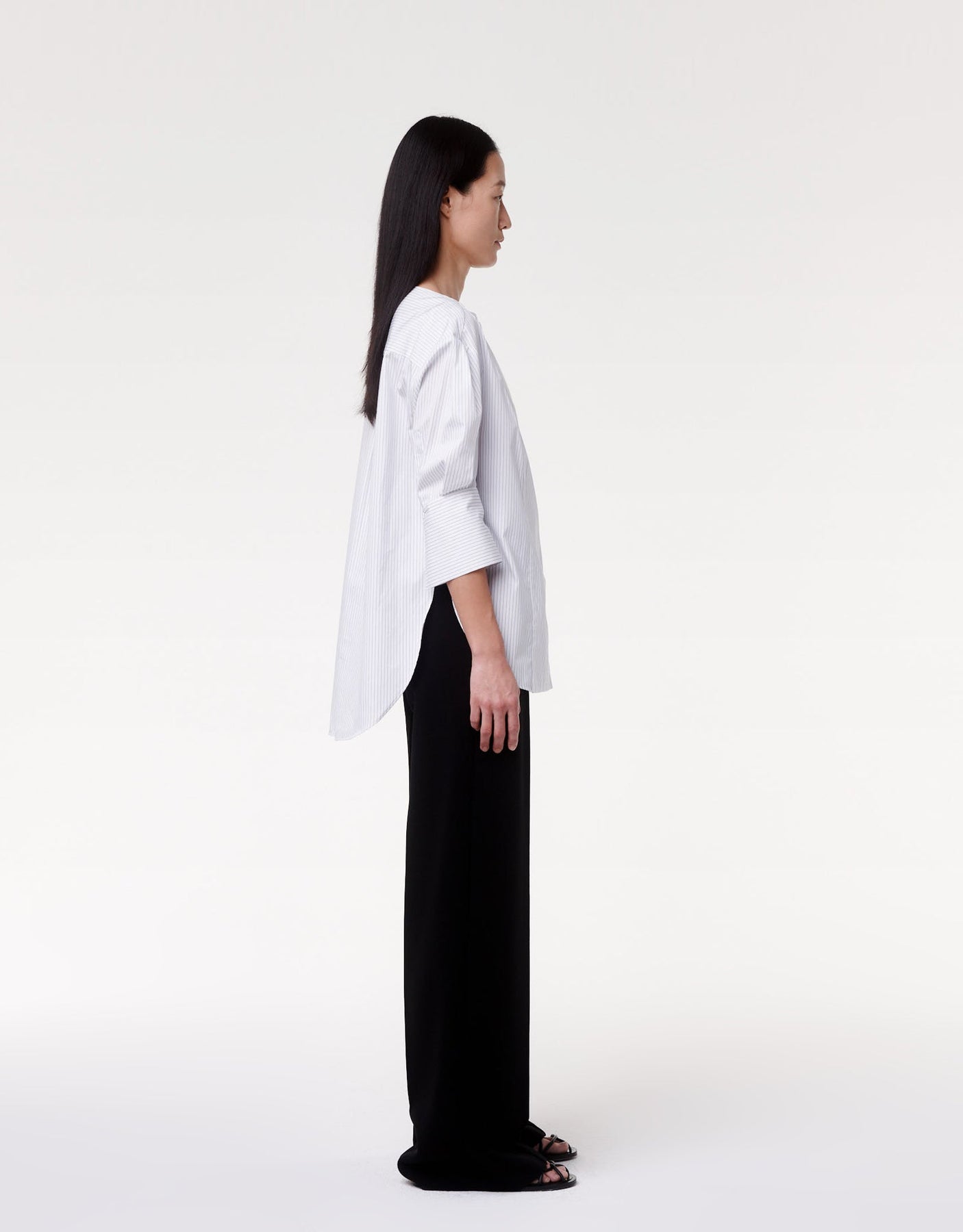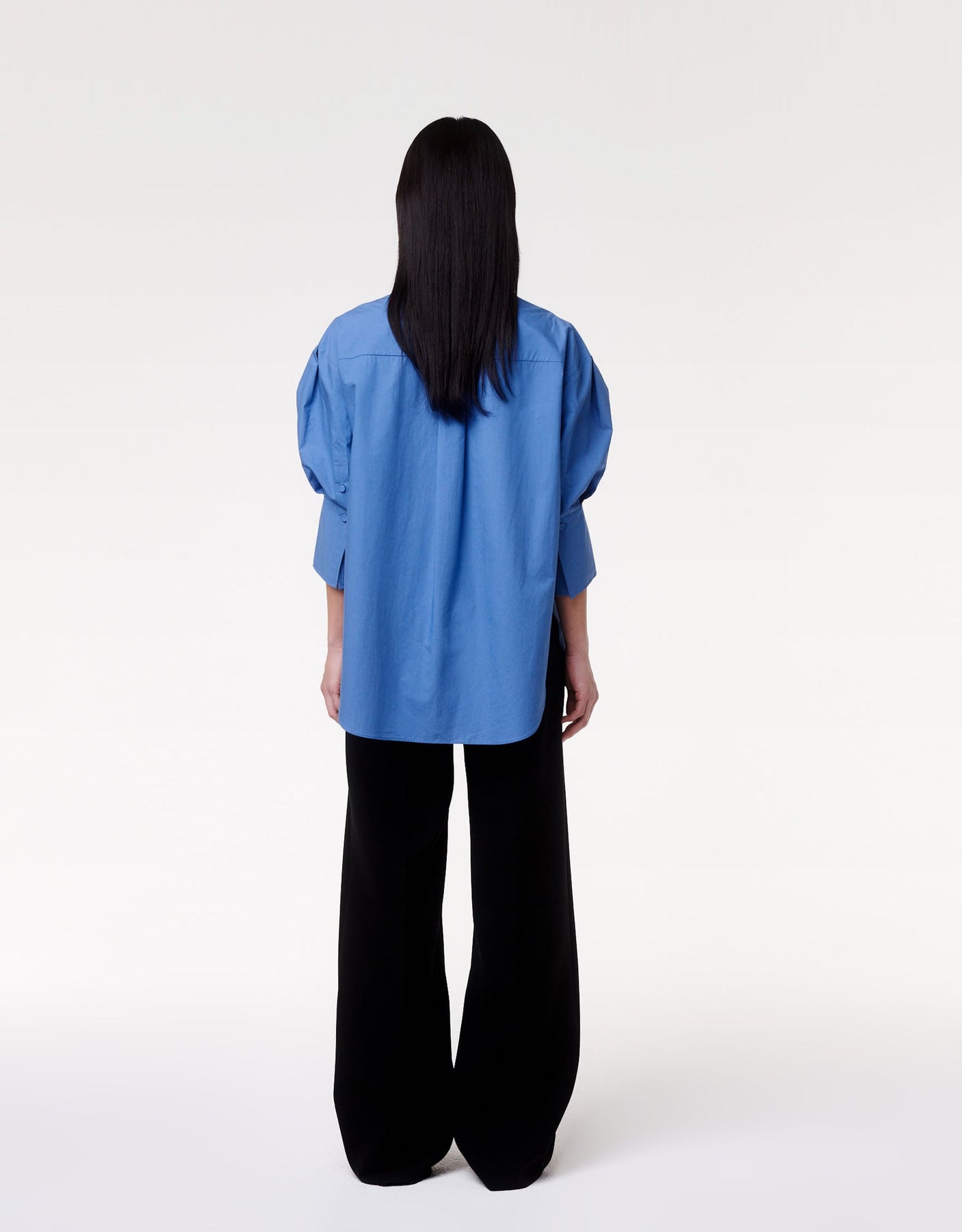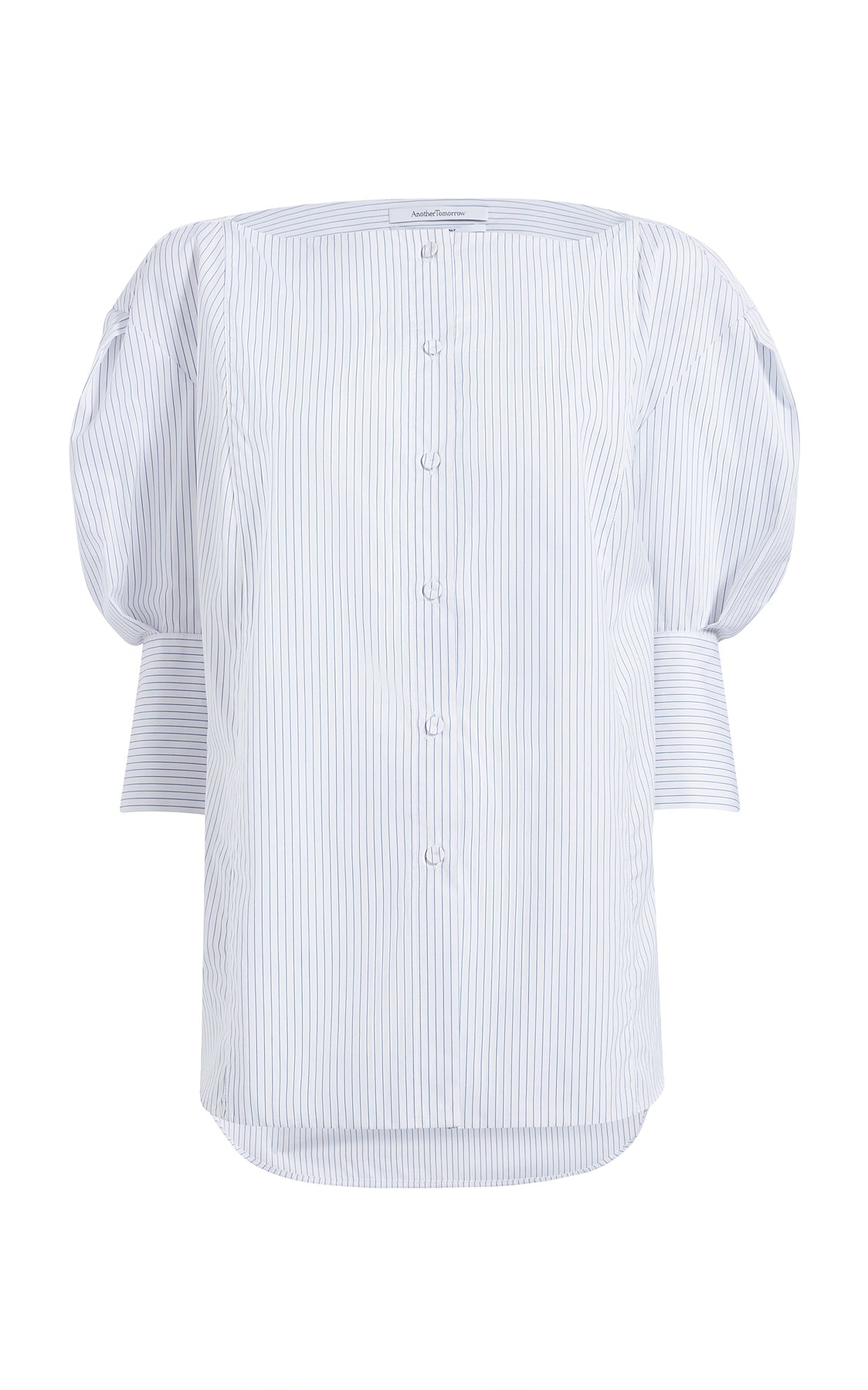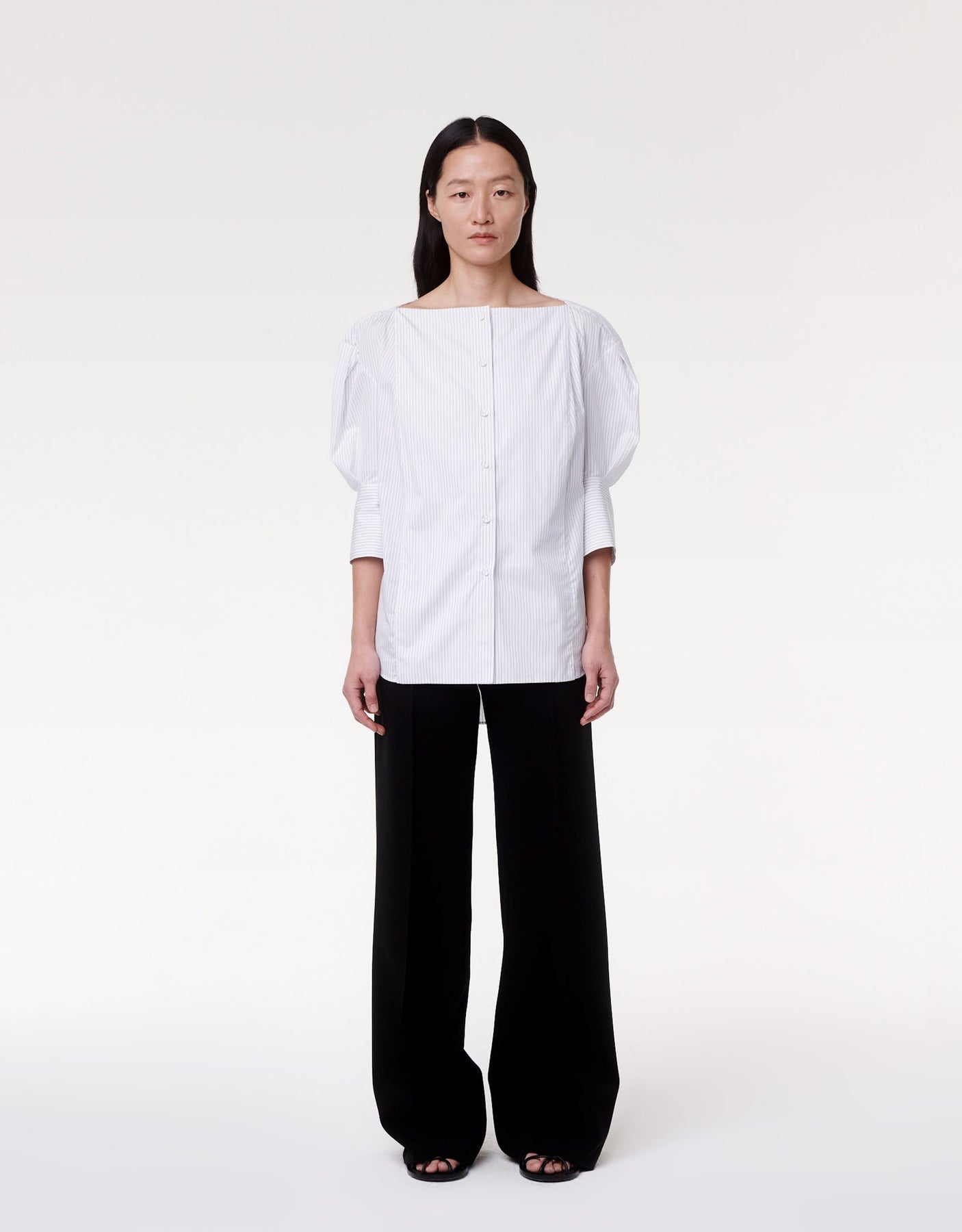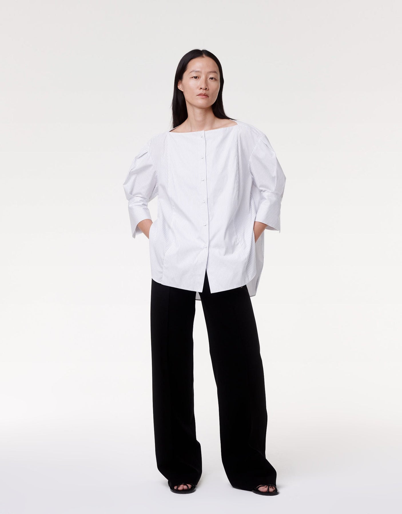 Unique details like a wide neckline, an exaggerated curved hem with slits at side seams ,and short sleeves with pleats combine to create an unexpected silhouette that still retains a timeless, sophisticated feel. Featuring self-covered buttons, and wide cuffs, this blouse has a slightly oversized fit.