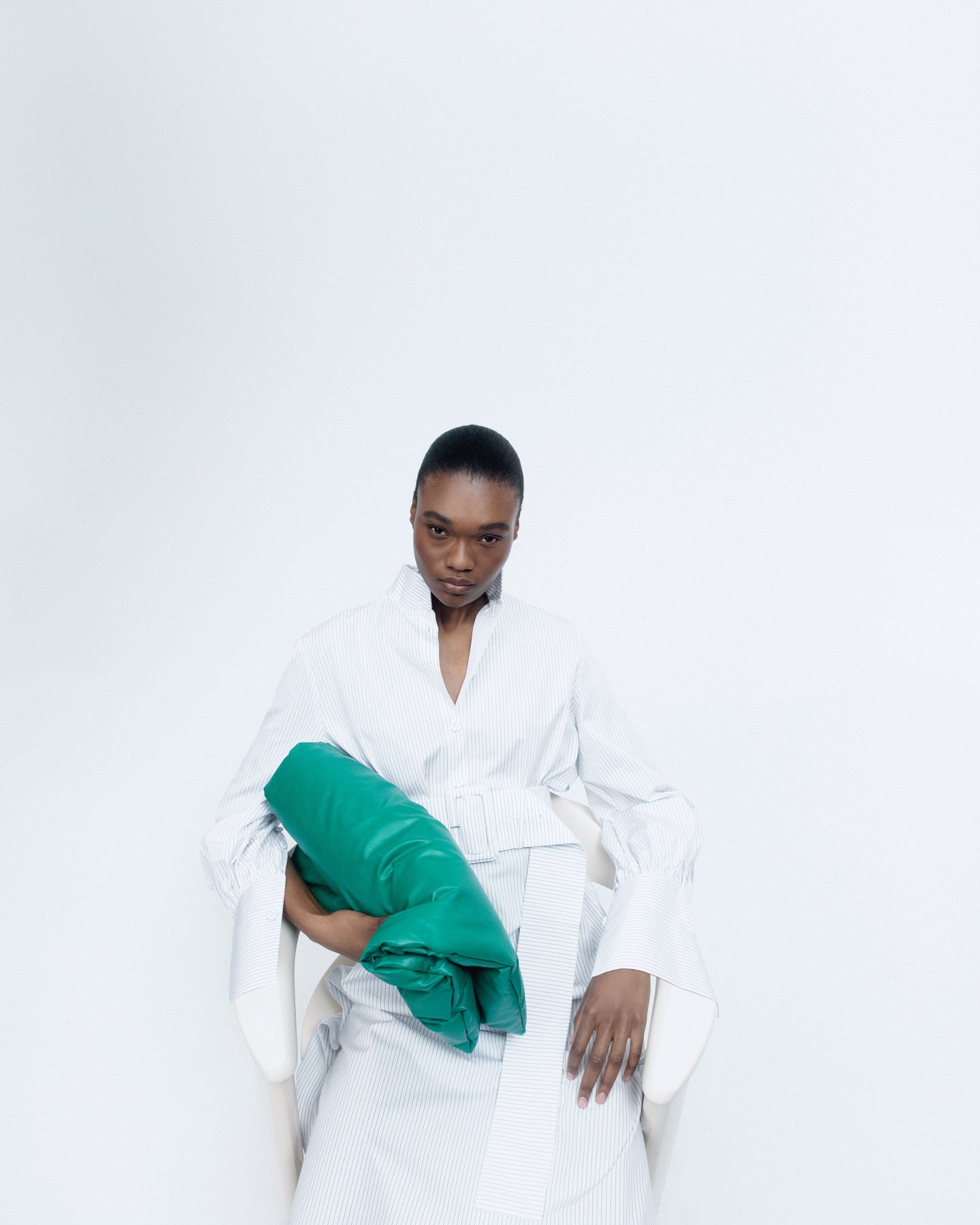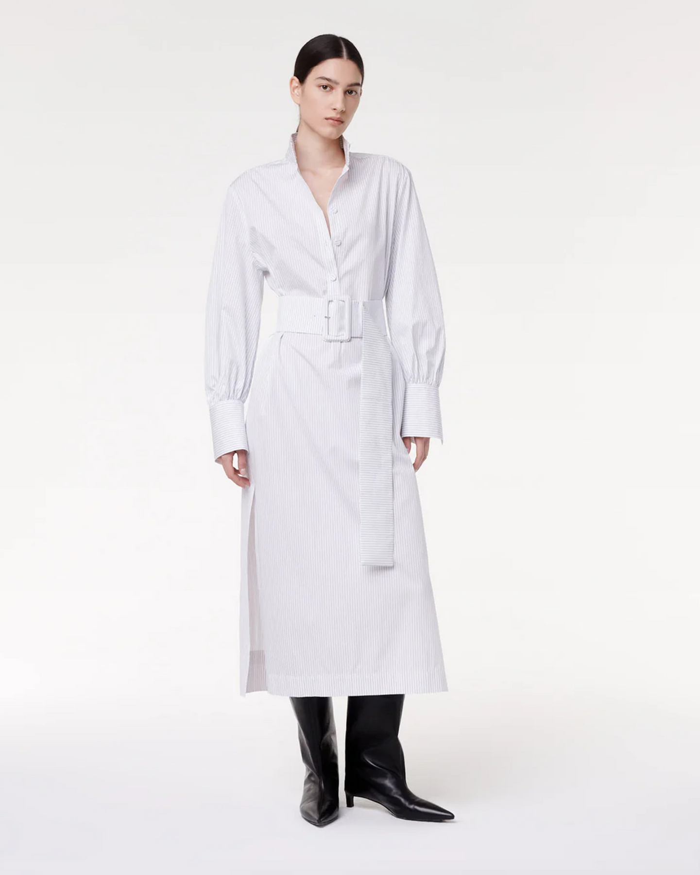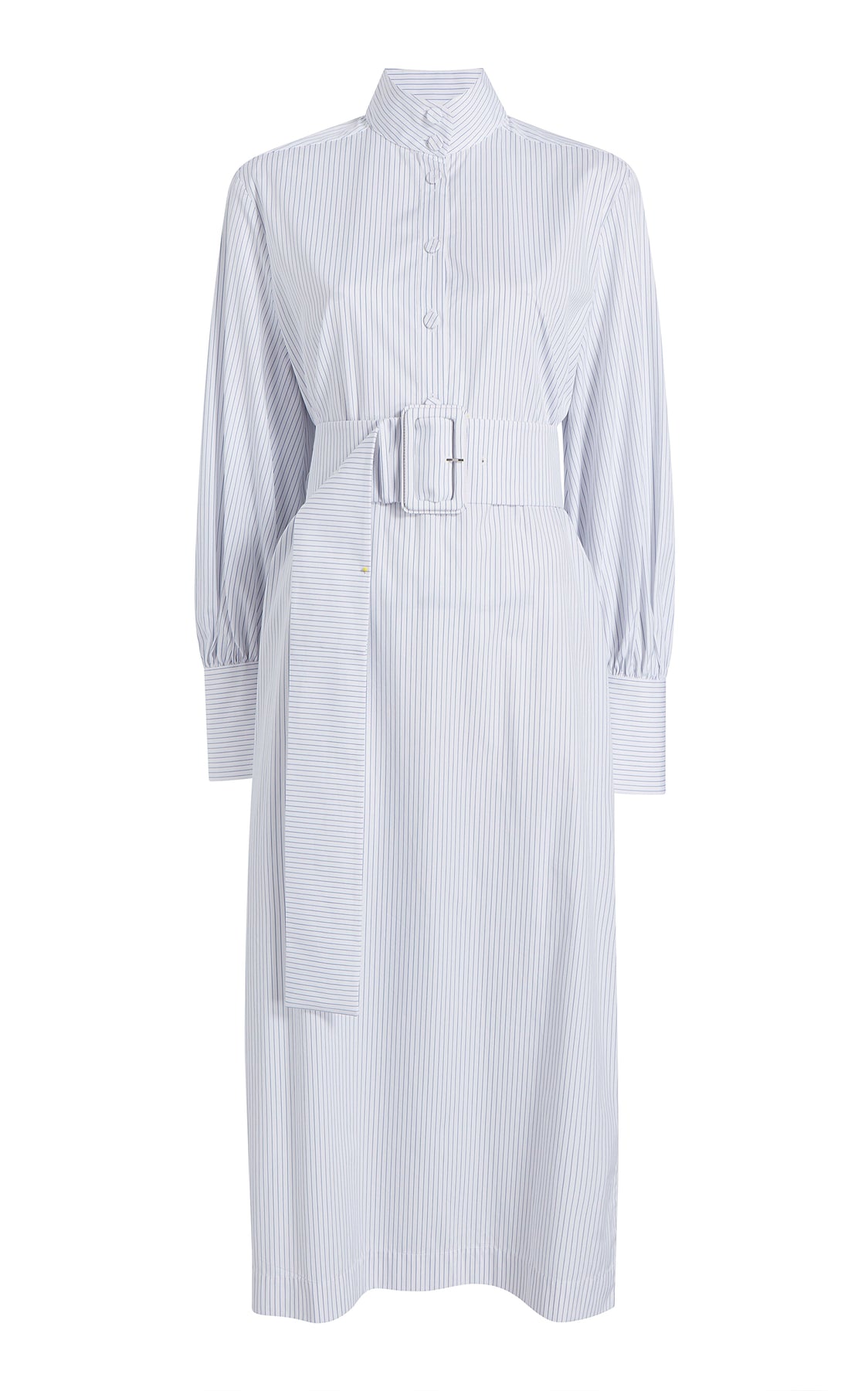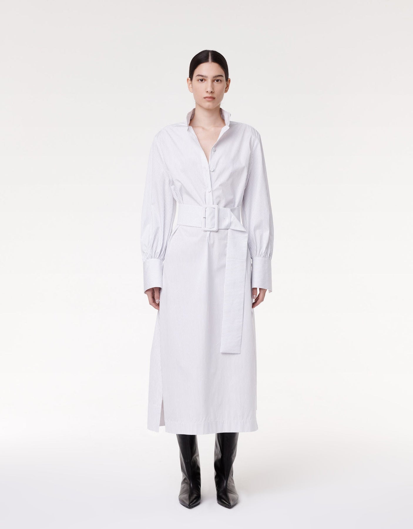 With slits on both sides, the midi shirtdress allows for free and easy movement. An opening at side seams lets the self belt be worn on the outside for a more traditional silhouette, or through the back to create a cape effect.
