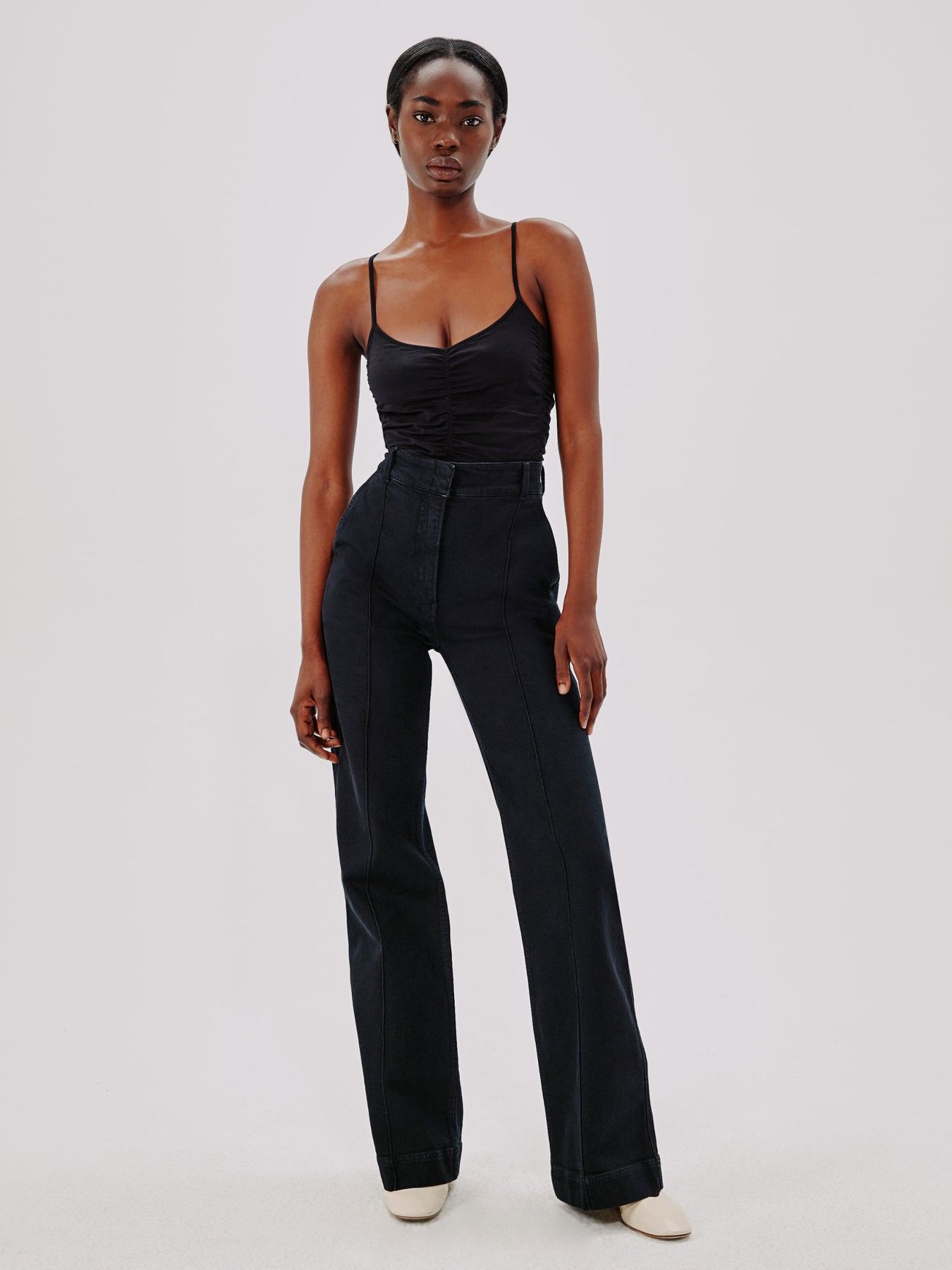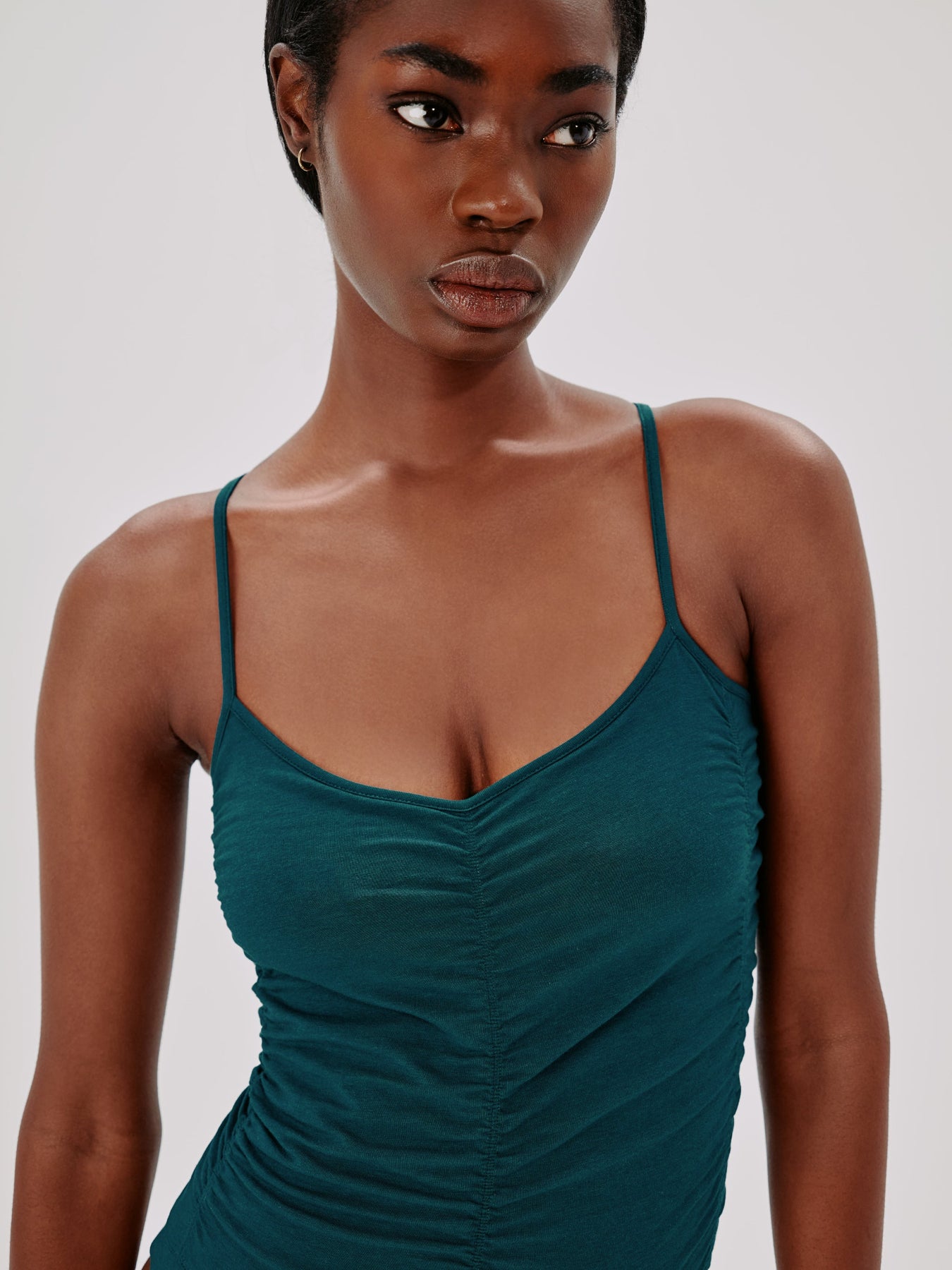 A silhouette that nods to dancewear made unique thanks to the dynamic sheared texture. The spaghetti straps are adjustable to help create a precise fit, and the button closure at the basis makes this perfect for layering under the High Waisted Denim Trousers or Doppio Wide Leg Pant.