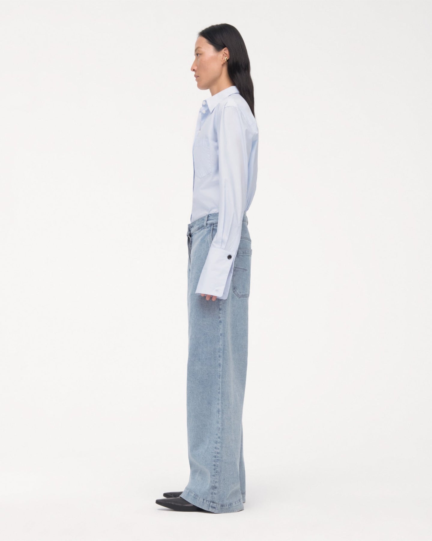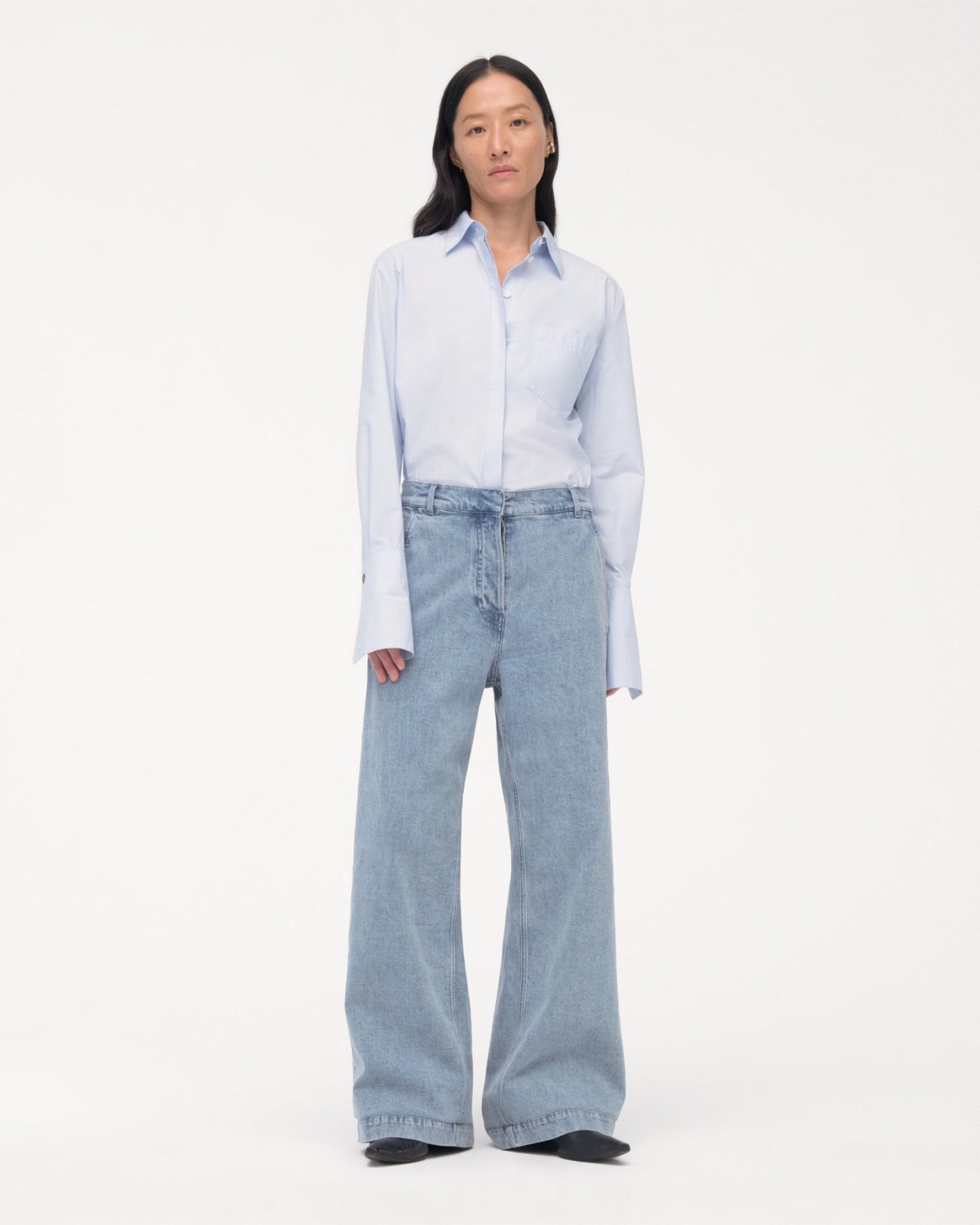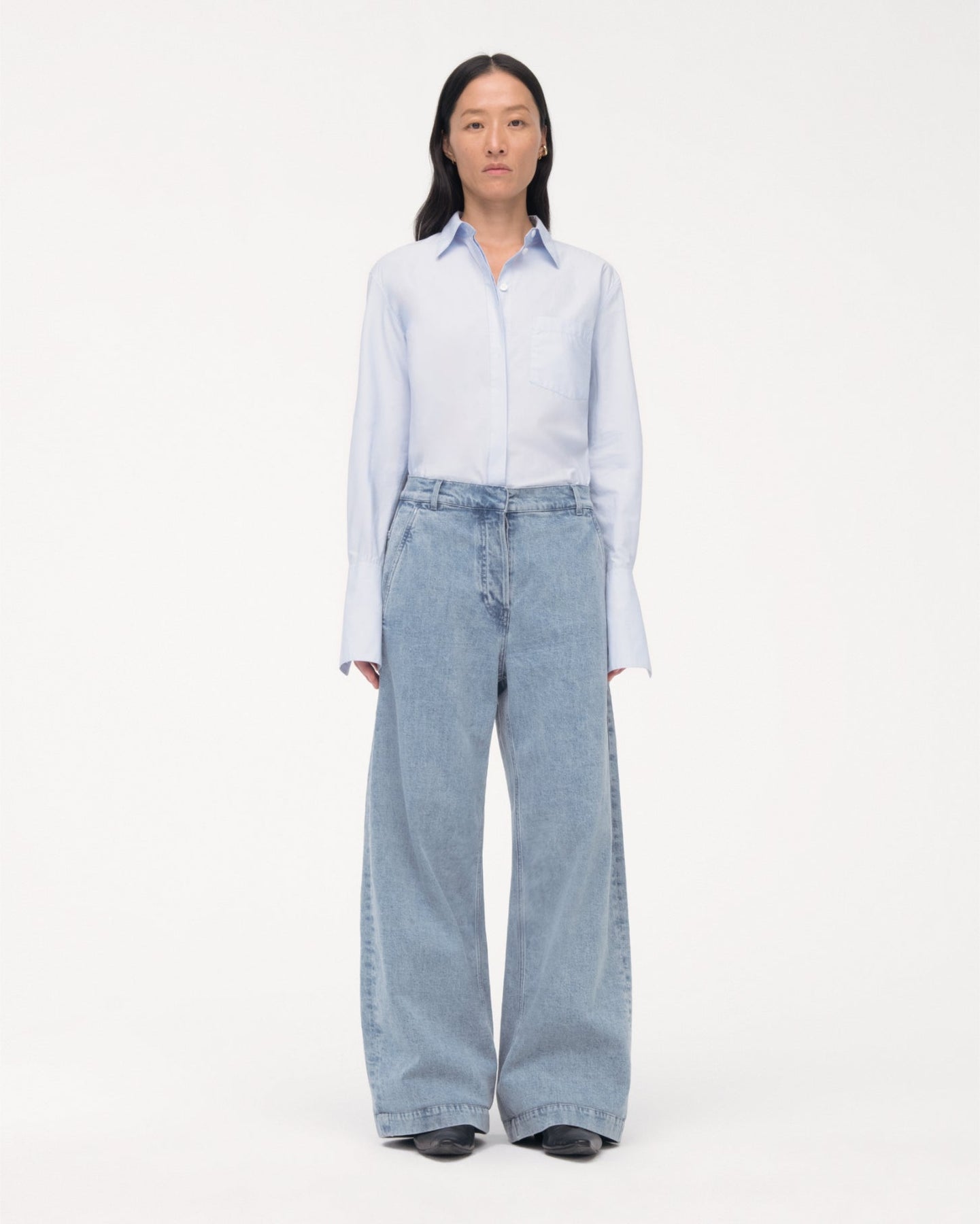 This relaxed-fitting jean is wide through the leg, creating an easy feel that pairs well with the classic Men's Shirt. A hook and bar closure maintains a long, uninterrupted silhouette at the front.