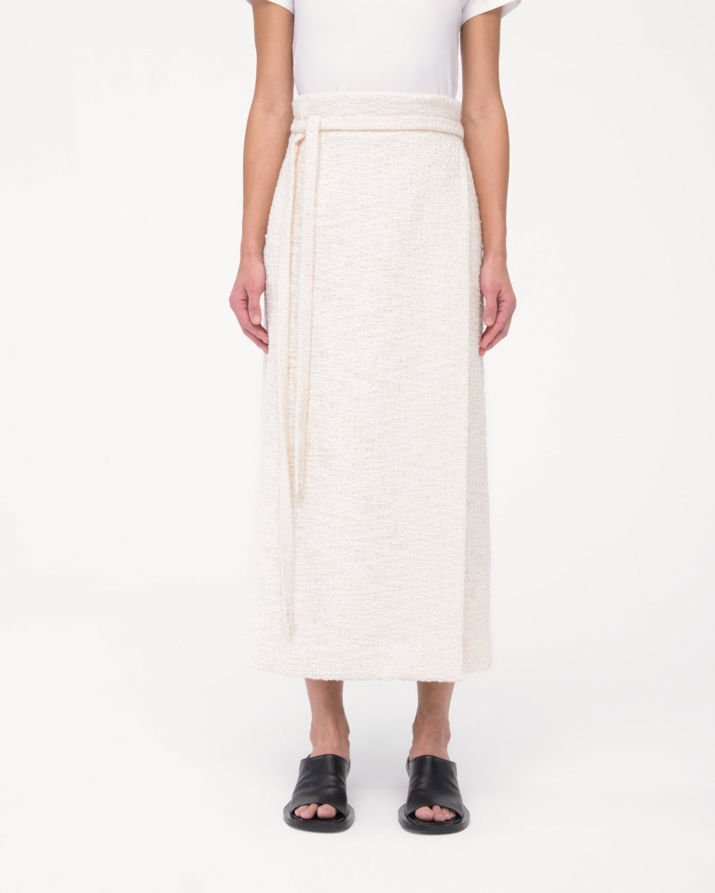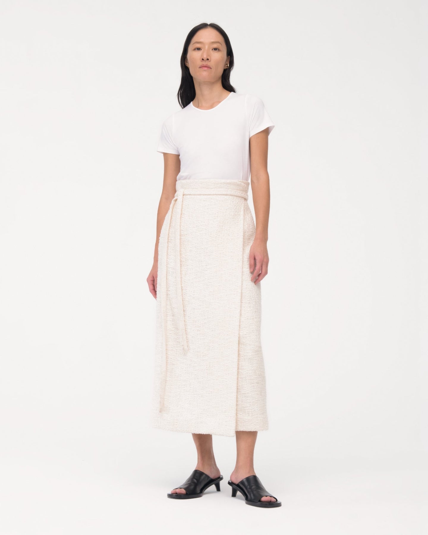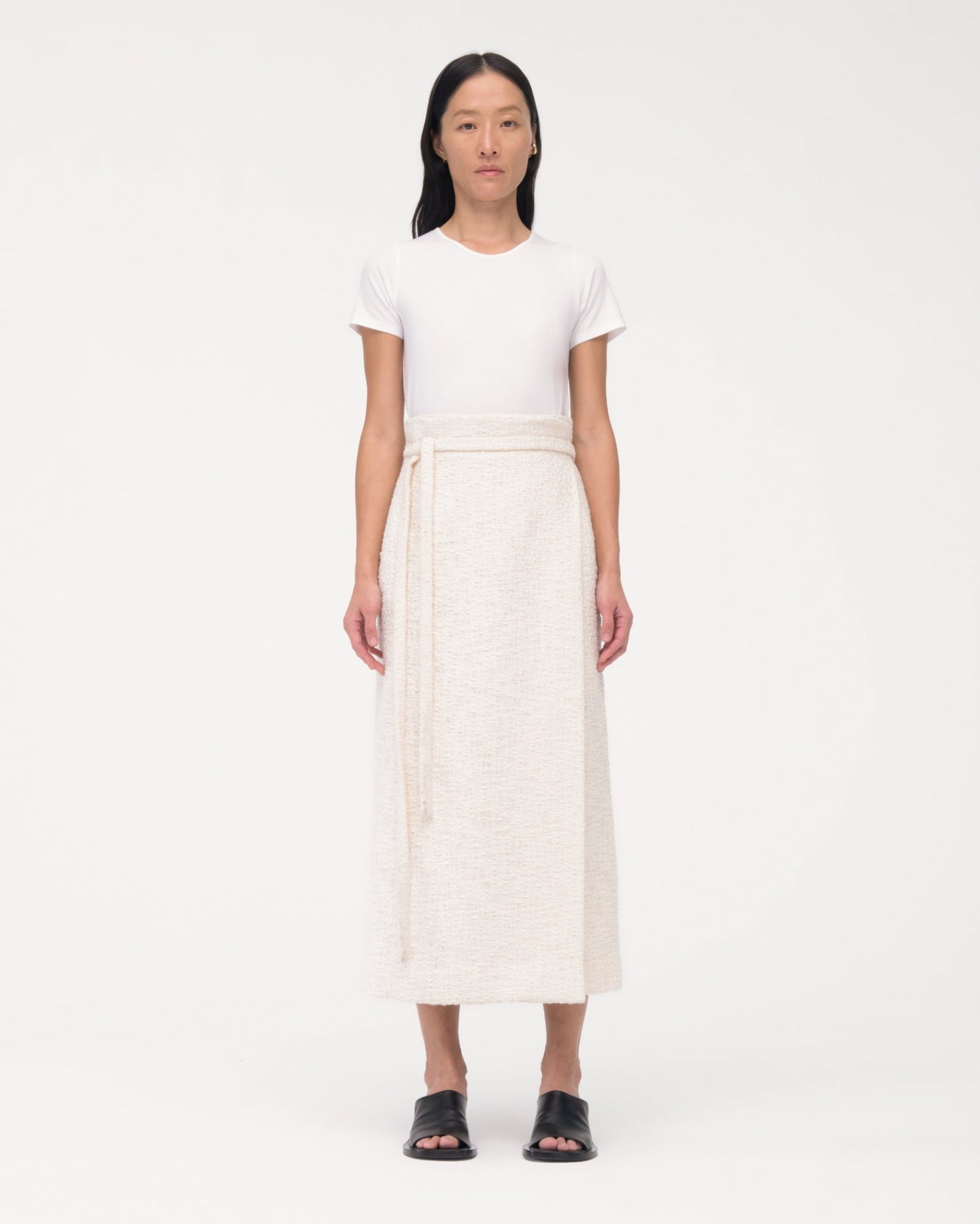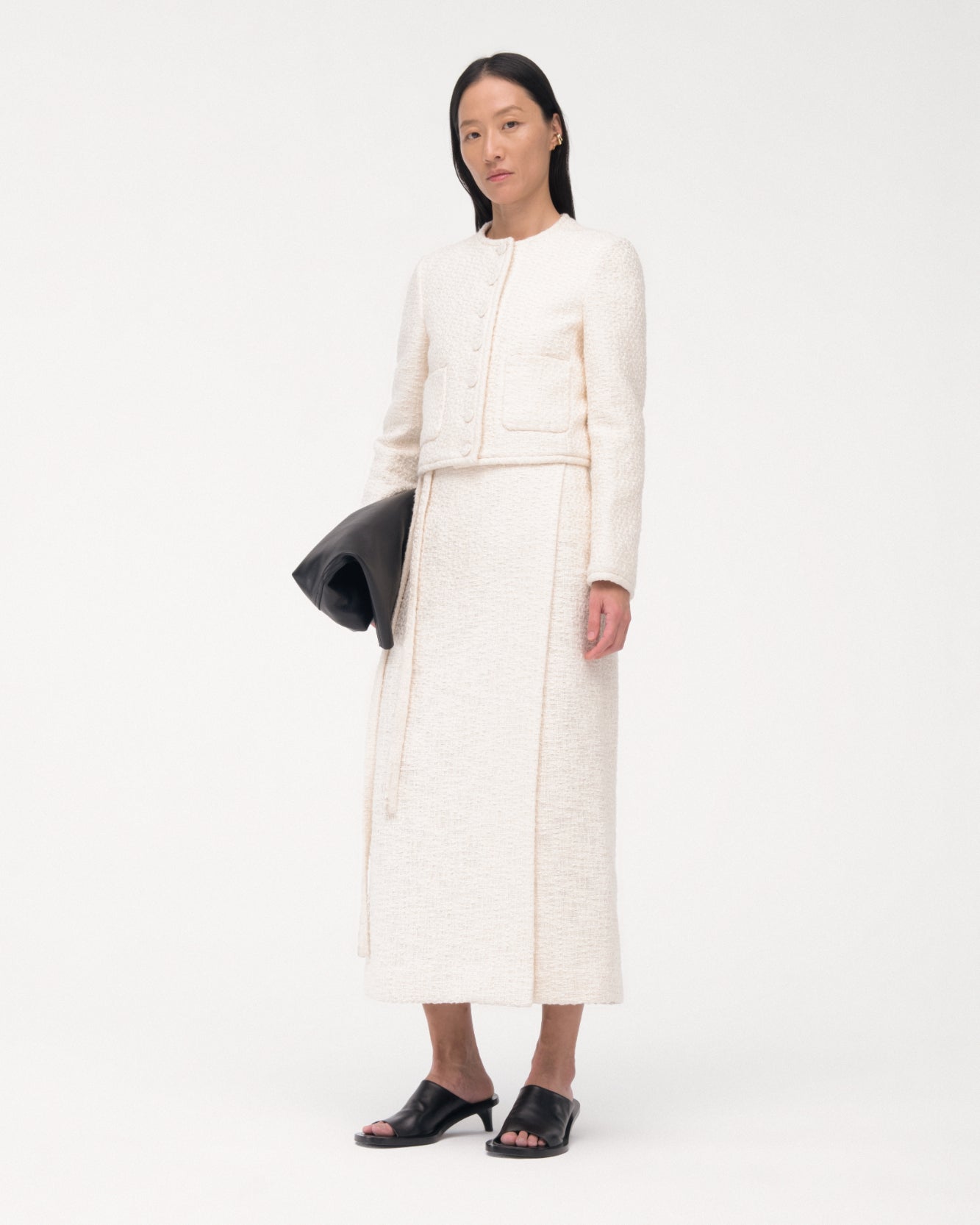 A completely novel combination of fabric and silhouette, our long Wrap Skirt marries the relaxed with the refined thanks to our uniquely supple 100% cotton tweed. The internal corozo closure maintains a sleek, uninterrupted look. A long tie serves as an additional singular detail. Pair with the Cropped Tweed Jacket to complete the distinctly modern set.