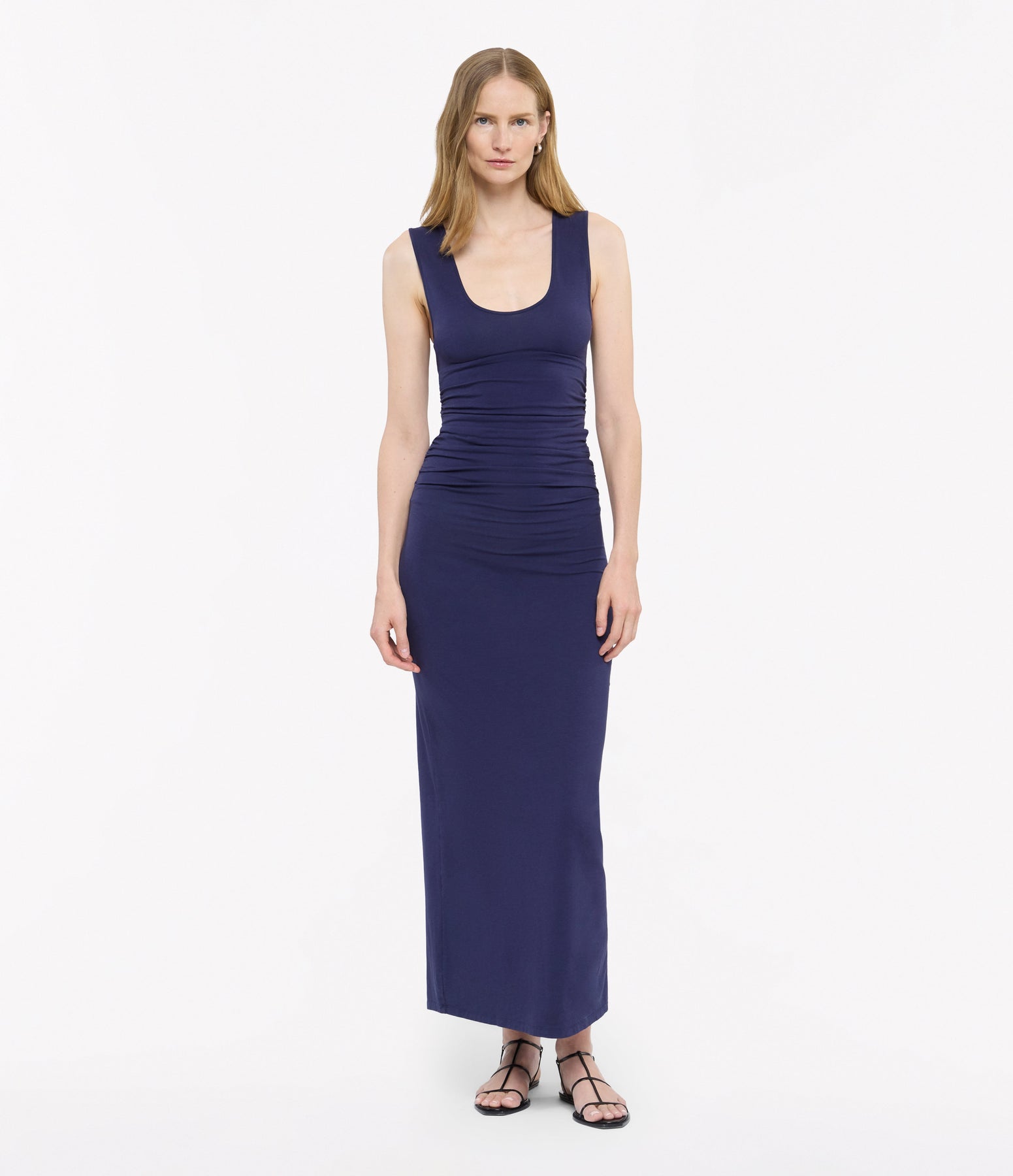 Crafted in a custom organic cotton lyocell blend, this slip-on dress fits close to the body, accentuated by ruching on both sides.