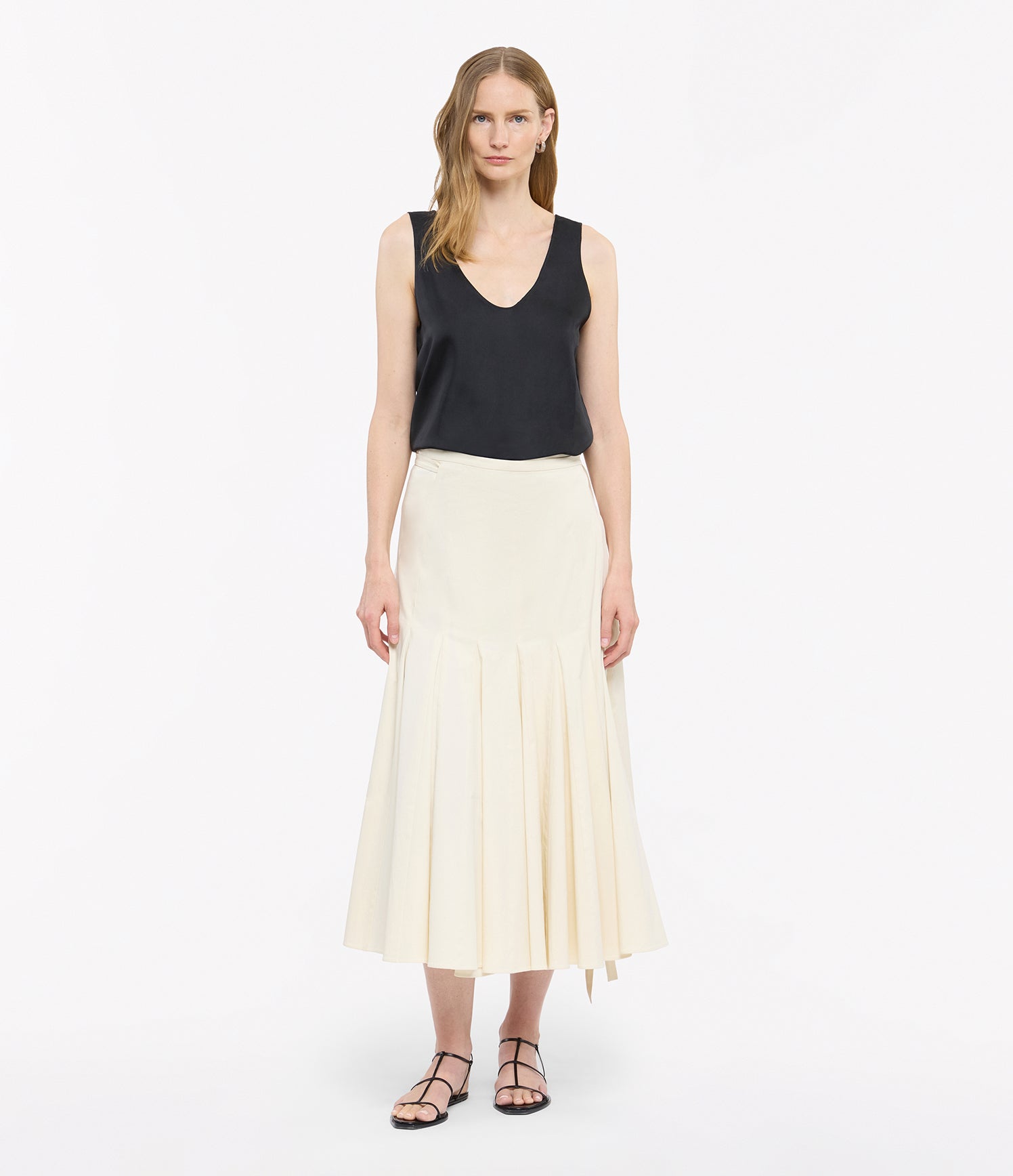 Crafted in our lightweight organic cotton with a crisp feel, this mid length skirt has a detachable belt at the waist. Featuring impeccable pleating, creating subtle volume from the mid thigh down.