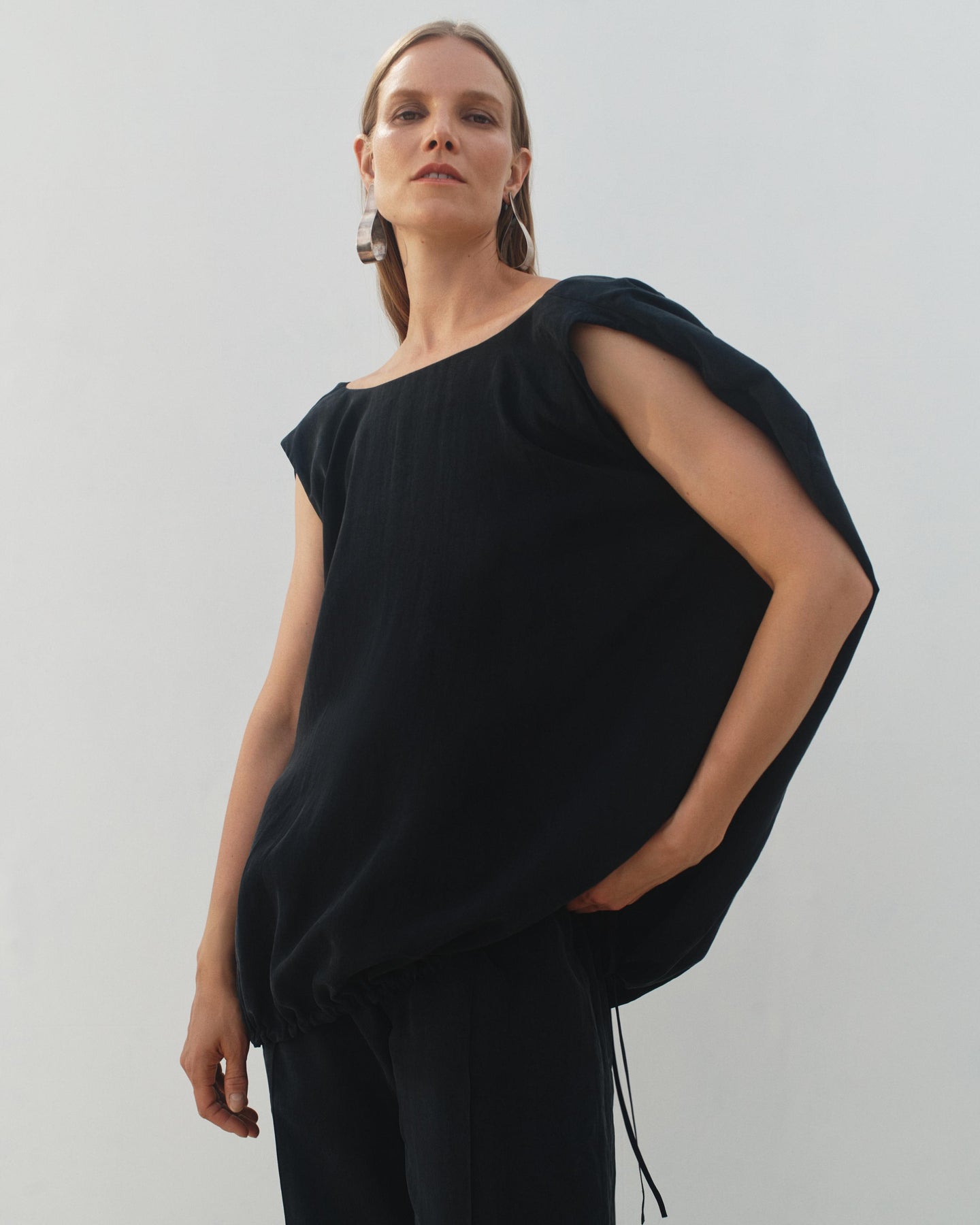 Crafted in a lightweight smooth fabric, this slip-on style can be cinched at the hem for a unique cocoon shape or left untied for a fluid trapeze silhouette.