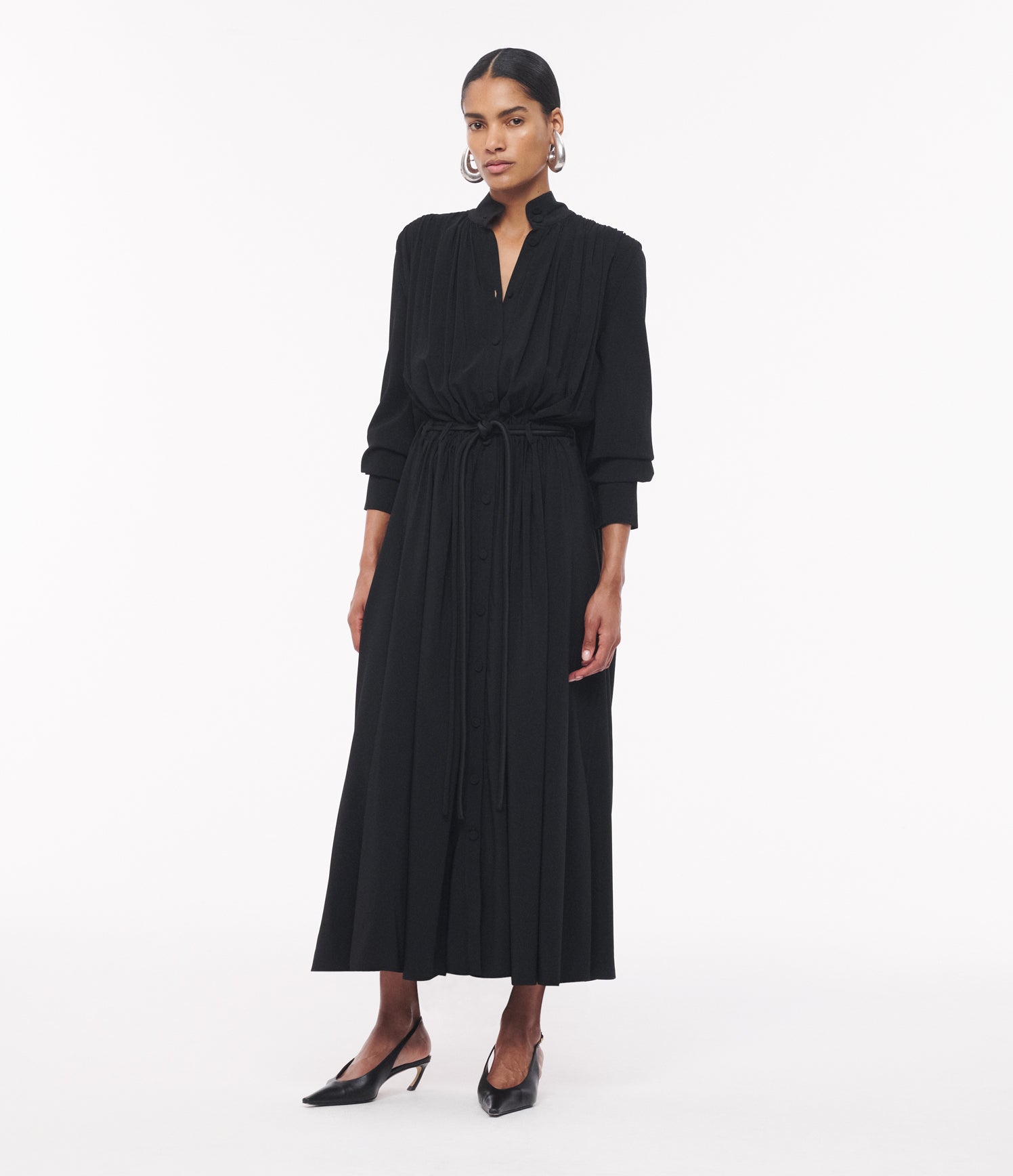 Crafted in a luxurious crepe fabric that moves effortlessly. This shirt-dress can be worn with a tubular belt highlighting carefully designed shirring or without for a fluid trapeze drape.