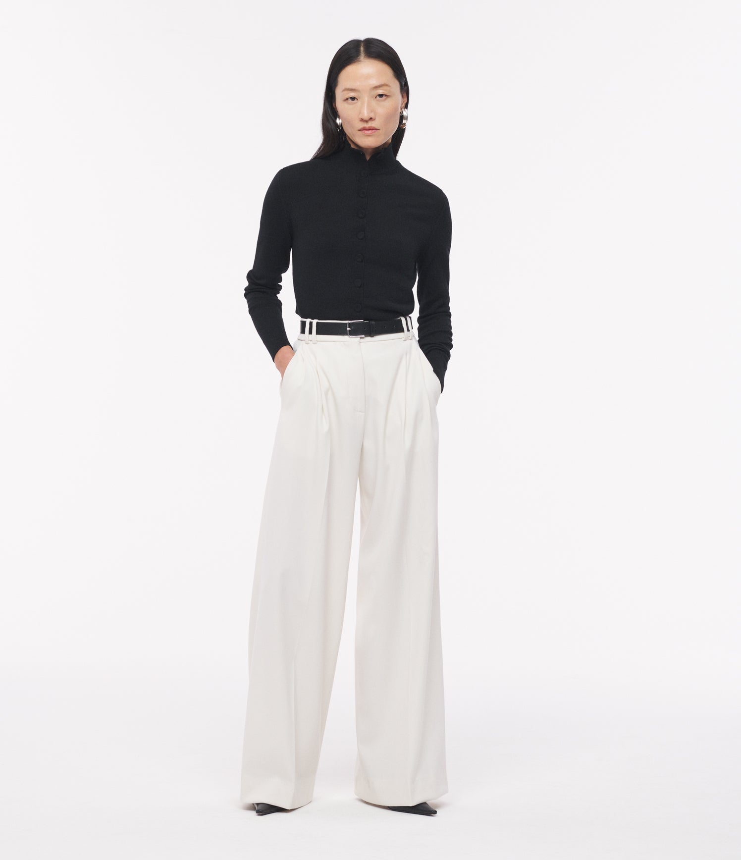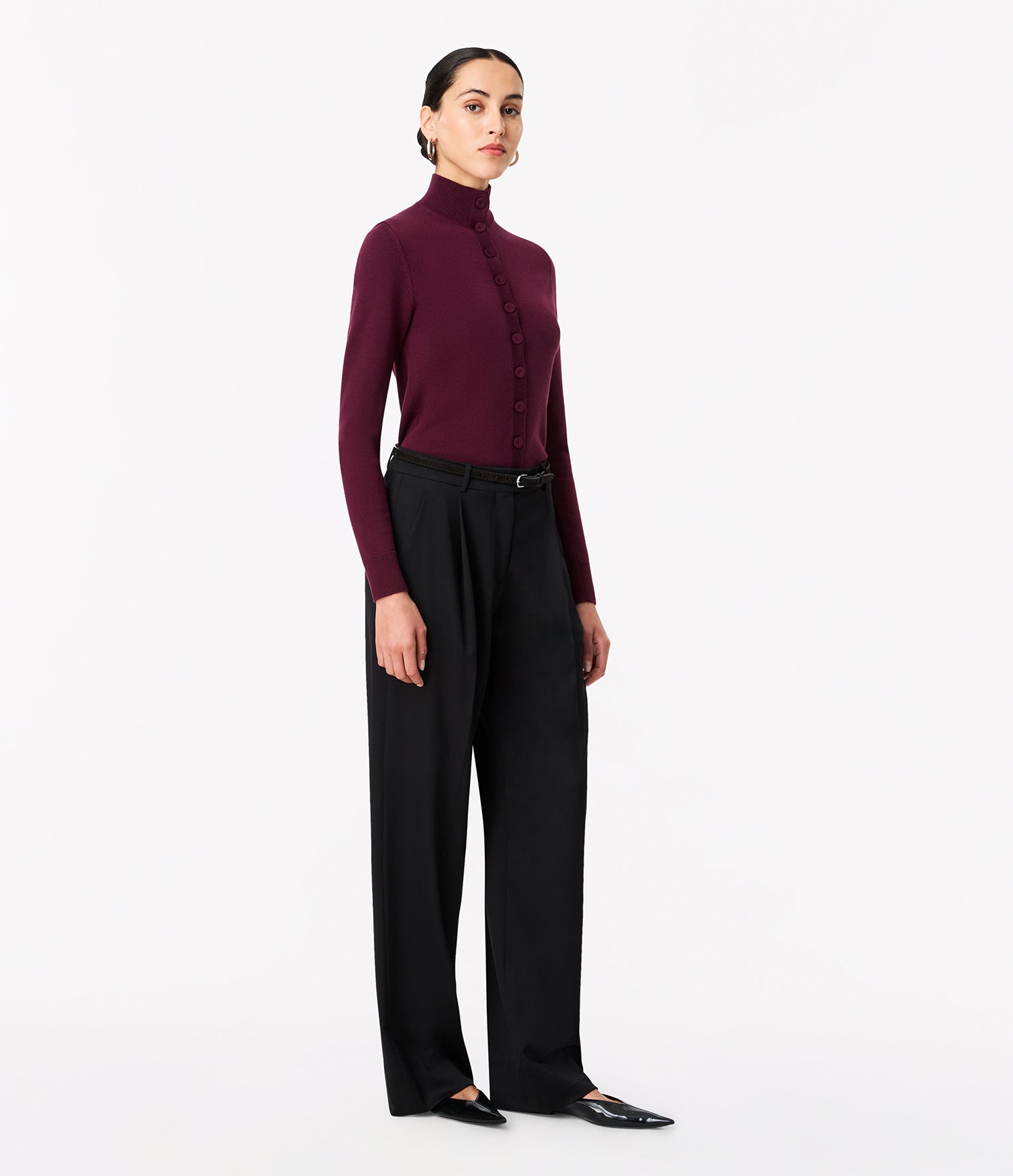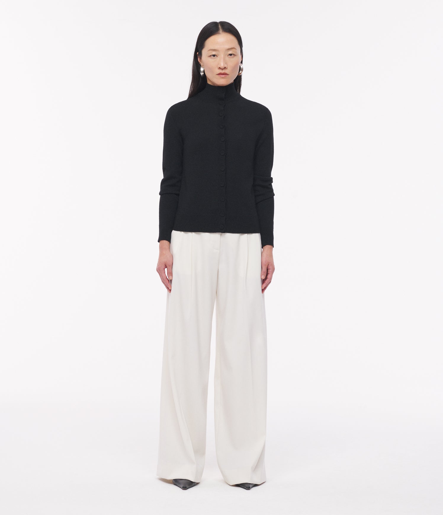 Knitted in a midweight soft wool, this cardigan was designed to sit close to the body. Ribbed trim accents the hem, cuffs and neck.