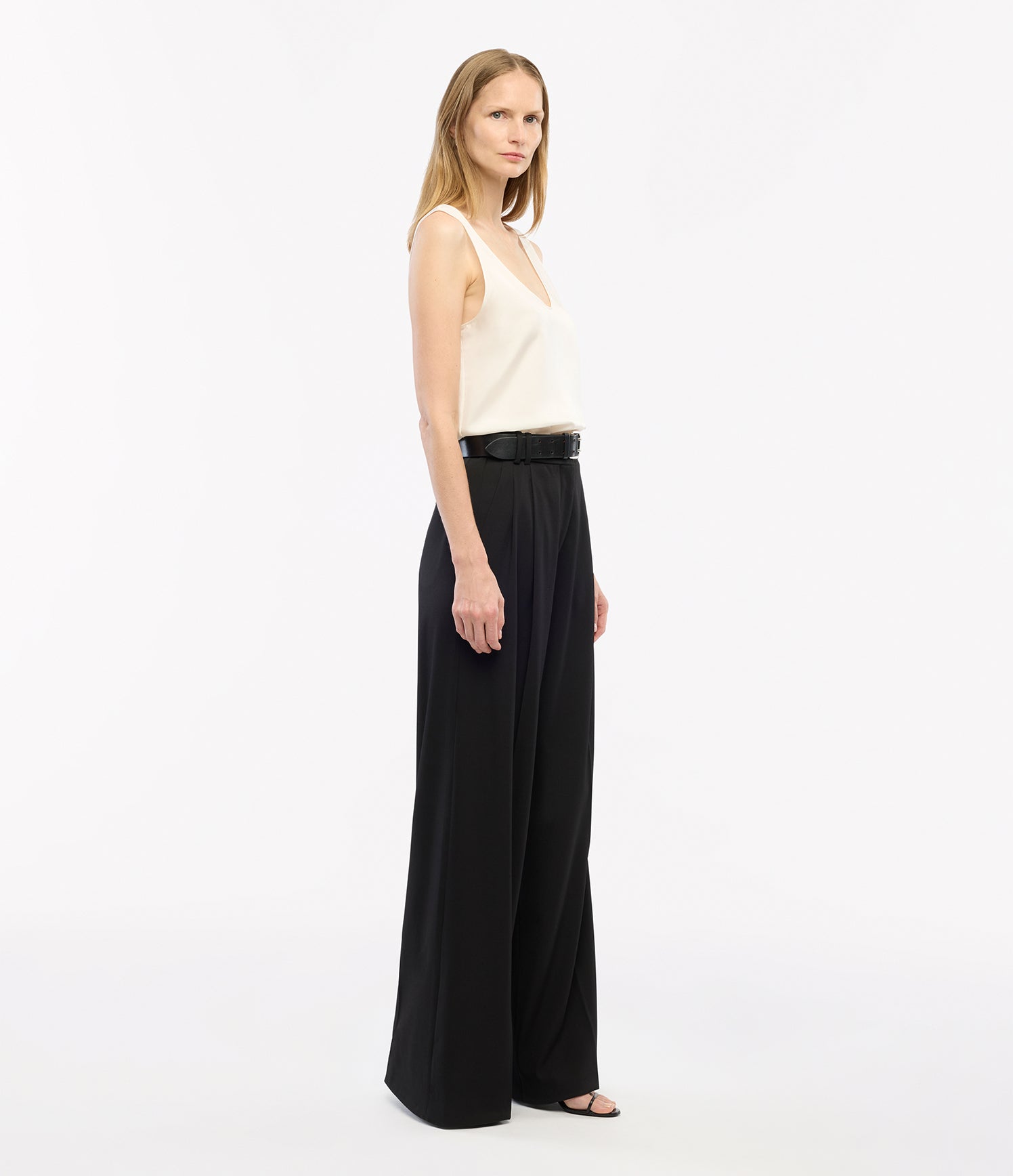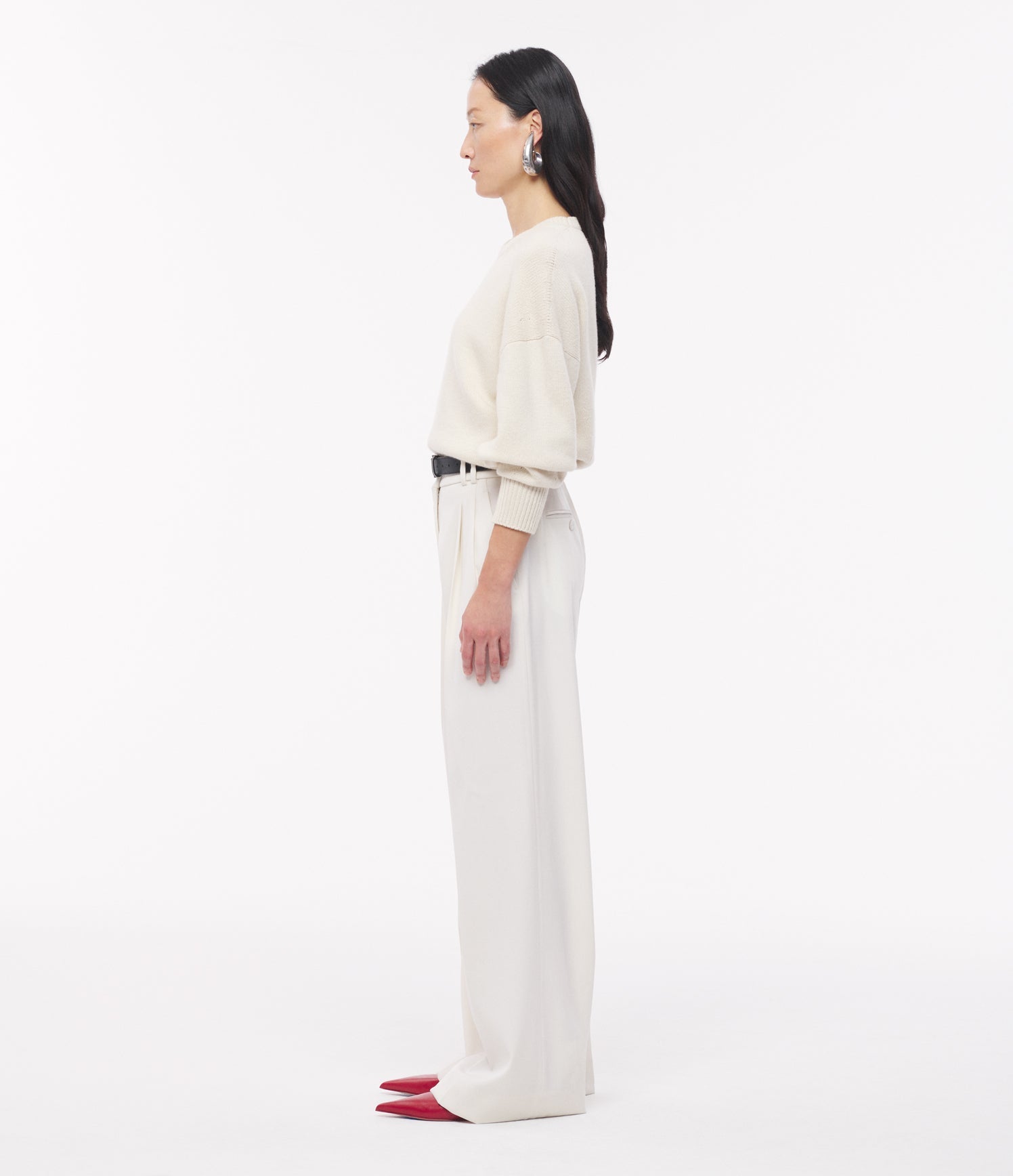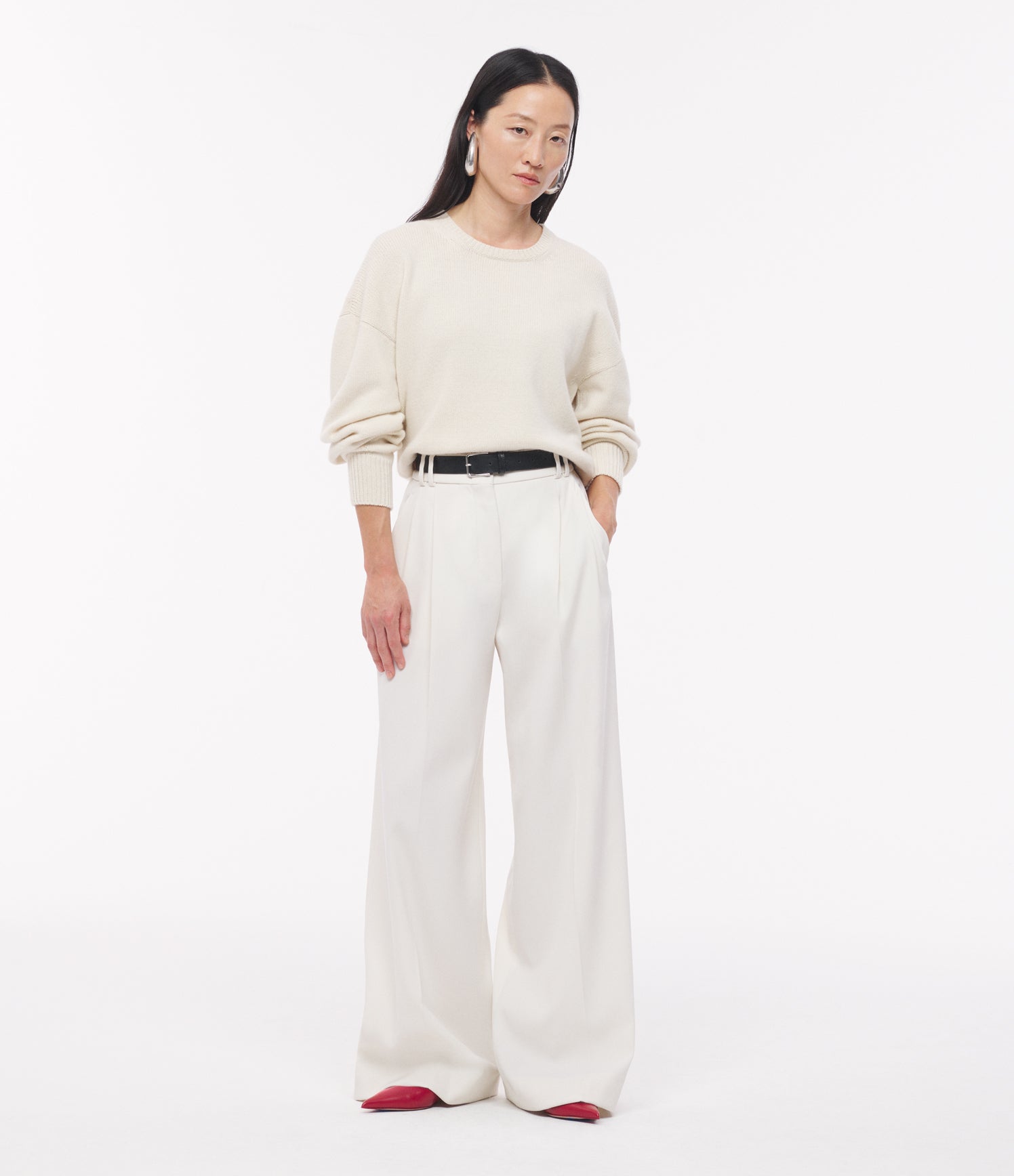 Crafted in a midweight wool twill with a wide leg sitting at the natural waist. Featuring precise pleats, welt pockets, self-covered buttons, and a zipper fly.