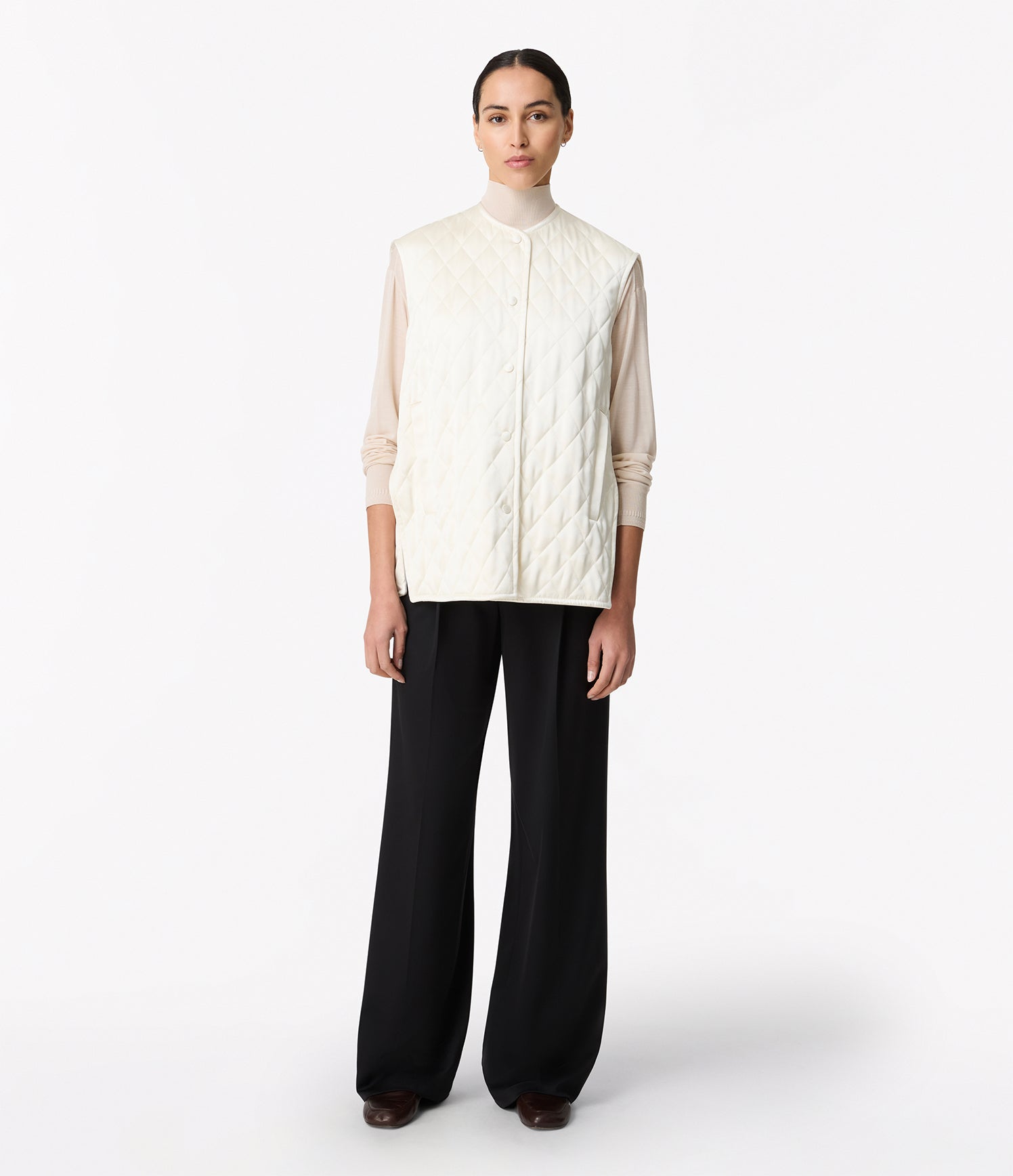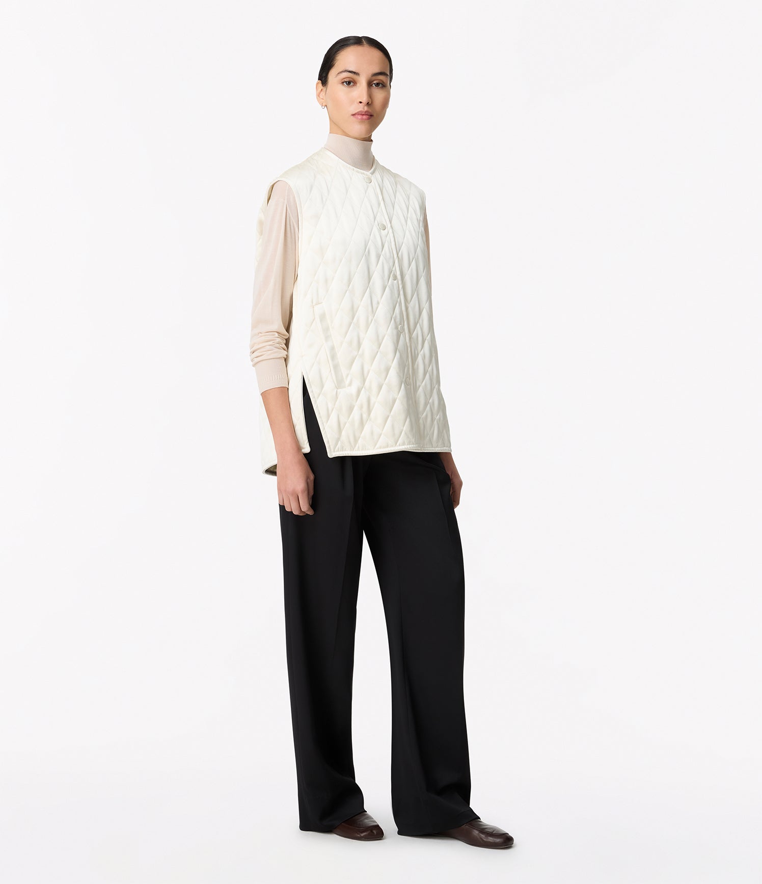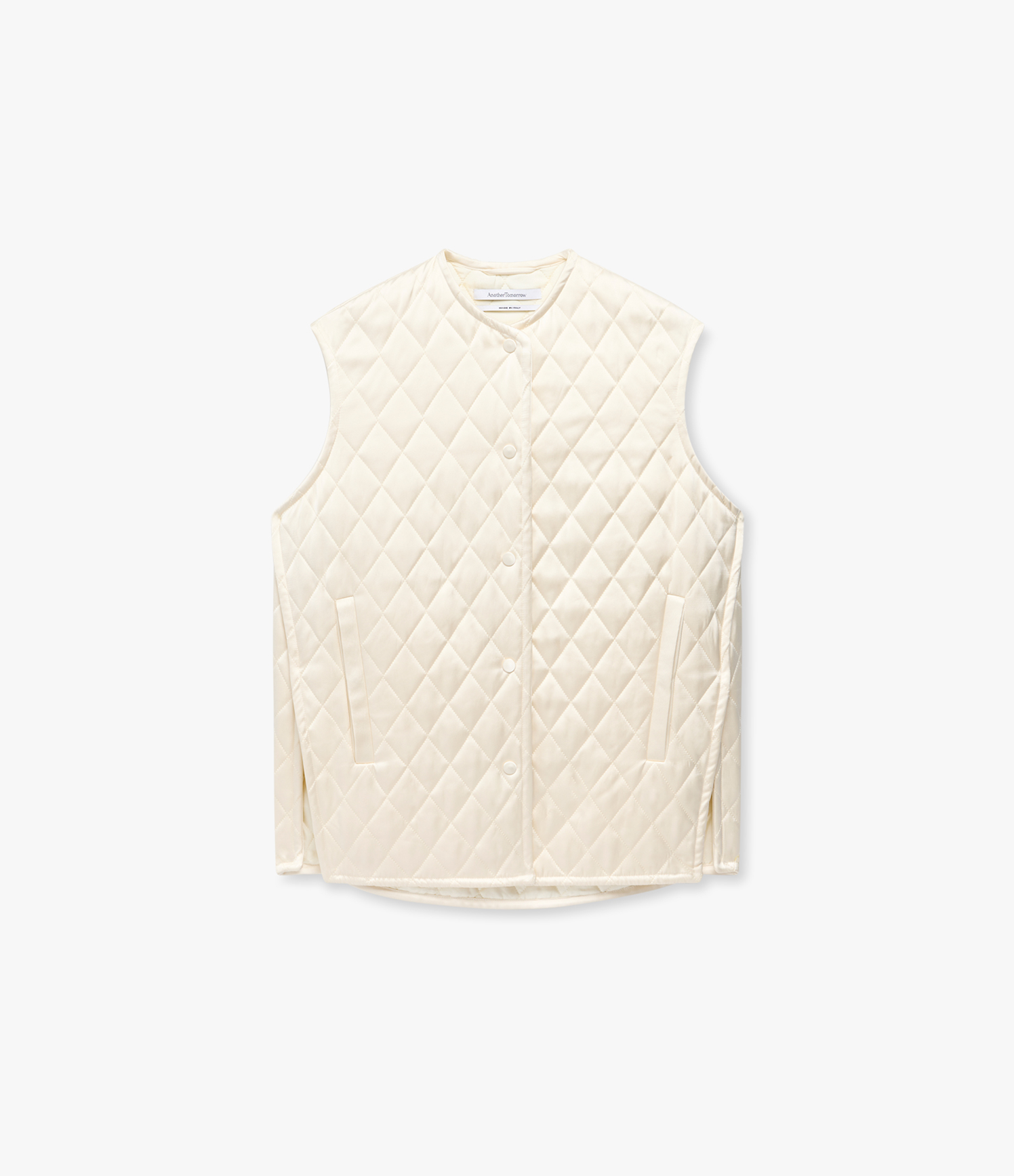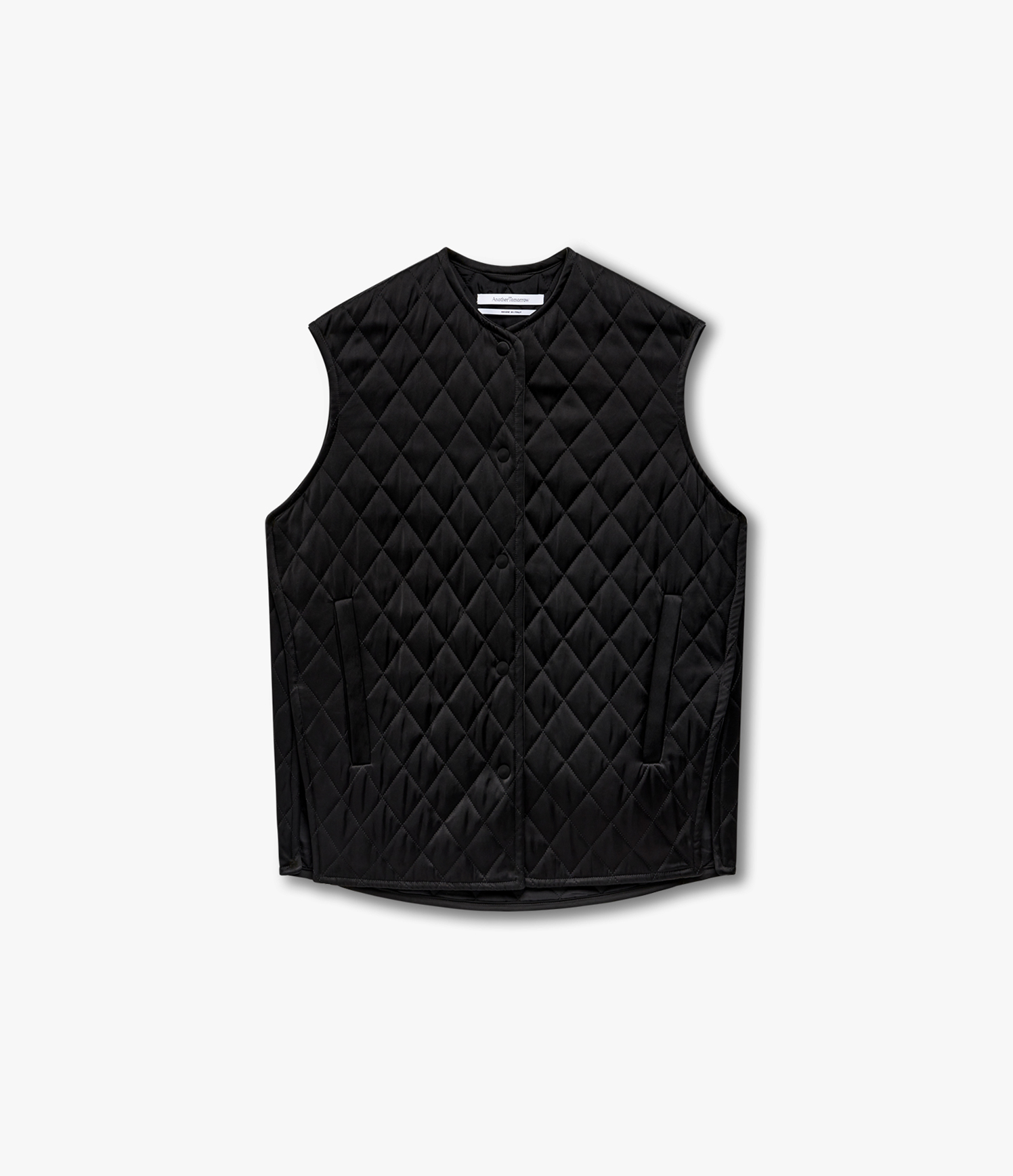 Realized in a soft satin, this quilted vest offers light padding in an oversized fit, complete with side pockets.