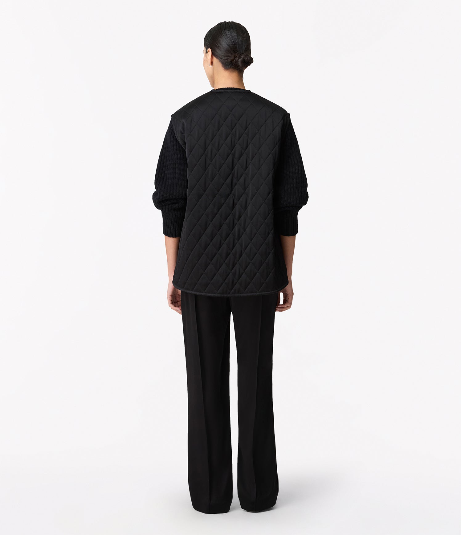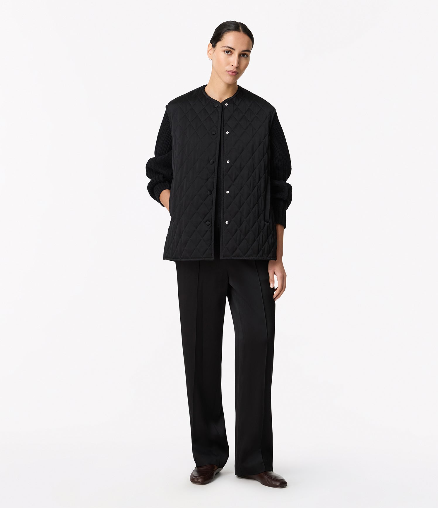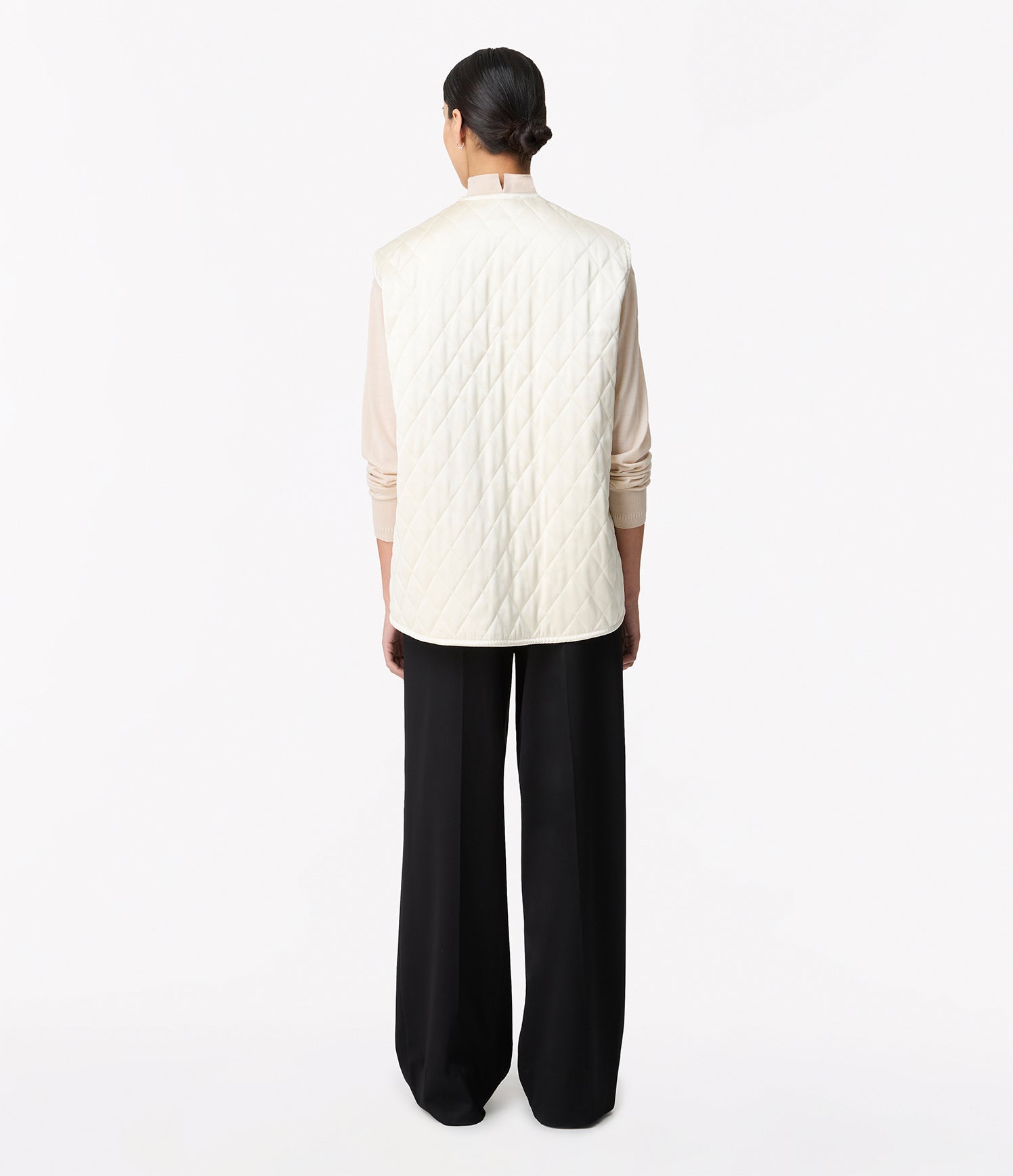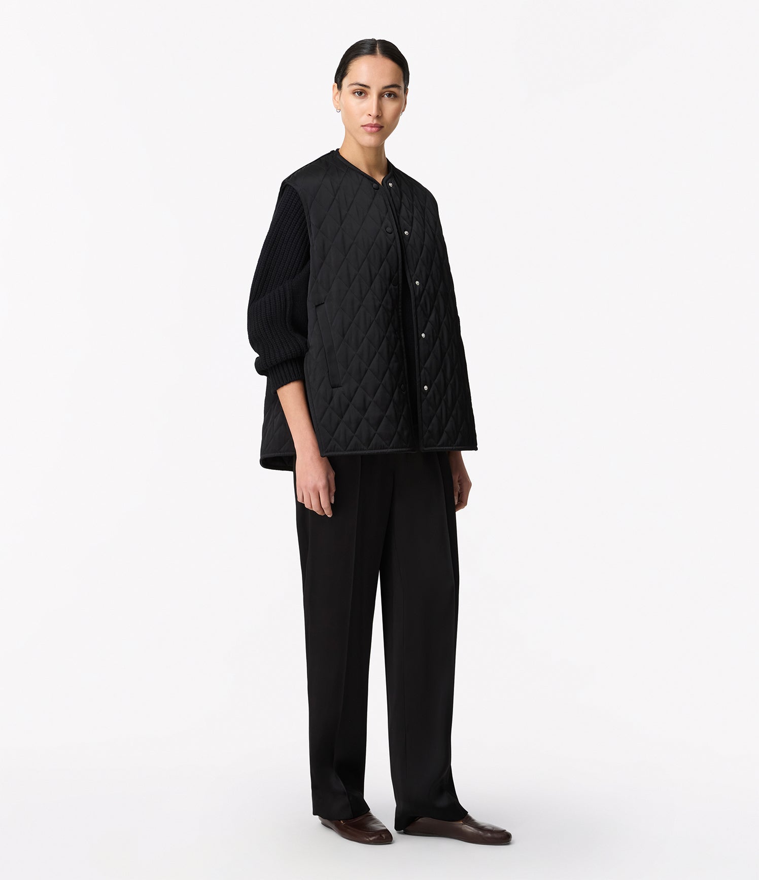 Realized in a soft satin, this quilted vest offers light padding in an oversized fit, complete with side pockets.