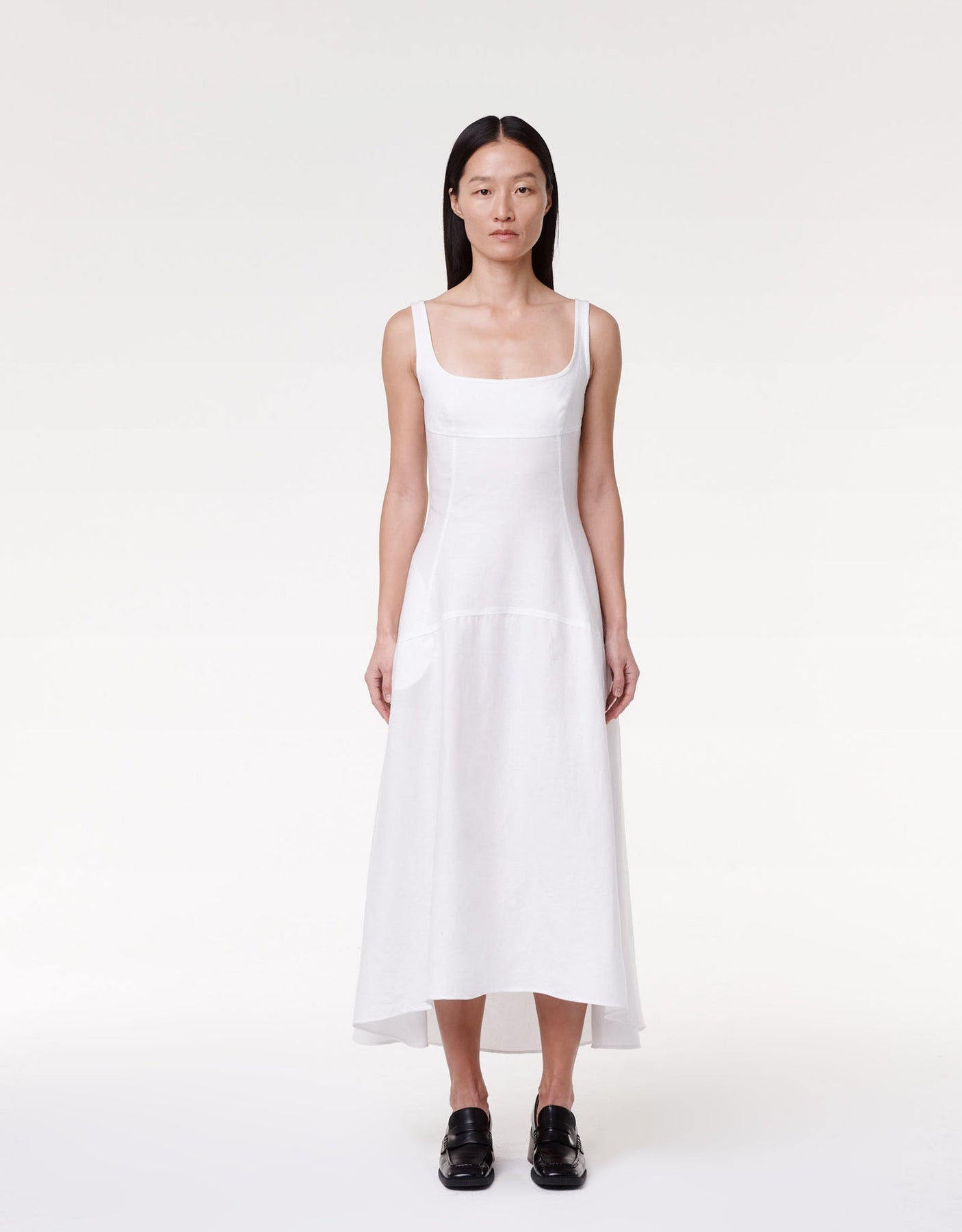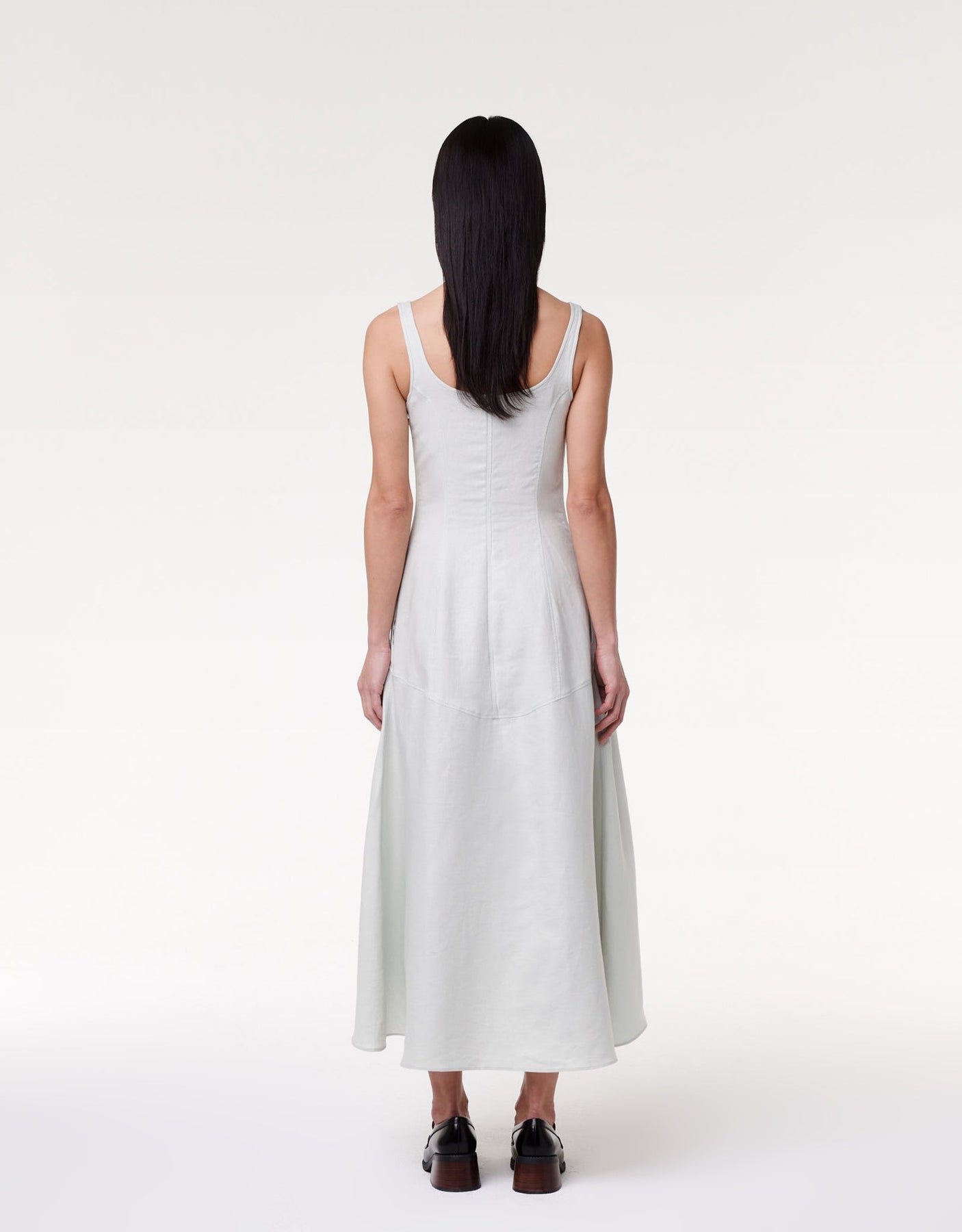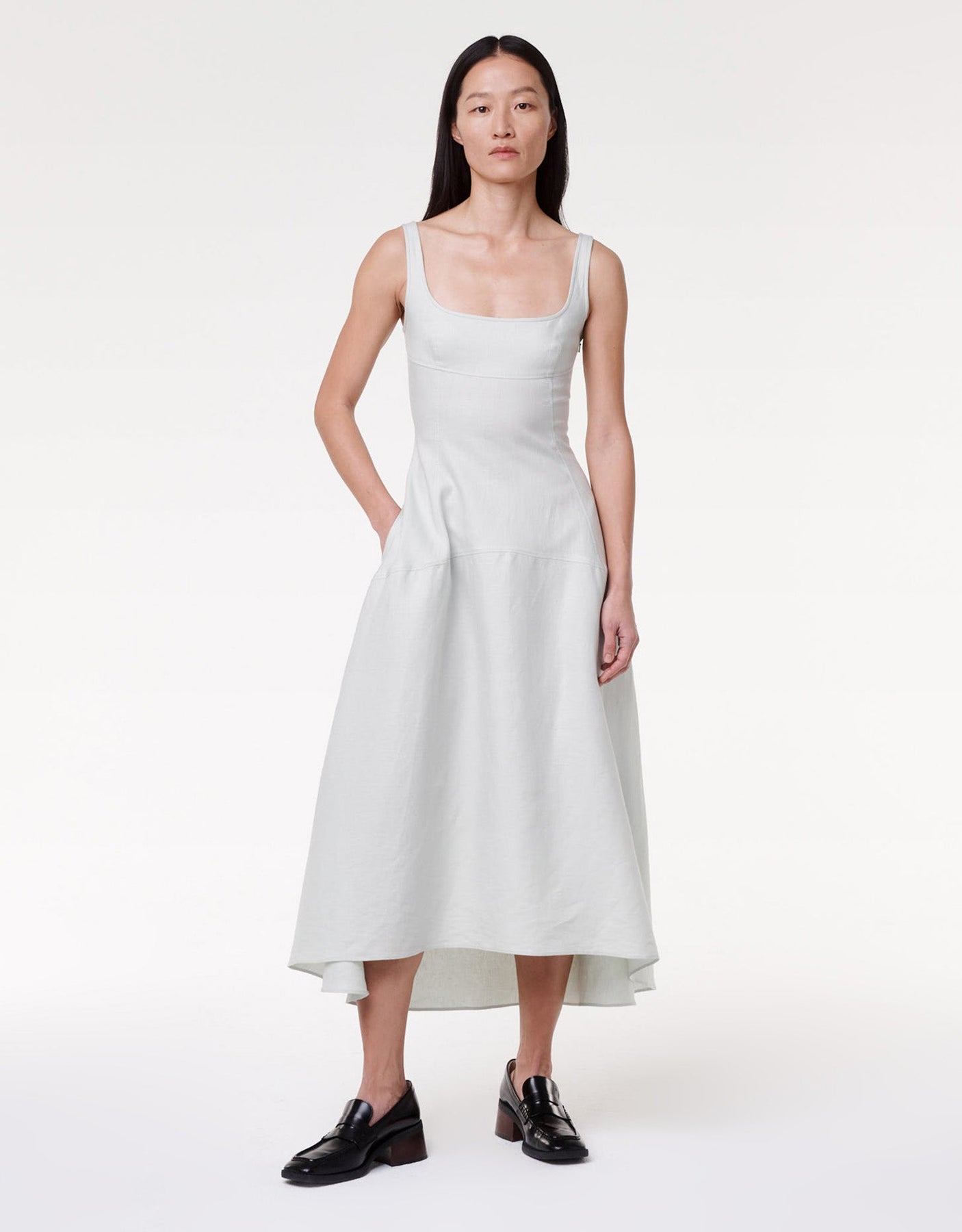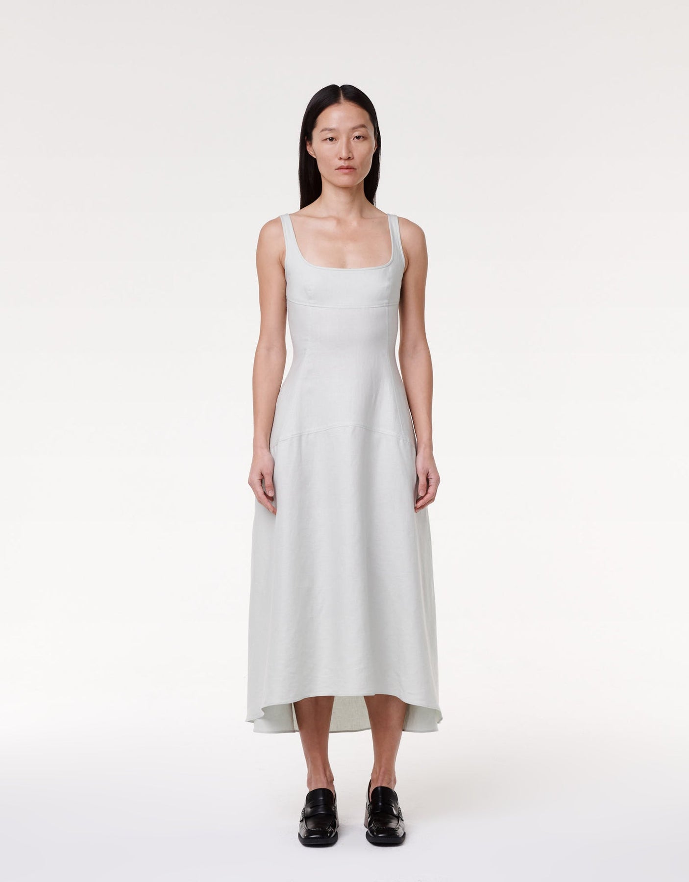 Contrasting the structured romanticism of a bodice fit with the relaxed feel of organic linen, this ankle length dress stands on its own or serves as a breathable base for further layering. The dress is fastened with an invisible zipper along the side seam and a hook and eye closure at the edge. The soft natural wrinkle is a hallmark of linen, which does not need be steamed.