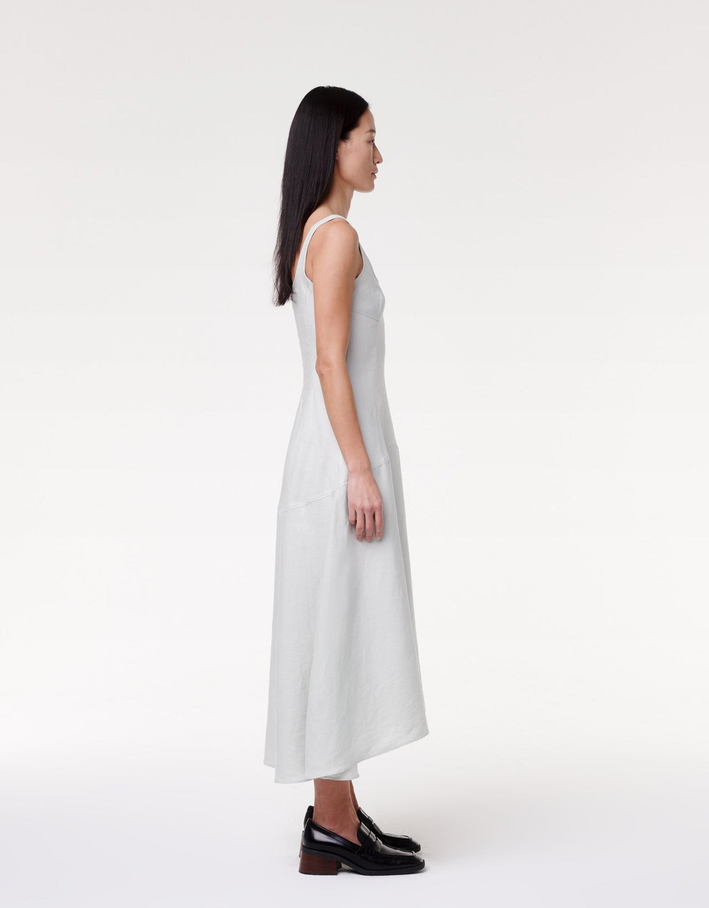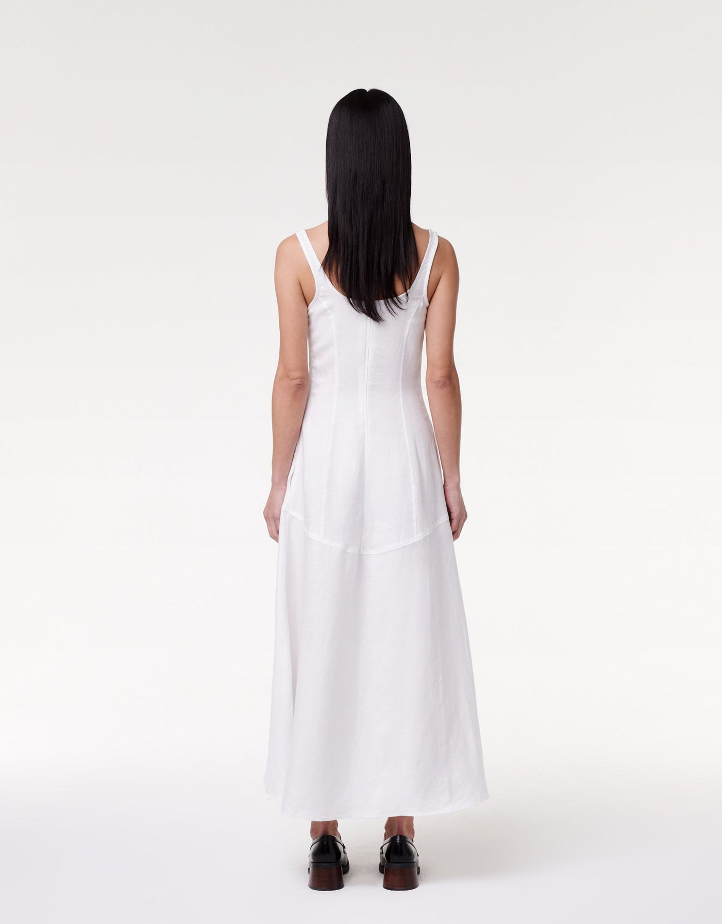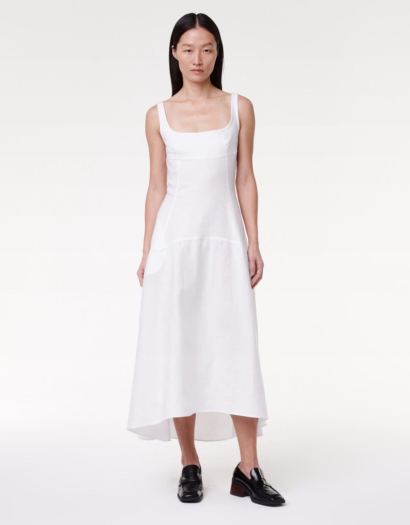 Contrasting the structured romanticism of a bodice fit with the relaxed feel of organic linen, this ankle length dress stands on its own or serves as a breathable base for further layering. The dress is fastened with an invisible zipper along the side seam and a hook and eye closure at the edge. The soft natural wrinkle is a hallmark of linen, which does not need be steamed.