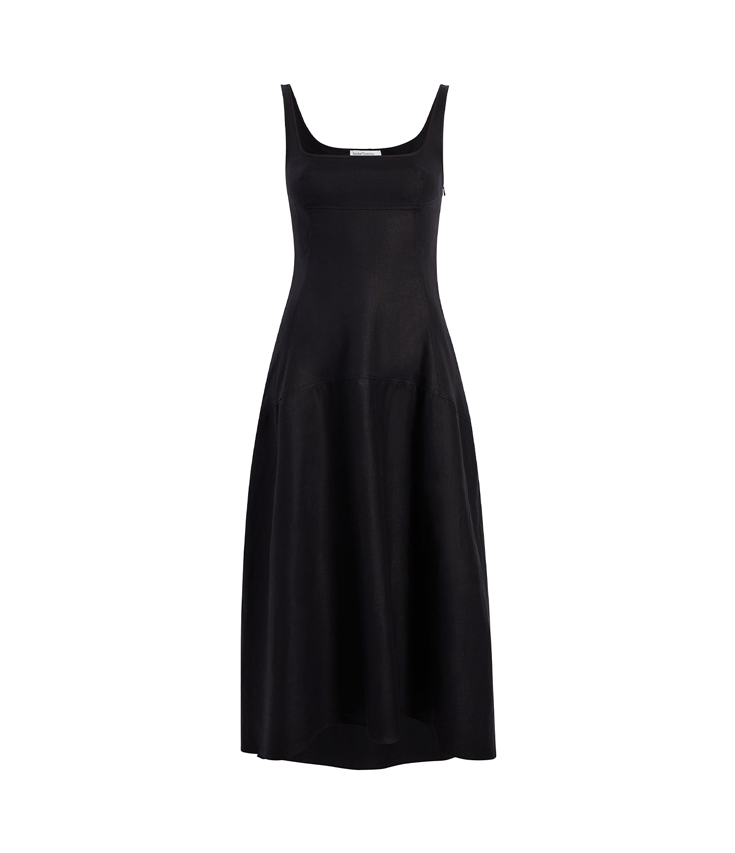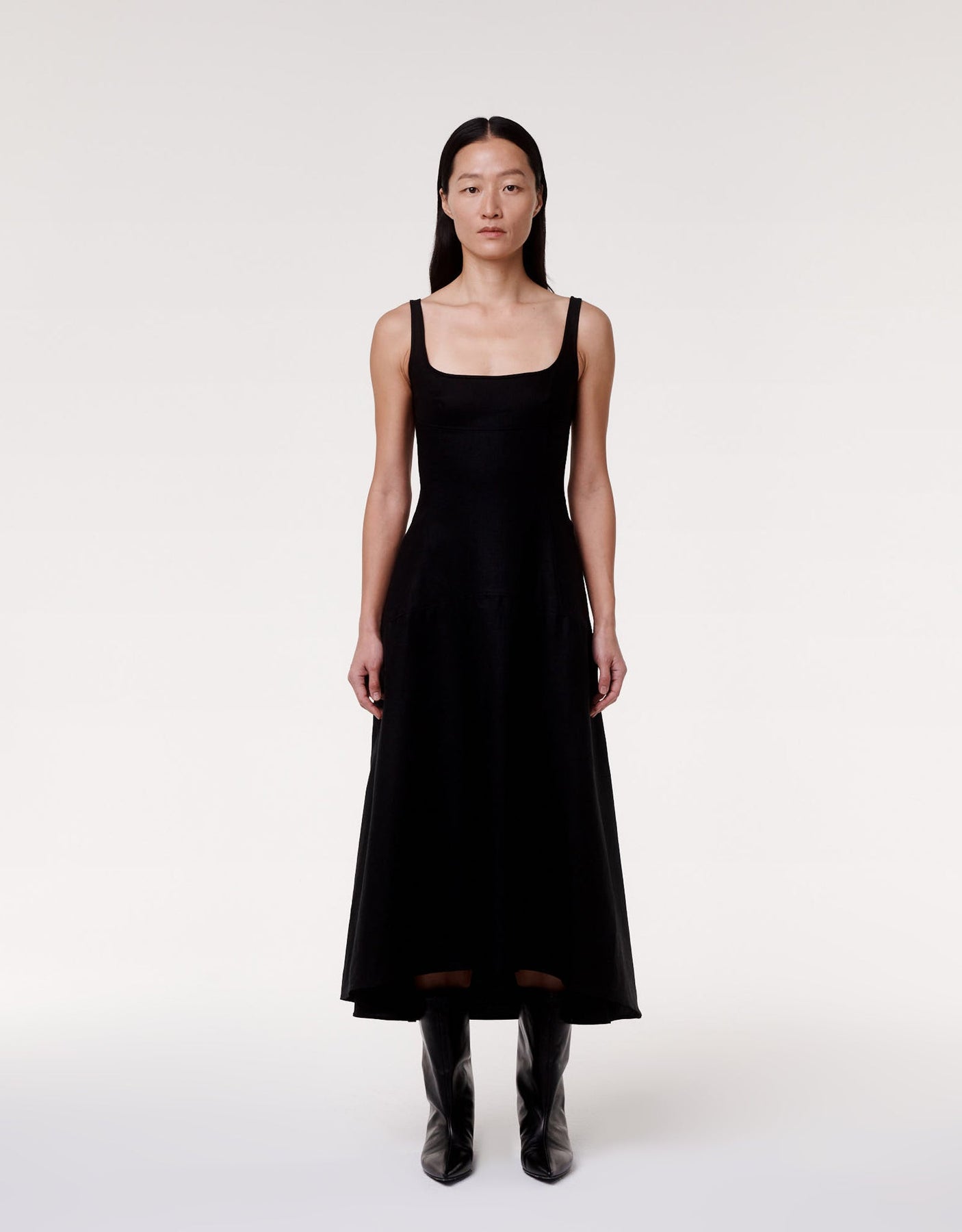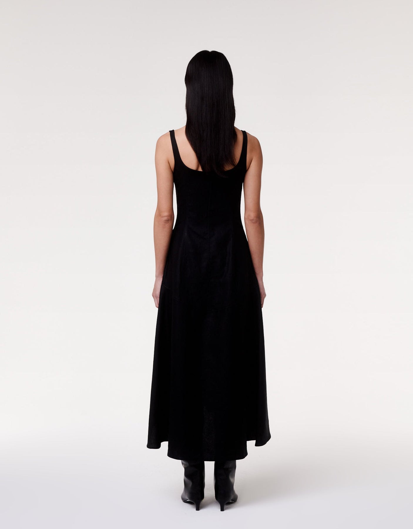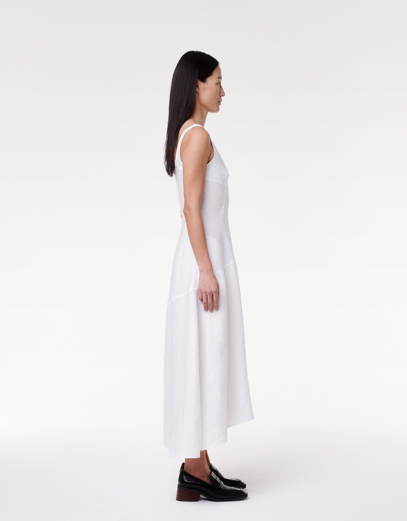 Contrasting the structured romanticism of a bodice fit with the relaxed feel of organic linen, this ankle length dress stands on its own or serves as a breathable base for further layering. The dress is fastened with an invisible zipper along the side seam and a hook and eye closure at the edge. The soft natural wrinkle is a hallmark of linen, which does not need be steamed.