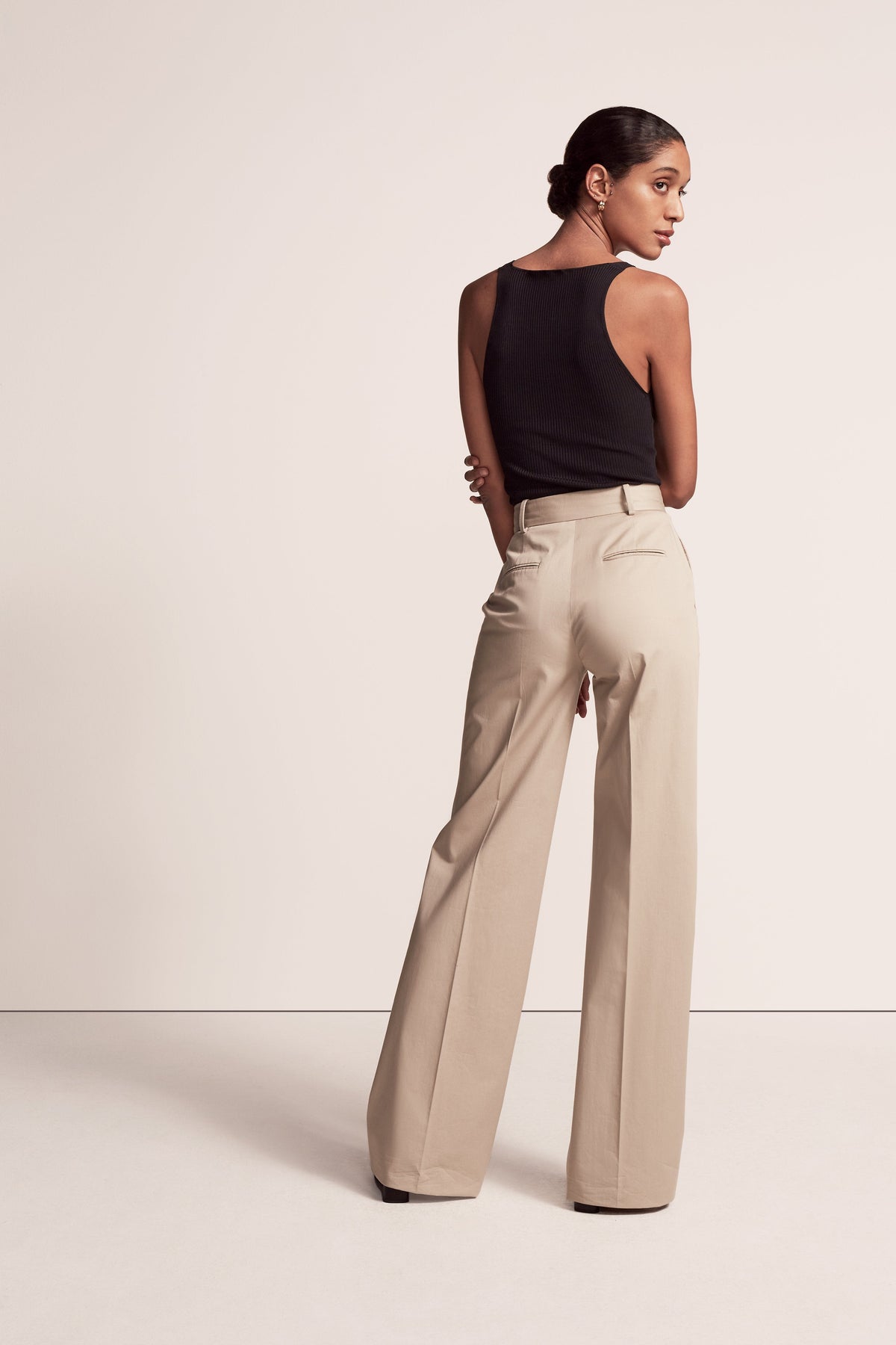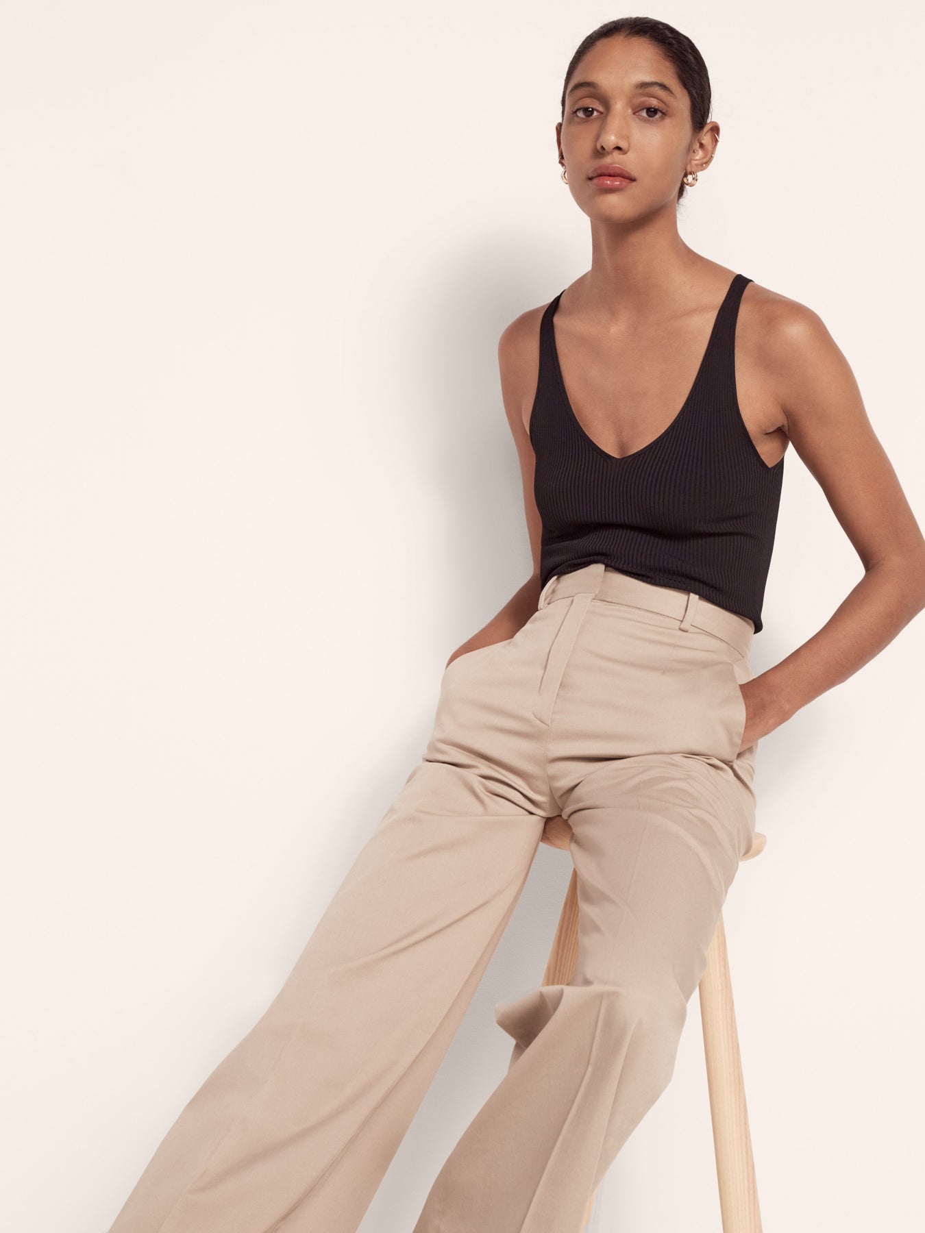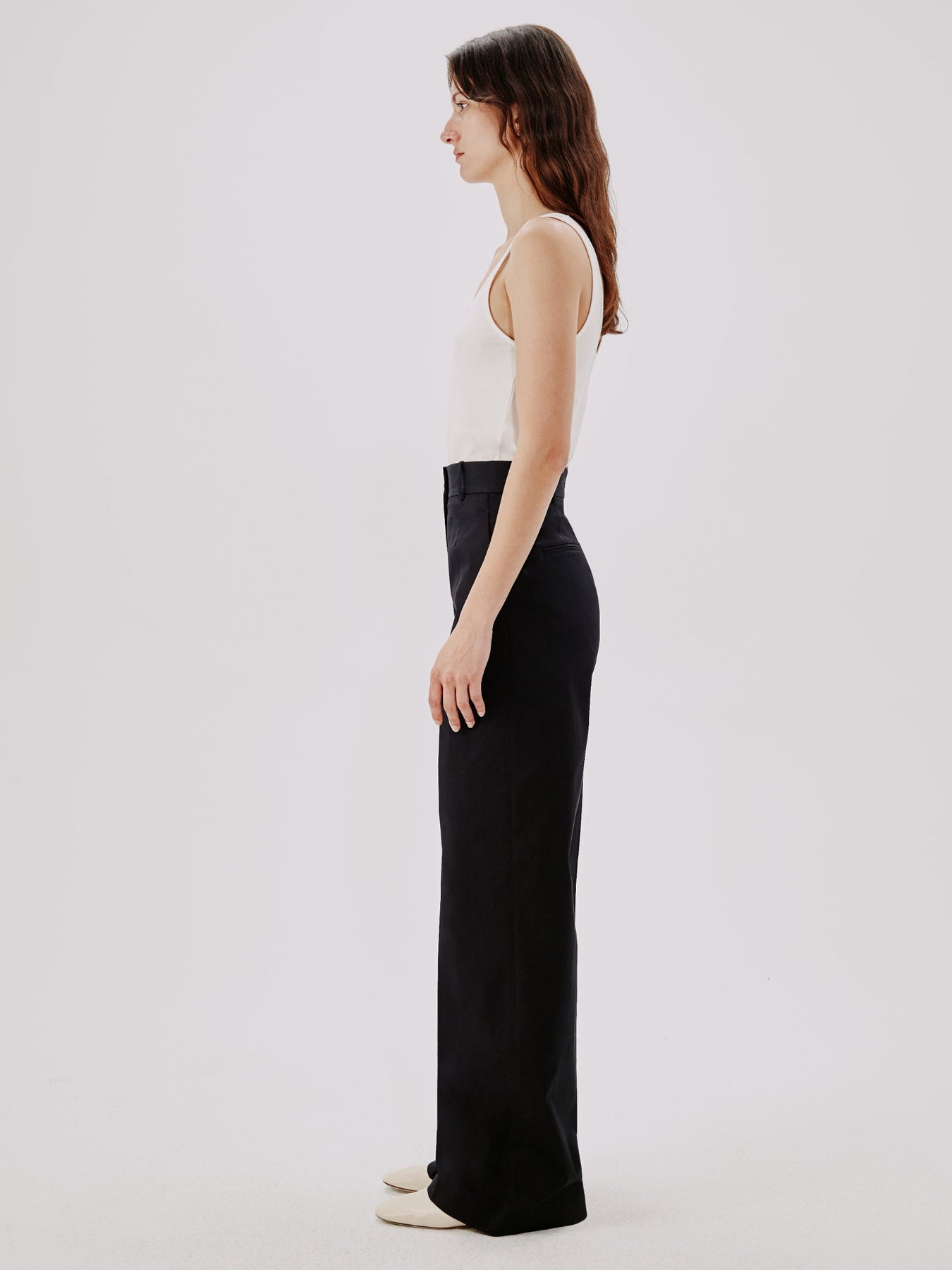 Our iconic Wide Leg Pant joins the classic tailoring lineup as a quintessential modern trouser. This high waisted style sits at the true waist and falls full-length down the leg, elongating the body. Pairing well with the V-Neck for a refined casual look, the style runs small. We recommend sizing up.