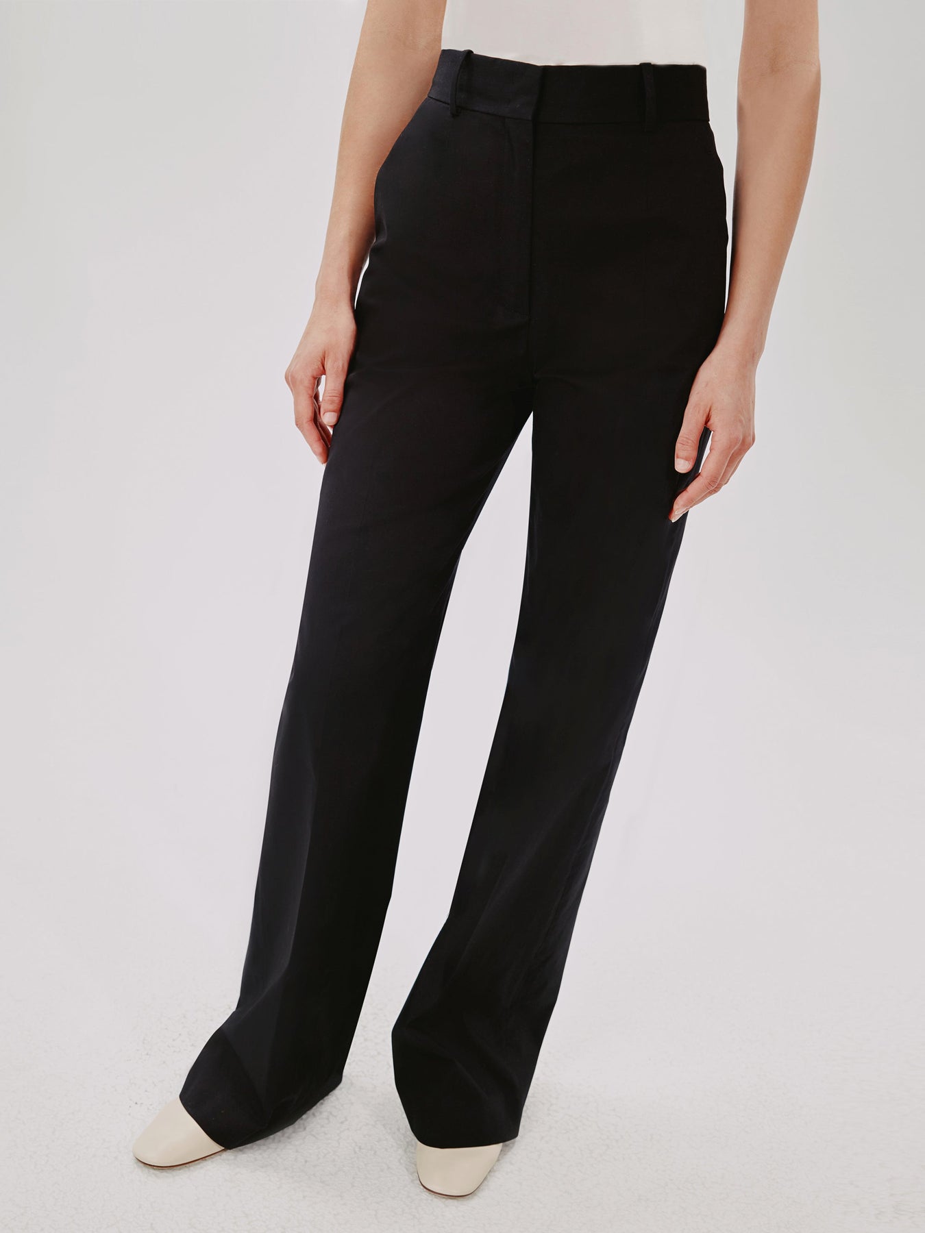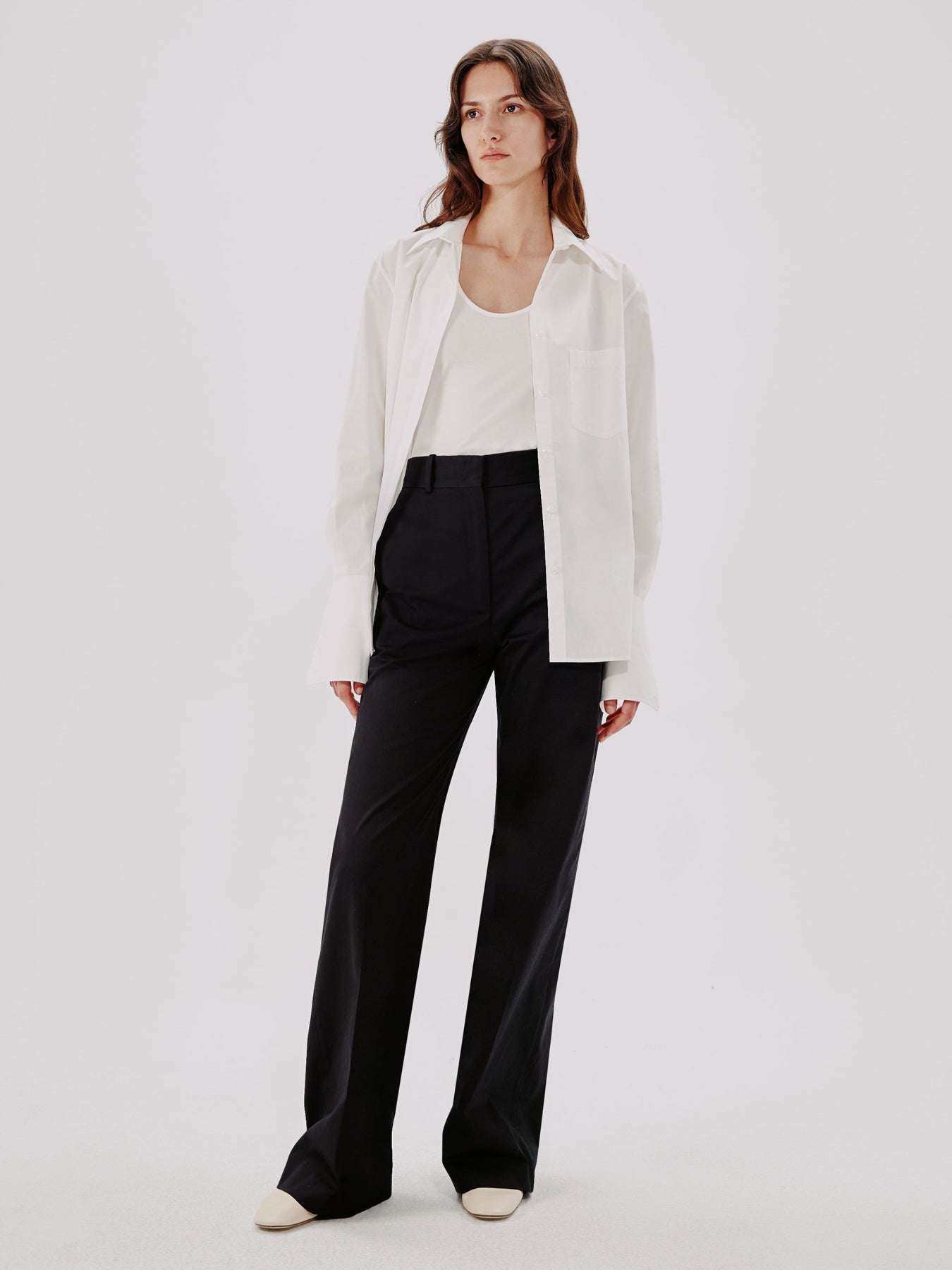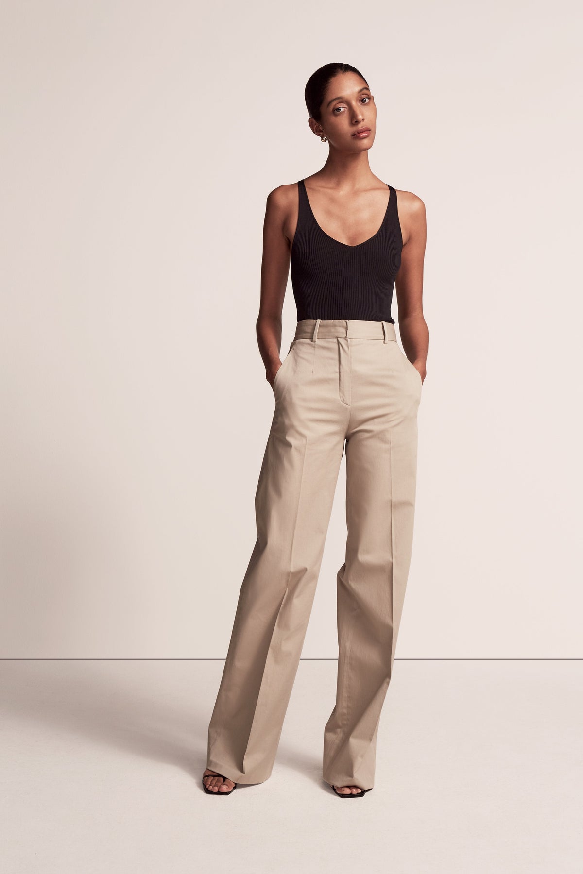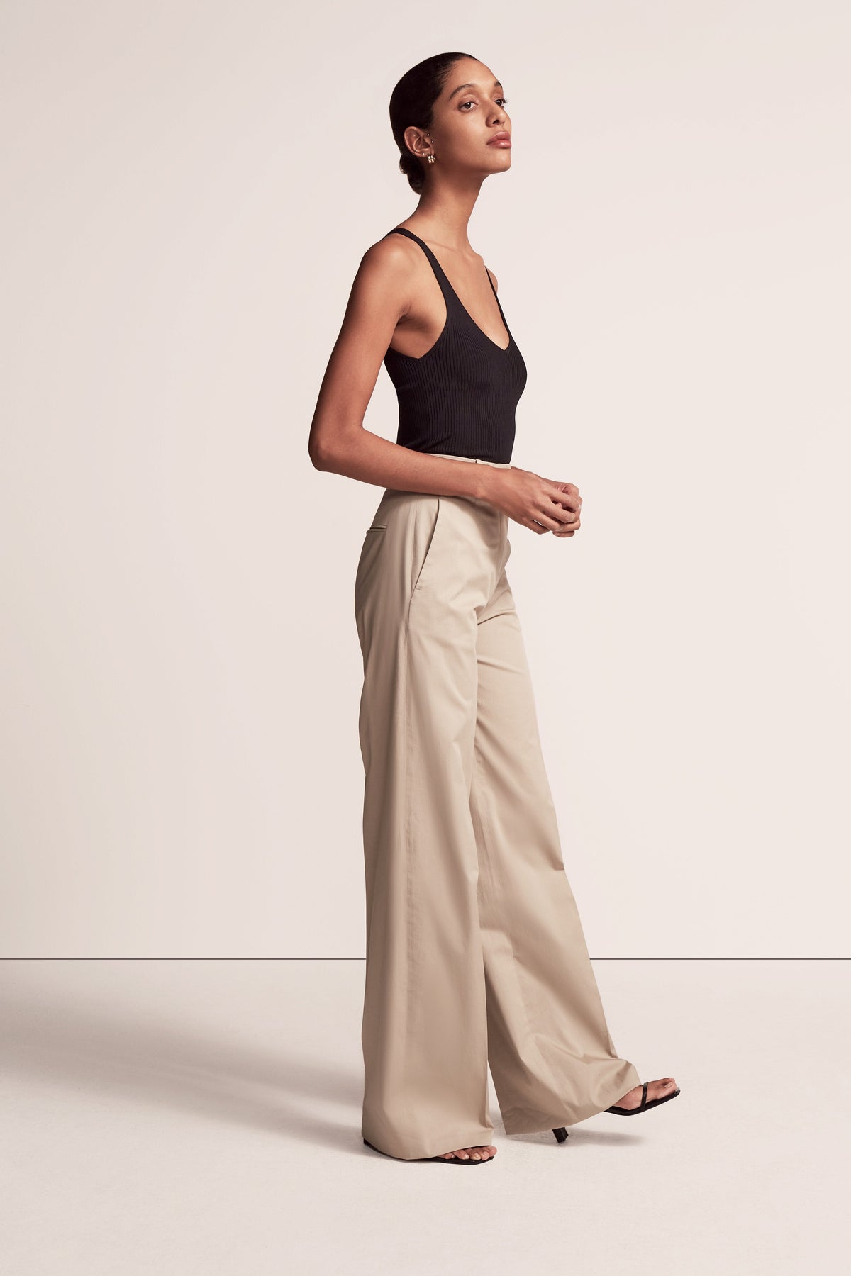 Our iconic Wide Leg Pant joins the classic tailoring lineup as a quintessential modern trouser. This high waisted style sits at the true waist and falls full-length down the leg, elongating the body. Pairing well with the V-Neck for a refined casual look, the style runs small. We recommend sizing up.